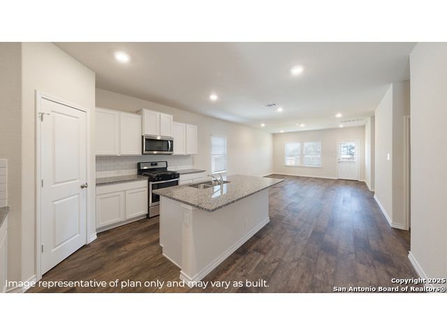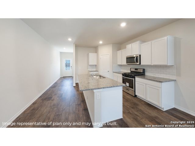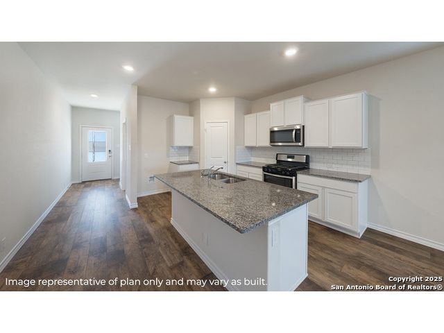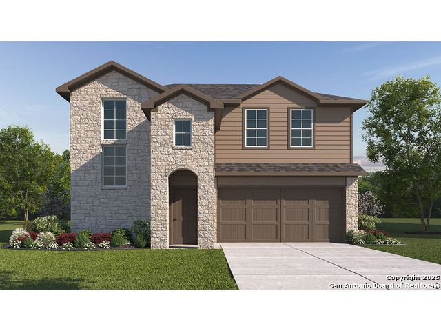 Designed for comfort, flexibility and fun, The Kendall floor plan at Brookstone Creek in San Antonio, TX offers a spacious 2161 square feet of thoughtfully arranged living space across two stories. With 4 bedrooms, 2.5 baths and a game room, this layout is ideal for growing families or those who love to entertain. Inside the home, an open-concept kitchen, dining and living area keeps everyone connected. The kitchen is a standout with stainless steel appliances, a gas cooking range, quartz countertops, a farmhouse-style sink, flat panel cabinetry and a classic white subway tile backsplash. A spacious kitchen island adds extra prep space and casual seating. The primary suite is conveniently located on the main level, providing a private retreat complete with a walk-in shower, dual vanity sinks, and a large walk-in closet. Upstairs, all secondary bedrooms are tucked away for quiet living and feature carpet flooring, large windows, and ample closets. A versatile upstairs game room offers the perfect spot for movie nights, play space or a home office setup. This home includes our HOME IS CONNECTED base package. Using one central hub that talks to all the devices in your home, you can control the lights, thermostat and locks, all from your cellular device. Additional features include a covered back patio (per plan), vinyl plank flooring in the main living areas, full yard landscaping with irrigation and a pre-plumbed water softener loop.