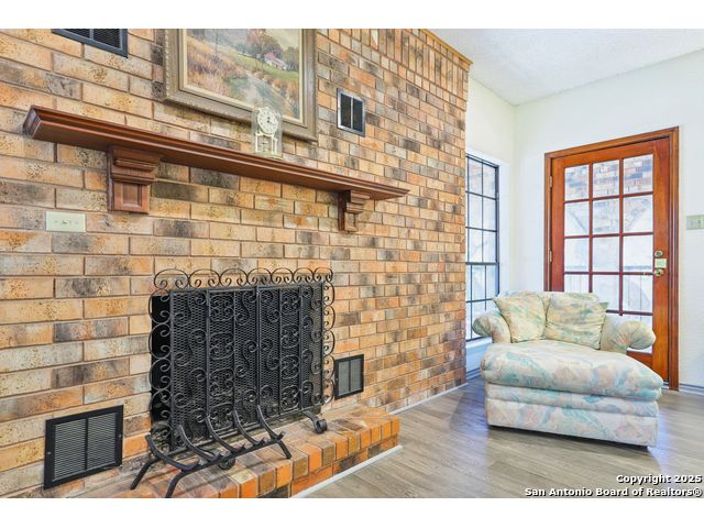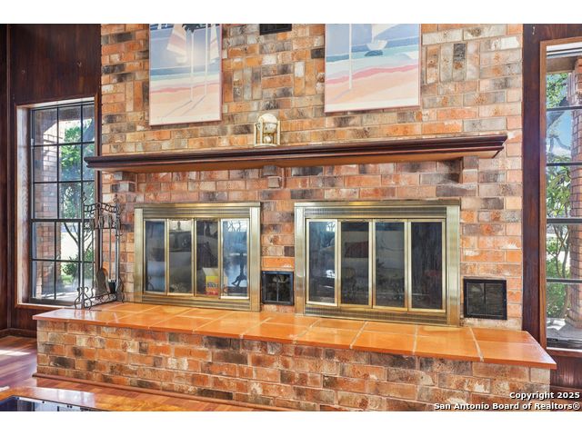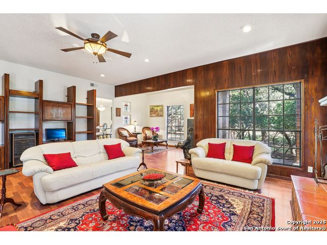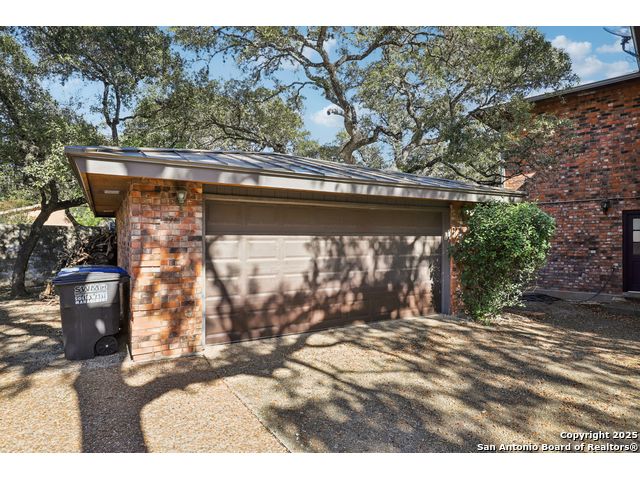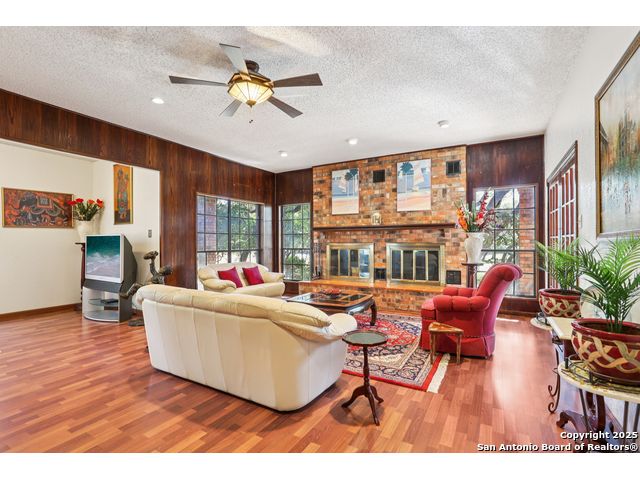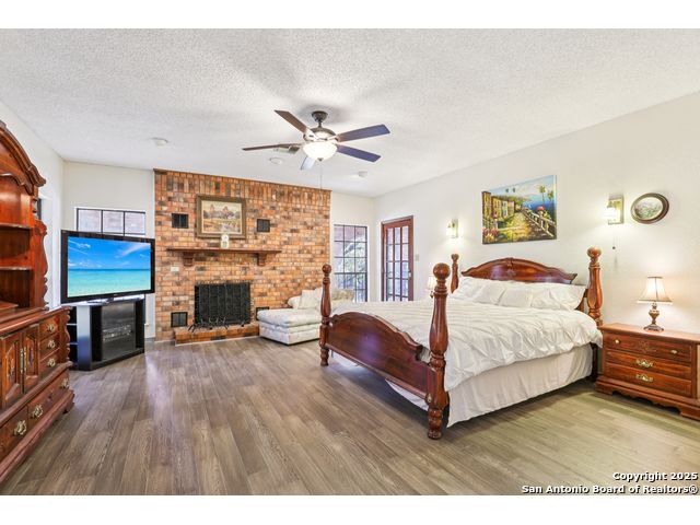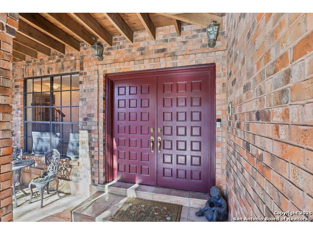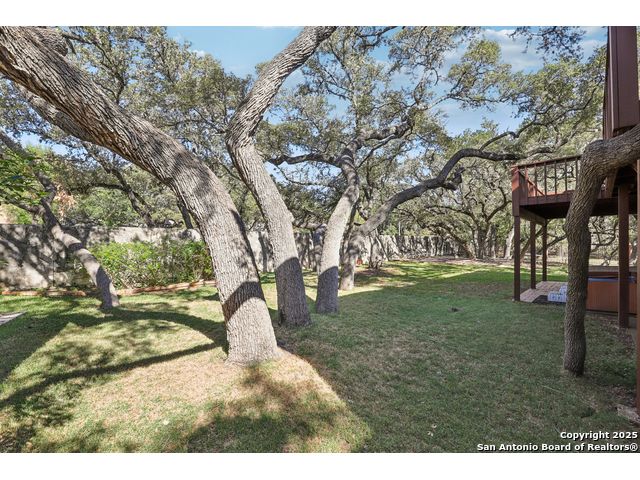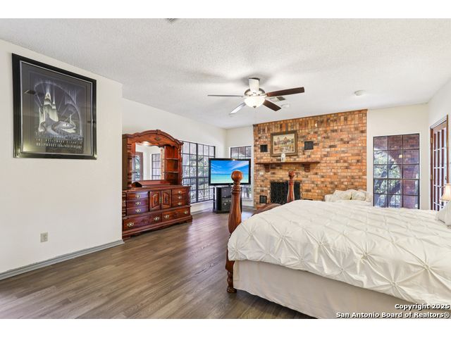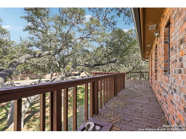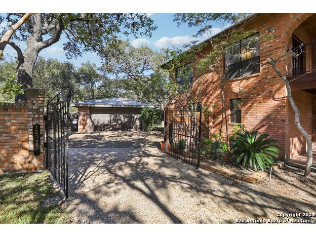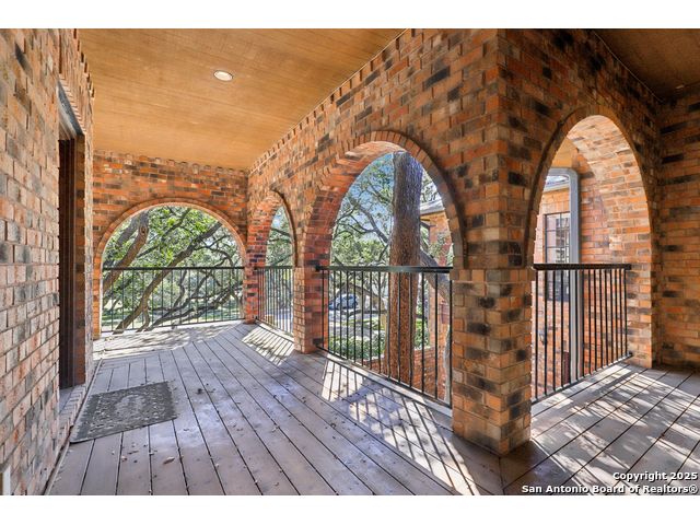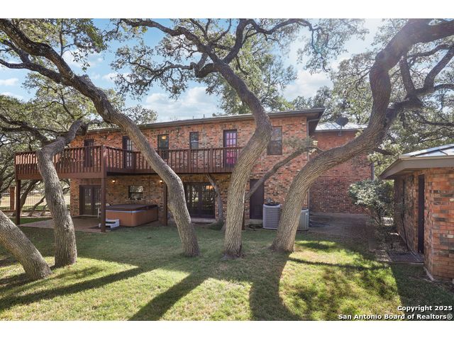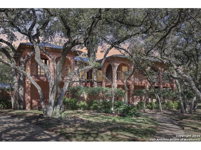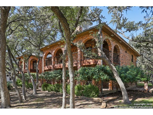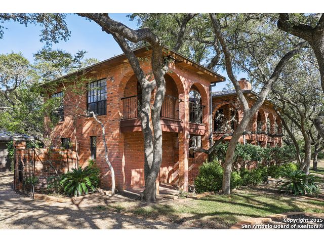 Nestled within the prestigious guard-gated enclave of Elm Creek, 12727 Old Wick delivers 3,698 sq. ft. of elegant living across an expansive .4-acre estate richly shaded by majestic live oaks and enveloped by a rare greenbelt view to the right and rear-ensuring unmatched privacy and serenity. Constructed in 1980 and crowned by a durable metal roof, this architectural residence presents two primary-suite options: the main upstairs wing with its own fireplace and then a downstairs suite that has an additional private access to backyard-ideal for guests, multigenerational living or a refined mother-in-law retreat. Upstairs you'll find three additional bedrooms. The fifth bedroom is currently being used as a flexible loft/game room, while downstairs features the heart of the home: a formal dining room, gourmet kitchen with breakfast bar and island, and gracious living areas anchored by two custom brick fireplaces - one wood burning and the other gas. The wrap-around porches on both levels invite alfresco gatherings under the dappled shade of old-world oaks, while the backyard oasis showcases a large covered patio, a well maintained hot tub and a sweeping lawn framed by masonry walls-evoking the feel of a private park. A detached two-car garage with secured gate access adds discretion and convenience. As a resident of Elm Creek, you'll enjoy access to a resort-style amenity center with pool, walking trails, playground, tennis and basketball courts-balancing serene sophistication with vibrant community lifestyle. This home marries timeless craftsmanship with a coveted location and is one of the finest finds in San Antonio's luxury market. Located minutes from the Alon Center, Medical Center, VA Hospital, the JCC, Grocery stores, restaurants and shopping. Easy access to Wurzbach Pkwy, Loop 1604, Loop 410 and I-10!