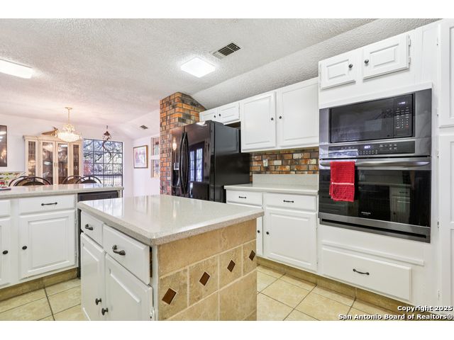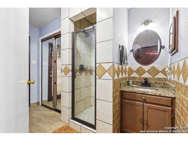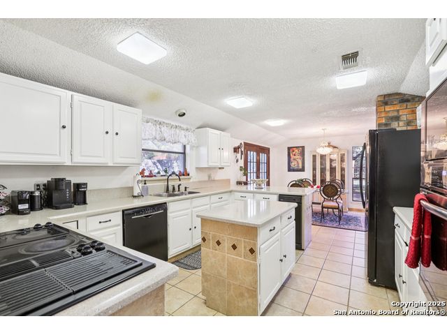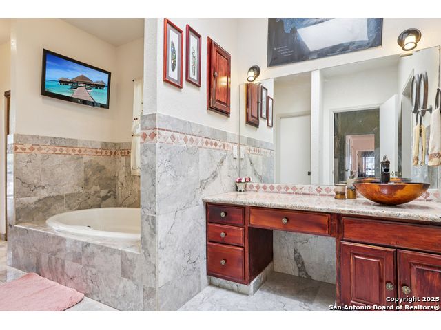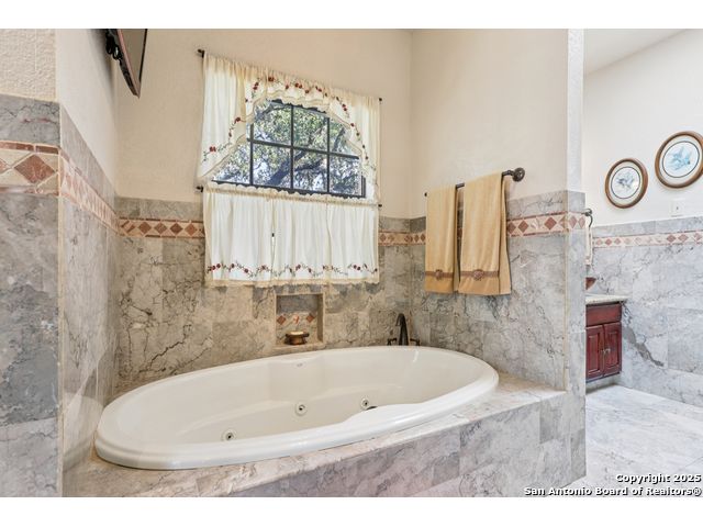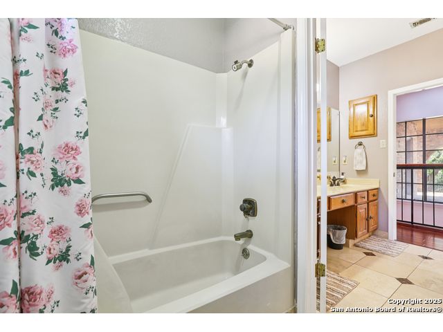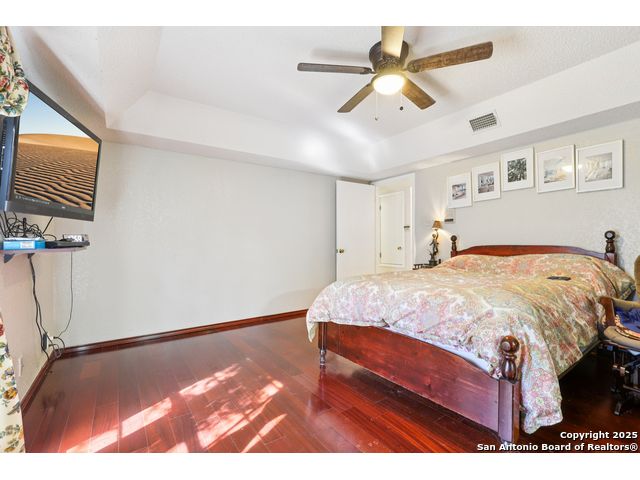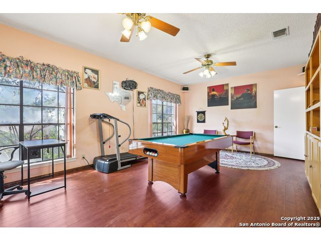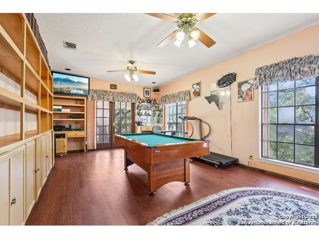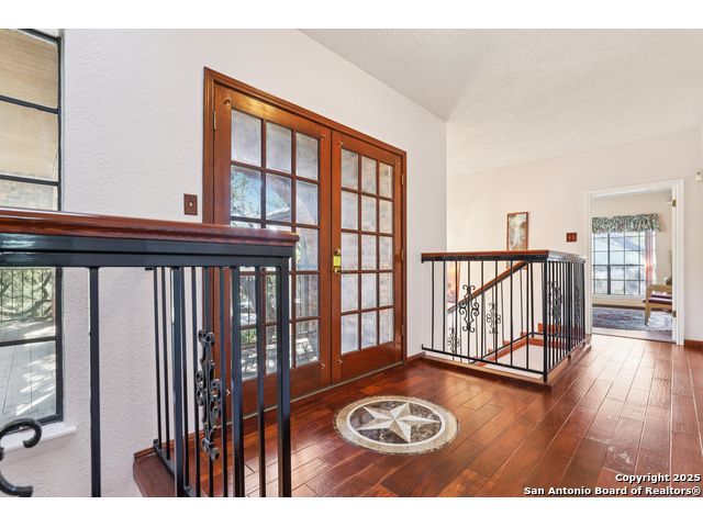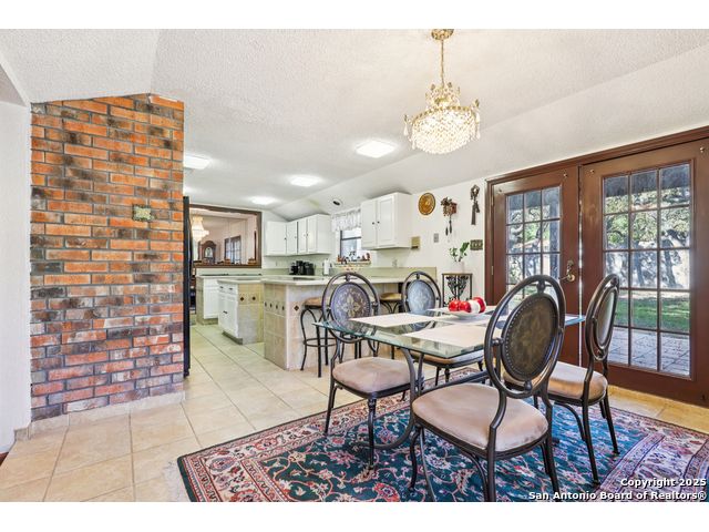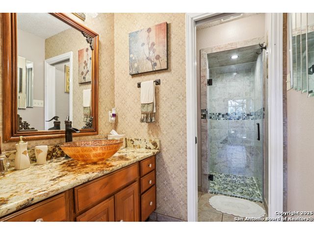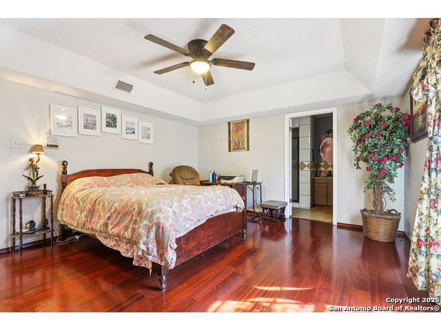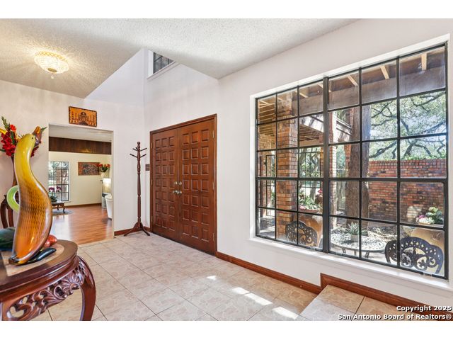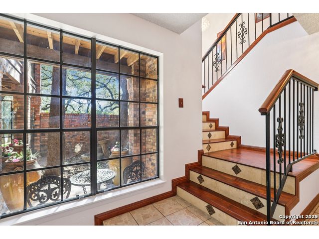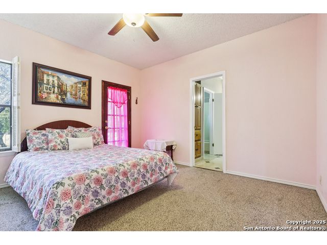 Nestled within the prestigious guard-gated enclave of Elm Creek, 12727 Old Wick delivers 3,698 sq. ft. of elegant living across an expansive .4-acre estate richly shaded by majestic live oaks and enveloped by a rare greenbelt view to the right and rear-ensuring unmatched privacy and serenity. Constructed in 1980 and crowned by a durable metal roof, this architectural residence presents two primary-suite options: the main upstairs wing with its own fireplace and then a downstairs suite that has an additional private access to backyard-ideal for guests, multigenerational living or a refined mother-in-law retreat. Upstairs you'll find three additional bedrooms. The fifth bedroom is currently being used as a flexible loft/game room, while downstairs features the heart of the home: a formal dining room, gourmet kitchen with breakfast bar and island, and gracious living areas anchored by two custom brick fireplaces - one wood burning and the other gas. The wrap-around porches on both levels invite alfresco gatherings under the dappled shade of old-world oaks, while the backyard oasis showcases a large covered patio, a well maintained hot tub and a sweeping lawn framed by masonry walls-evoking the feel of a private park. A detached two-car garage with secured gate access adds discretion and convenience. As a resident of Elm Creek, you'll enjoy access to a resort-style amenity center with pool, walking trails, playground, tennis and basketball courts-balancing serene sophistication with vibrant community lifestyle. This home marries timeless craftsmanship with a coveted location and is one of the finest finds in San Antonio's luxury market. Located minutes from the Alon Center, Medical Center, VA Hospital, the JCC, Grocery stores, restaurants and shopping. Easy access to Wurzbach Pkwy, Loop 1604, Loop 410 and I-10!