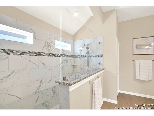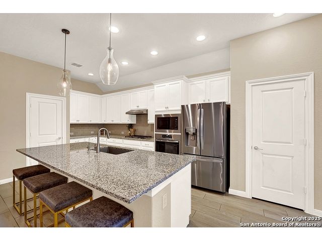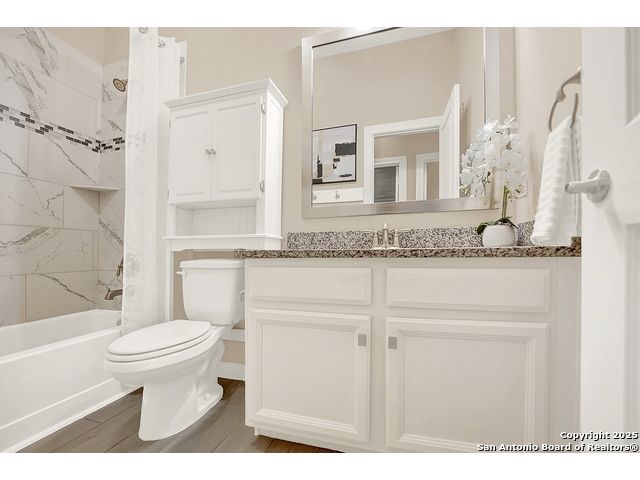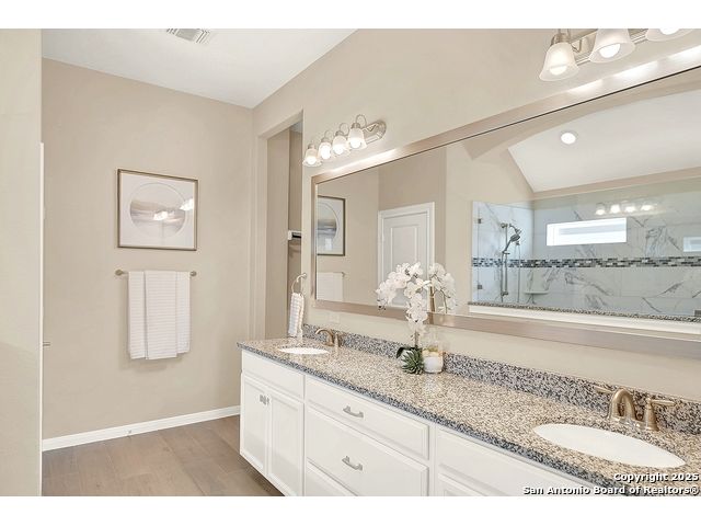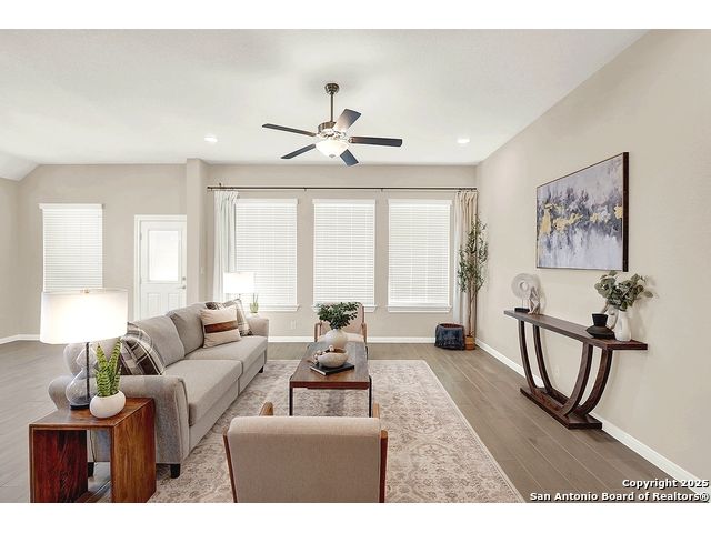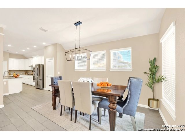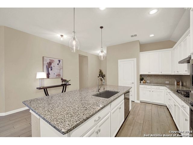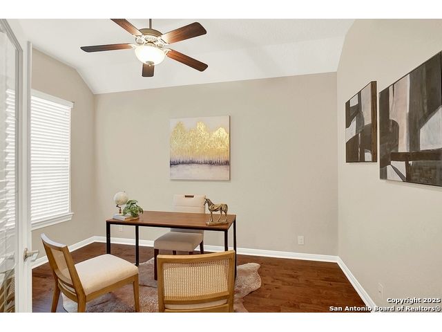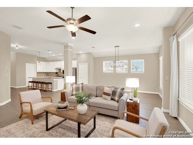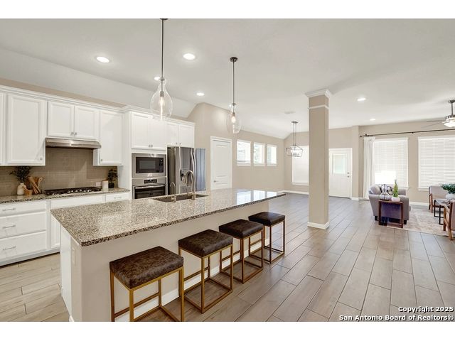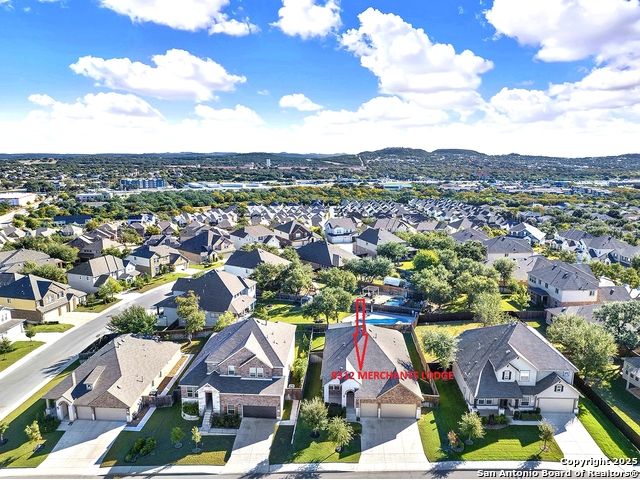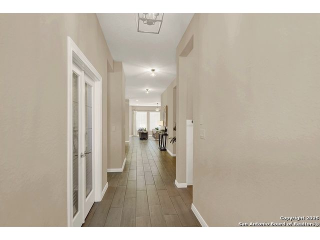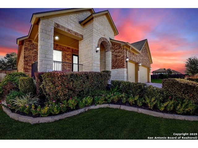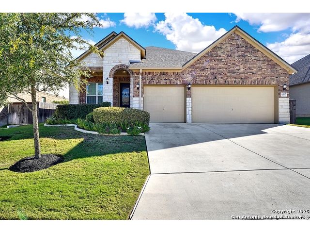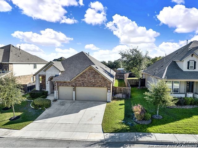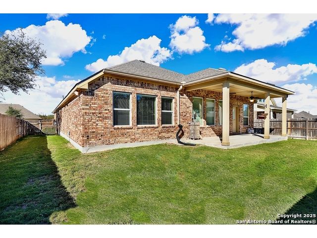 Single Story, 3 bedrooms plus a study that can be converted into a fourth bedroom, 2 full baths, and a 3-car garage across 2,255 square feet of thoughtfully designed living space. Welcome to 8312 Merchants Lodge, a meticulously maintained David Weekley Home built in 2018 that feels brand new. Located within the gated community of The Heights of Two Creeks, this home combines privacy, security, and convenience. Residents enjoy access to jogging and walking trails, a resort-style community pool, clubhouse, and sports center, creating an ideal setting for both recreation and relaxation. The location is truly unbeatable, just 2 minutes from I-10 and 10 minutes from Loop 1604, offering quick commutes to major employers, downtown San Antonio, and the Texas Hill Country. Everyday conveniences and entertainment are only minutes away, with The Rim Shopping Center just 8 minutes out and The Shops at La Cantera about 10 minutes away. Enjoy premier dining, shopping, and entertainment including popular spots like Bob's Steak & Chop House, The Rustic, and Signature, Inspired by Chefs, all within easy reach. Inside, you'll find high ceilings, abundant natural light, and an open-concept layout perfect for modern living. The spacious kitchen features granite countertops, a large island with bar seating, gas cooking, and plenty of storage, opening seamlessly to the dining and living areas. The primary suite offers an oversized walk-in closet, large walk-in shower, and double vanity. Each secondary bedroom includes its own walk-in closet, and there is a large coat closet near the entry for added convenience. Finishes include ceramic tile in wet areas, hardwood flooring in all bedrooms, faux wood blinds throughout, and a stone-and-brick exterior that enhances curb appeal. The covered patio with ceiling fans overlooks beautifully maintained landscaping, providing the perfect space for outdoor entertaining. The roof is just six years old, and the home's energy-efficient construction adds to its lasting value. This property offers the perfect blend of comfort, convenience, and community in one of San Antonio's most desirable neighborhoods, an ideal retreat for those seeking luxury living with everyday practicality.