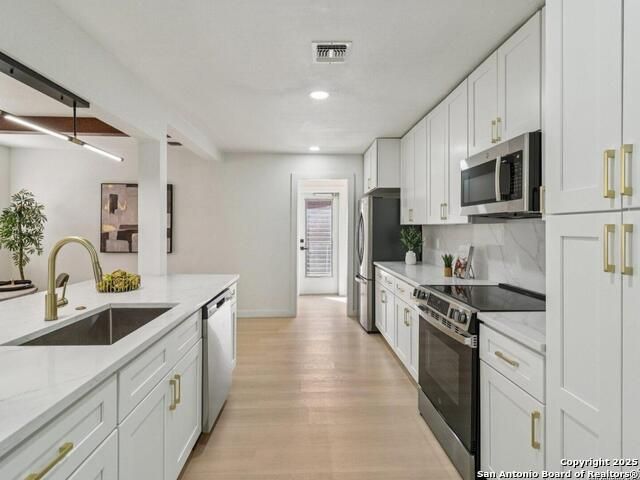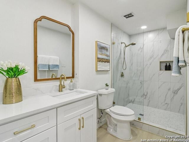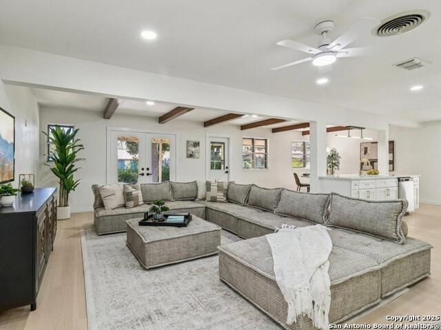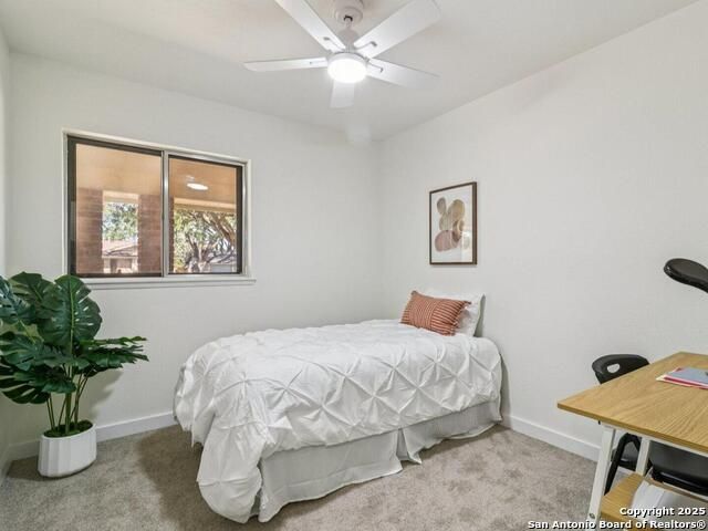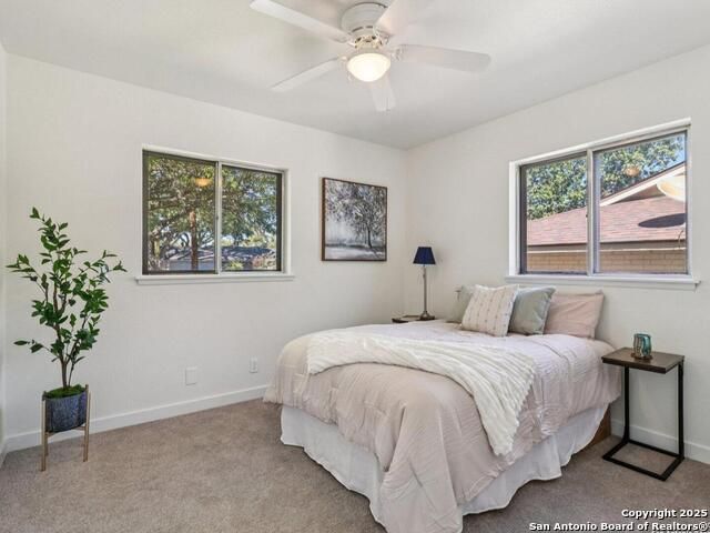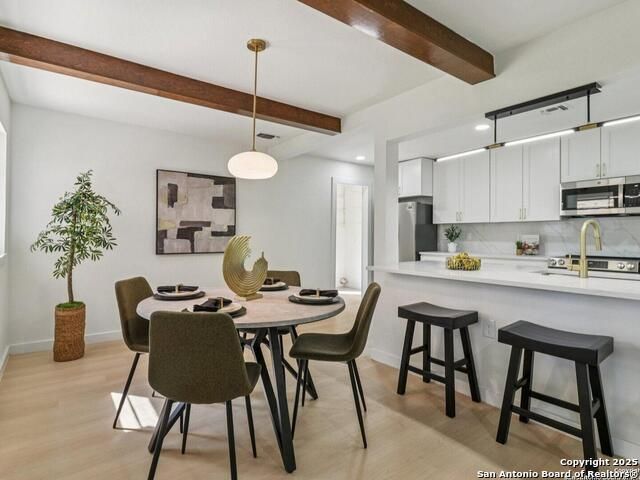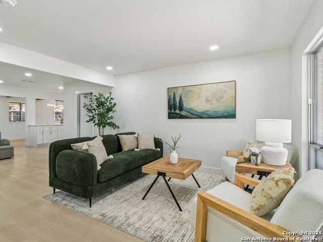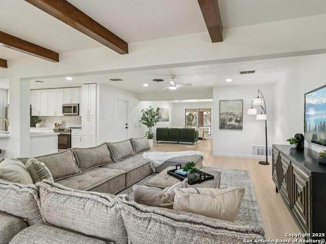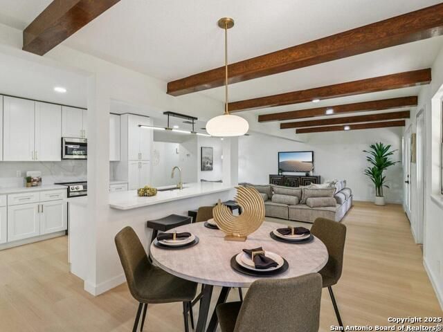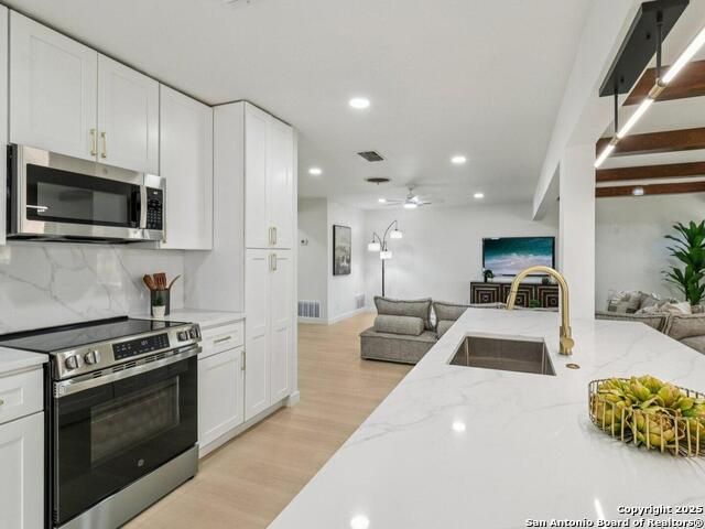 Experience mid-century charm reimagined for modern living at 3226 Colony Drive in San Antonio's desirable Colonies North neighborhood. From the street, this single-story ranch-style home retains its timeless character, but step inside and you'll find a completely modern transformation designed for today's lifestyle. Every detail has been thoughtfully updated - including all-new interior and exterior paint, luxury vinyl plank flooring, a fully reimagined kitchen, and spa-inspired bathrooms. The kitchen showcases quartz countertops, stainless steel appliances, custom cabinetry, and a spacious island perfect for entertaining. Both bathrooms feature stylish tilework, designer lighting, and premium fixtures for a polished, high-end feel. The home sits on a large, tree-shaded lot with a huge covered patio, offering plenty of outdoor space for relaxation or gatherings. Colonies North is known for its welcoming community vibe, walkable streets, and unbeatable central location - just minutes from the Medical Center, USAA, UTSA, La Cantera, and Huebner Oaks. Combining vintage charm with modern sophistication, 3226 Colony Drive is truly move-in ready and represents the best of San Antonio living in a well-established, convenient neighborhood.