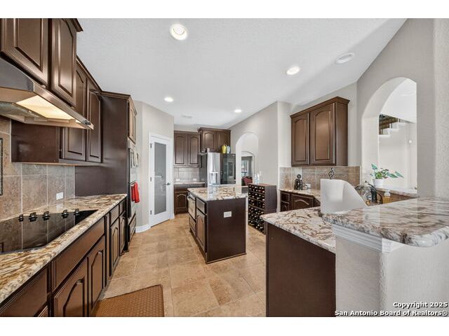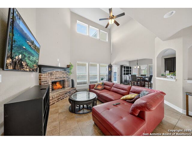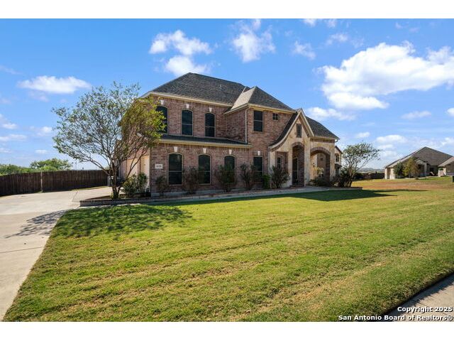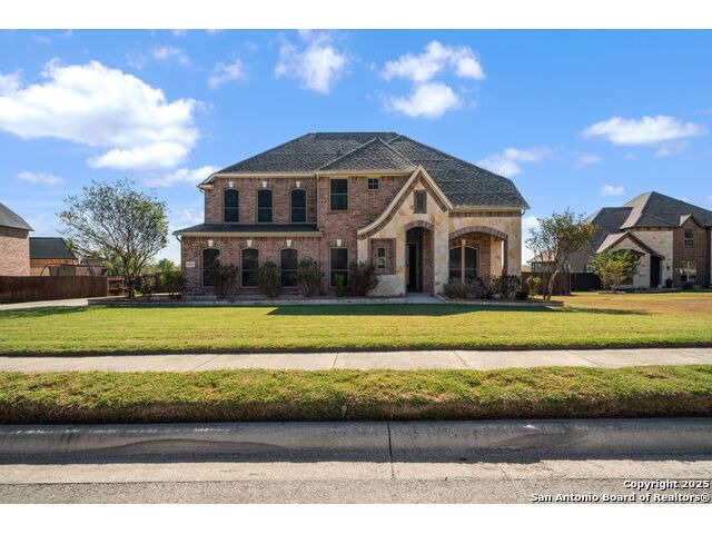 Sitting on a premium 0.55-acre lot, this impressive 4-bedroom, 3.5-bath, 3-car garage home offers space, style, and comfort. A beautifully landscaped exterior leads to a grand entry with a formal dining room, private study, and elegant spiral staircase. The living area features ceramic tile flooring, soaring two-story ceilings, and a brick fireplace. The gourmet kitchen is equipped with built-in stainless steel appliances, double ovens, granite countertops, and rich espresso cabinetry. Upstairs, you'll find a spacious game room and media room with surround sound-perfect for entertaining. Enjoy outdoor living on the large covered patio and balcony overlooking the nearby pond. This home combines exceptional design, quality finishes, and a serene setting-ready to impress the most discerning buyer.