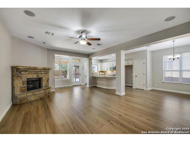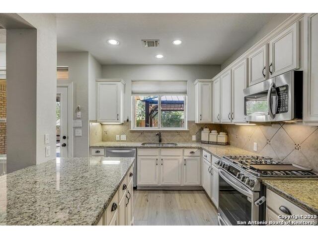 Welcome Home to Comfort and Style Nestled on a peaceful cul-de-sac with greenbelt views, this beautiful 3000+ sq. ft. home is designed for everyday comfort. The home offers thoughtful updates like LVP flooring throughout (2023), fresh interior paint (2023), a bright kitchen featuring granite counters, painted cabinetry, and a new gas stove (2025). A one-of-a-kind walk-in pantry with upgraded cabinetry and granite workspace will keep everything organized. Additional features include a new roof (2021), upgraded dishwasher and 2 A/C units. The spacious primary suite is downstairs, complete with a separate shower and soaking tub, plus a roomy walk-in closet. Upstairs you'll find three additional bedrooms, a loft area, and a full bath, giving everyone their own space to unwind. Outside, enjoy a covered patio and sprawling deck overlooking the greenbelt. The 3-car garage, partial sprinkler system, and front-and-back gutters make maintenance easy, while extras like the intercom system, whole-house water softener/filtration system (2022), and new water heater (2023) show this home has been well-cared for.
