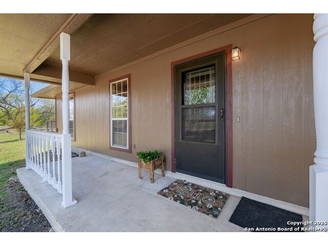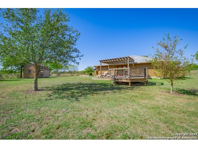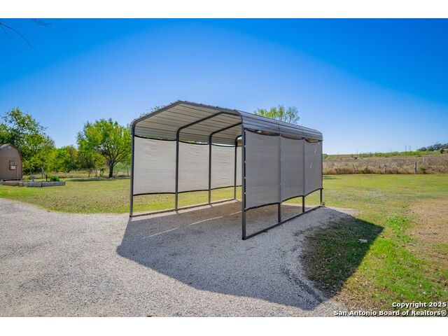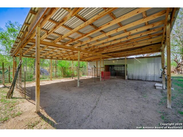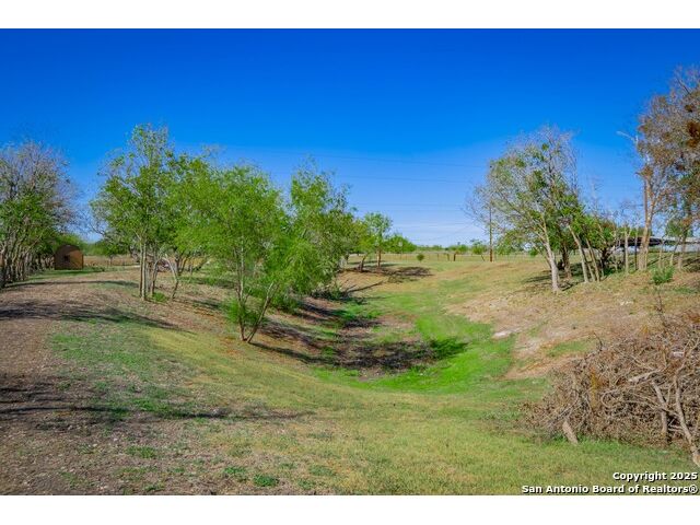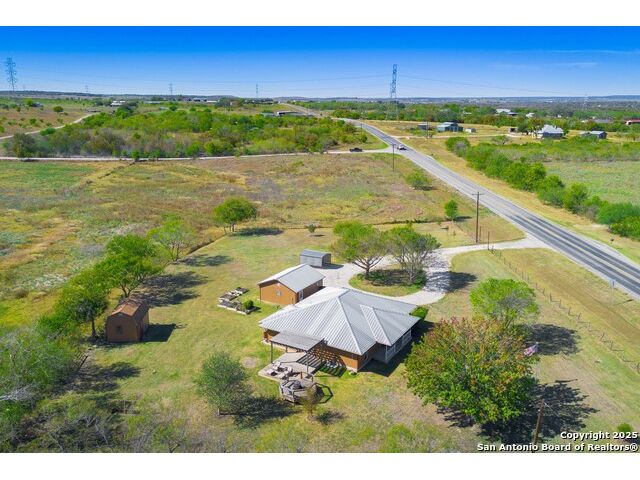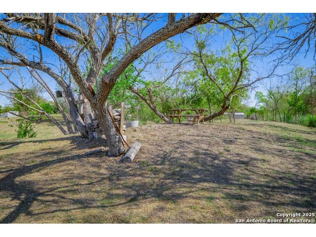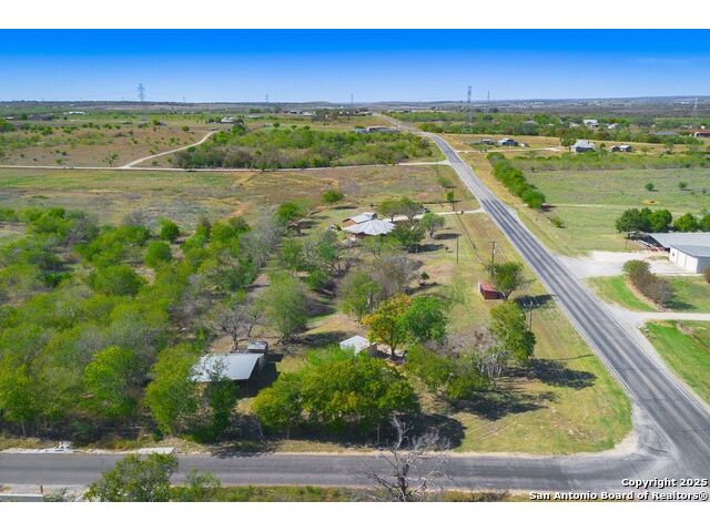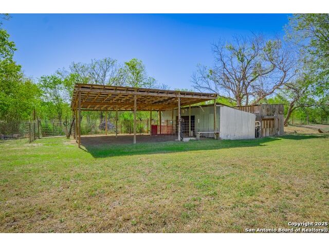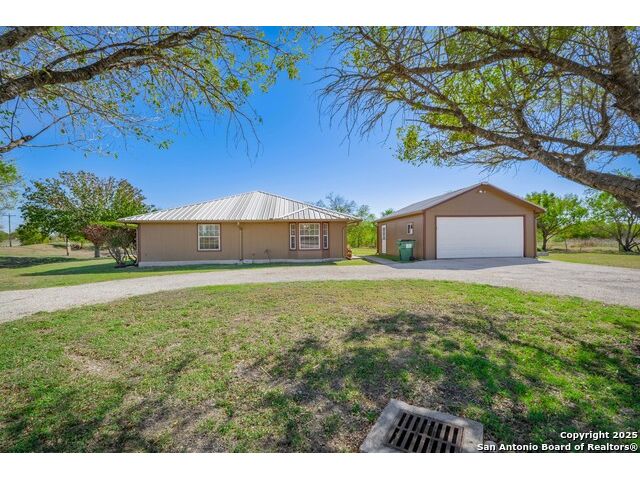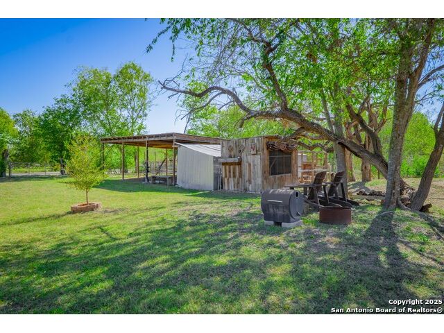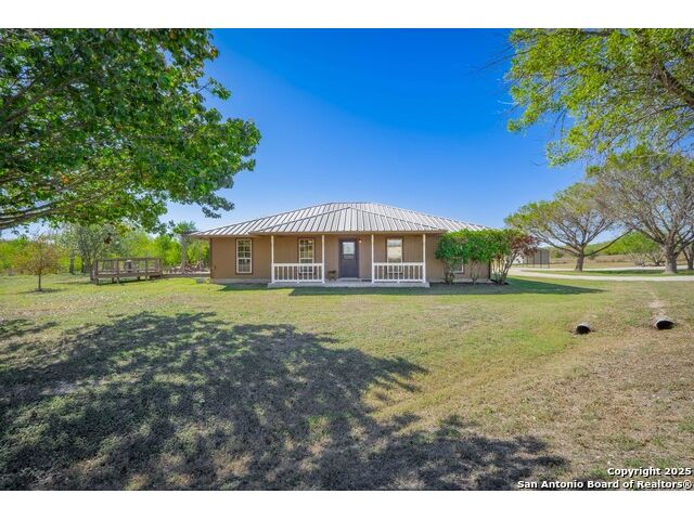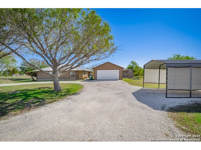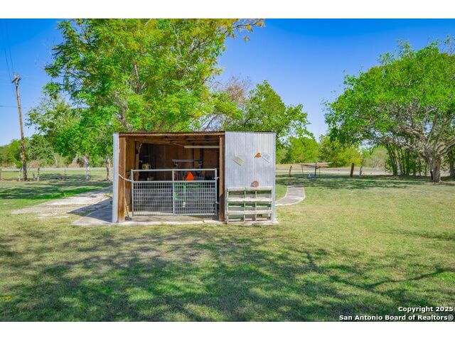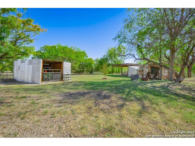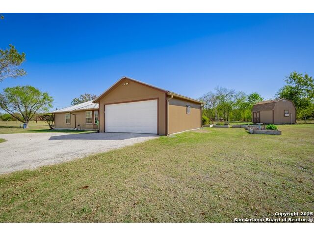 Country living, yet only minutes to New Braunfels, San Marcos and Seguin for shopping and fun! Drive up the circular drive to this one-story large ranch home (1,932 sq. ft.). It's in excellent shape and offers 3 beds and 2 baths sitting on 2.45 acres (per appraiser report). After a long day's work, relax on the (almost) full-length covered front porch. Inside, you'll enjoy preparing meals in the large kitchen open to the dining area. Everything you'd want is here: granite counters, solid wood cabinets, fridge, dishwasher, garbage disposal, oven, microwave, tile flooring and even an eating counter. Enjoy your meals in the dining area looking out over your land through the bay window. The wide-open family area, also with tile flooring, has room for large family gatherings, and you'll stay comfortable with the 2 ceiling fans. Have allergies? Not in this home with wood flooring in all 3 bedrooms and ceiling fans with lights. Wood blinds throughout the home. The two bathrooms are tastefully done with tile flooring and granite counters. Between the bedrooms is a large open area - what you turn it into is up to you...TV area? play area? music area? office? From this open area, go through the door to a large back deck to enjoy your view. Looking for storage? This has it! The oversized 2-car garage is detached and has an auto door opener and push pad, plus lots of shelving for storage. It also has a window and a walk-through door leading to the house. In addition, there is also a covered carport for a single vehicle metal top, fabric-sided. If you enjoy nature, sunshine, playing in the dirt you'll love the 5 garden boxes for growing flowers and vegetables. In addition, there's a 16 x 12 Hardiplank storage shed/workshop with a loft and an asphalt roof; a complete chicken coop providing outside play with lots of activities for the chickens inside; a 2-stall animal shelter complete with running water and separate rooms all covered by a metal roof. There is a back gate to easily access the stalls to move the animals (pigs, rabbits, goats, horses?). And when the weather cooperates, enjoy sitting on the bench overlooking the wet-weather pond/lake on the property. This home comes with all you need - including a tractor shed that includes the tractor, the post hole digger, bucket, shop vac, etc. - equipment easily worth 20K! The shed is lighted for the short winter days. Then there is another long shed with a metal roof and sides for storing whatever. Old-style fencing along the property lines and even a little wood bridge to walk across. The French drain was built to channel rainwater to fill the pond. The vegetation includes many different trees, including the Chinese elm tree and mulberry bushes. Lots of love has been poured into this home. Recent updates include painting inside and out including the loft shed (extra paint is in the loft shed for touch-ups). The septic was pumped, gutters installed; all water faucets have backflow bibs, a rainwater collector, 40-gallon water heater, furnace replaced 5 years ago. The house has a long-lasting metal roof. All outdoor touches, including the rustic furniture, picnic table, BBQs, and benches, come with the home! Lastly, the green pole, located near the front porch is ready for you to decorate with lights to make it a Christmas tree. No HOA! Schedule to see this home today - it won't last at this price!