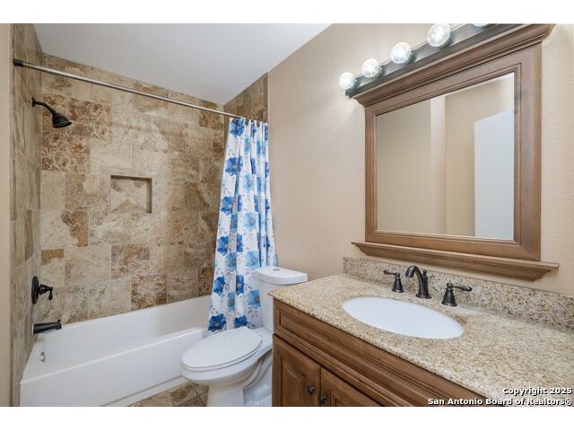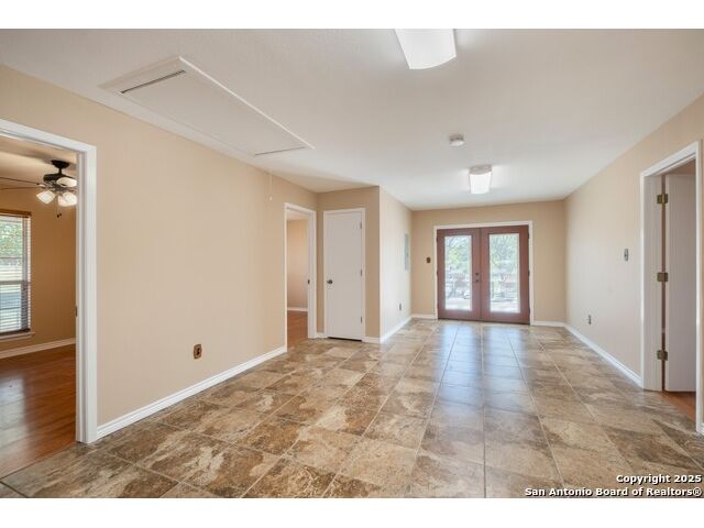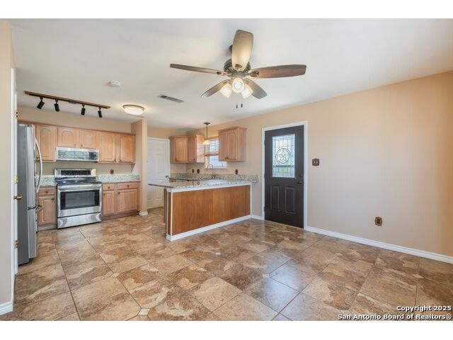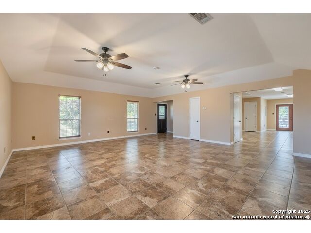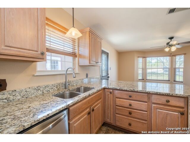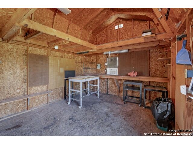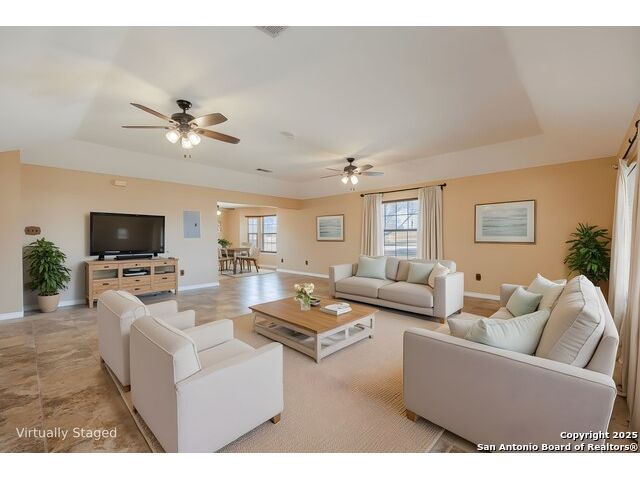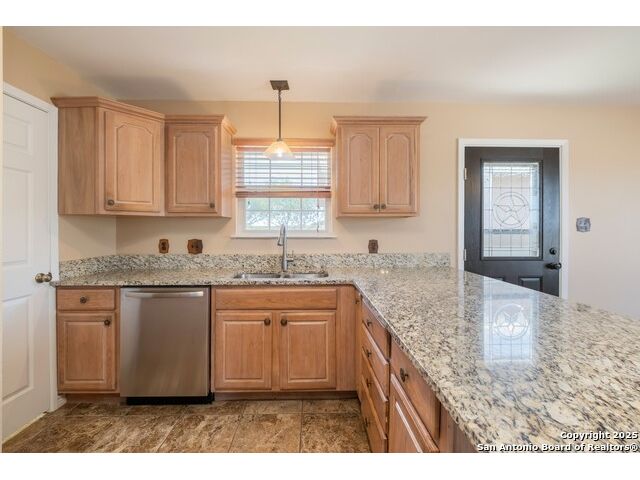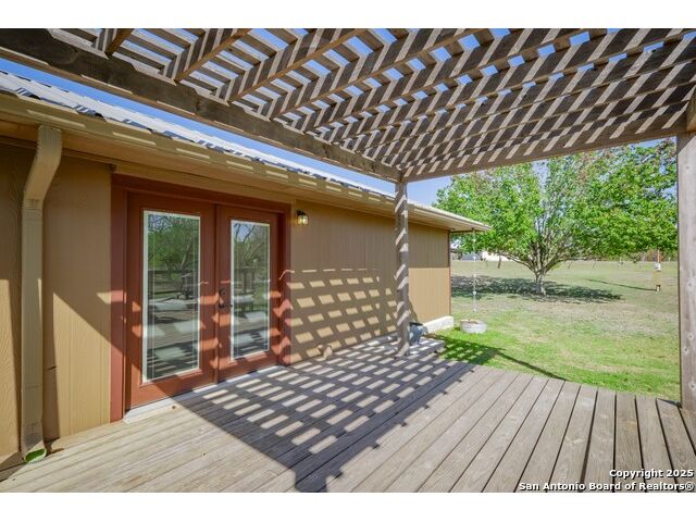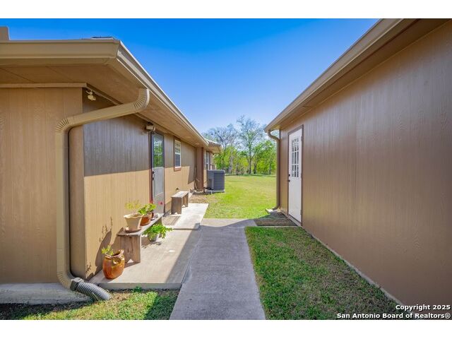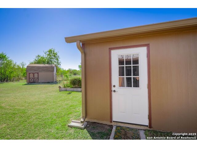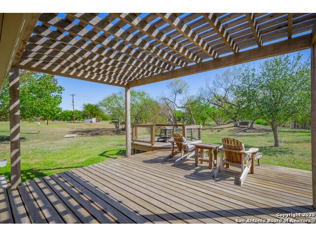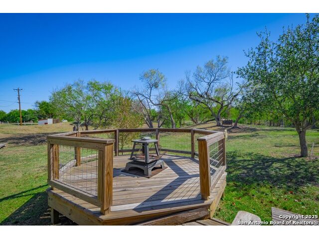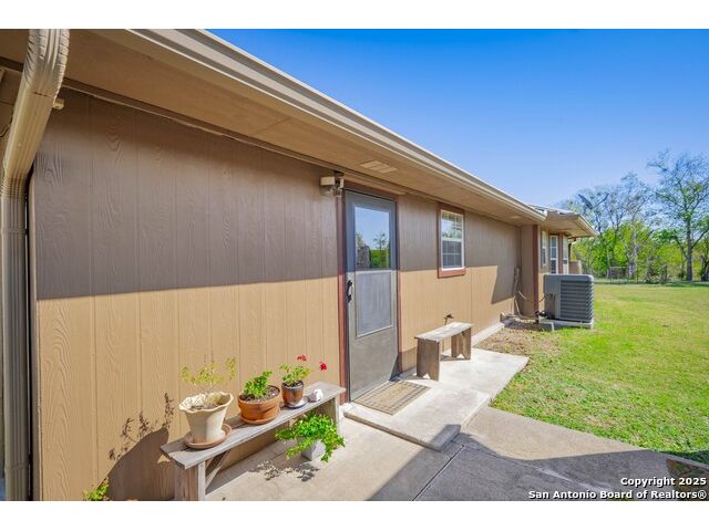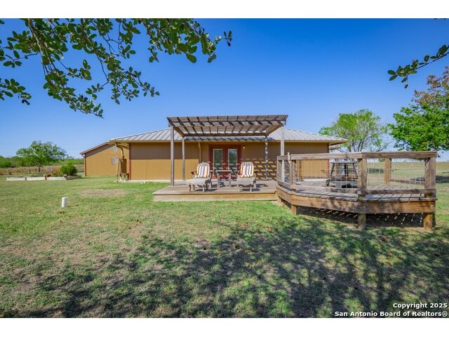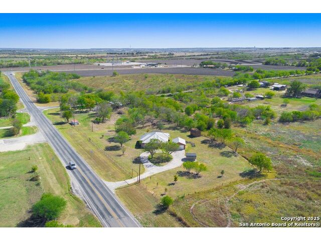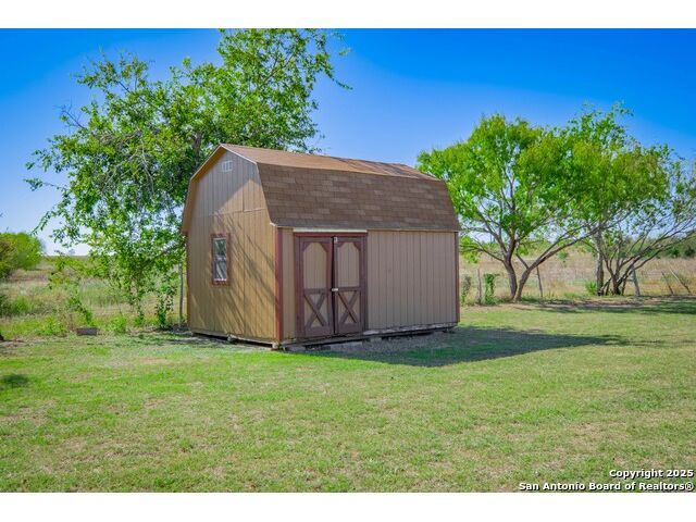 Country living, yet only minutes to New Braunfels, San Marcos and Seguin for shopping and fun! Drive up the circular drive to this one-story large ranch home (1,932 sq. ft.). It's in excellent shape and offers 3 beds and 2 baths sitting on 2.45 acres (per appraiser report). After a long day's work, relax on the (almost) full-length covered front porch. Inside, you'll enjoy preparing meals in the large kitchen open to the dining area. Everything you'd want is here: granite counters, solid wood cabinets, fridge, dishwasher, garbage disposal, oven, microwave, tile flooring and even an eating counter. Enjoy your meals in the dining area looking out over your land through the bay window. The wide-open family area, also with tile flooring, has room for large family gatherings, and you'll stay comfortable with the 2 ceiling fans. Have allergies? Not in this home with wood flooring in all 3 bedrooms and ceiling fans with lights. Wood blinds throughout the home. The two bathrooms are tastefully done with tile flooring and granite counters. Between the bedrooms is a large open area - what you turn it into is up to you...TV area? play area? music area? office? From this open area, go through the door to a large back deck to enjoy your view. Looking for storage? This has it! The oversized 2-car garage is detached and has an auto door opener and push pad, plus lots of shelving for storage. It also has a window and a walk-through door leading to the house. In addition, there is also a covered carport for a single vehicle metal top, fabric-sided. If you enjoy nature, sunshine, playing in the dirt you'll love the 5 garden boxes for growing flowers and vegetables. In addition, there's a 16 x 12 Hardiplank storage shed/workshop with a loft and an asphalt roof; a complete chicken coop providing outside play with lots of activities for the chickens inside; a 2-stall animal shelter complete with running water and separate rooms all covered by a metal roof. There is a back gate to easily access the stalls to move the animals (pigs, rabbits, goats, horses?). And when the weather cooperates, enjoy sitting on the bench overlooking the wet-weather pond/lake on the property. This home comes with all you need - including a tractor shed that includes the tractor, the post hole digger, bucket, shop vac, etc. - equipment easily worth 20K! The shed is lighted for the short winter days. Then there is another long shed with a metal roof and sides for storing whatever. Old-style fencing along the property lines and even a little wood bridge to walk across. The French drain was built to channel rainwater to fill the pond. The vegetation includes many different trees, including the Chinese elm tree and mulberry bushes. Lots of love has been poured into this home. Recent updates include painting inside and out including the loft shed (extra paint is in the loft shed for touch-ups). The septic was pumped, gutters installed; all water faucets have backflow bibs, a rainwater collector, 40-gallon water heater, furnace replaced 5 years ago. The house has a long-lasting metal roof. All outdoor touches, including the rustic furniture, picnic table, BBQs, and benches, come with the home! Lastly, the green pole, located near the front porch is ready for you to decorate with lights to make it a Christmas tree. No HOA! Schedule to see this home today - it won't last at this price!