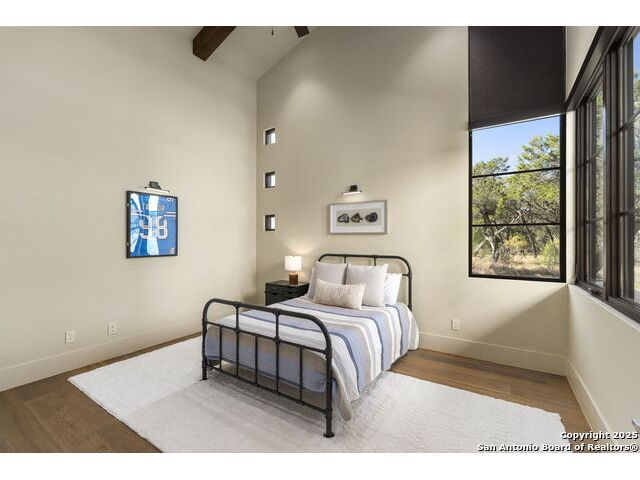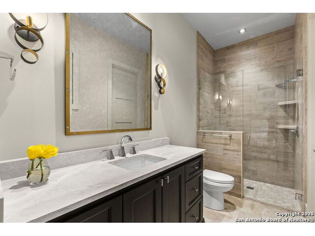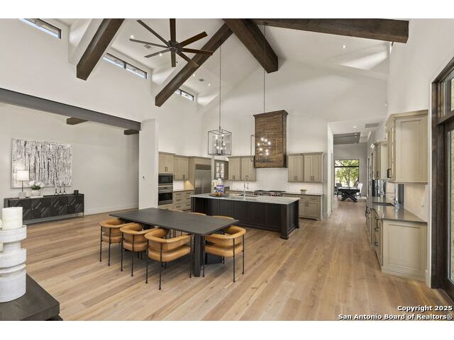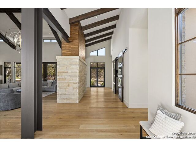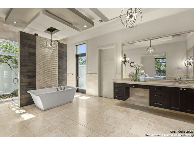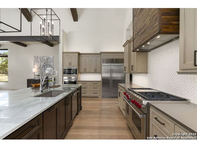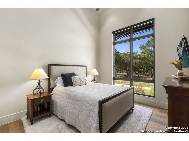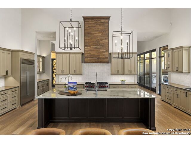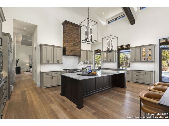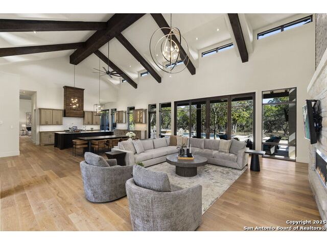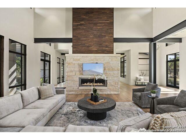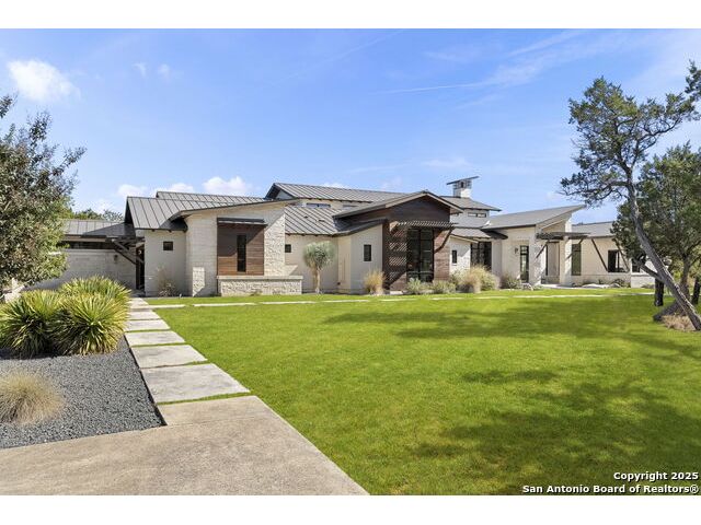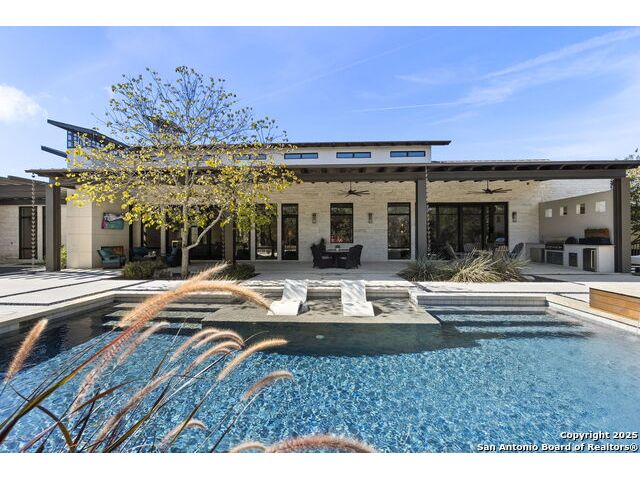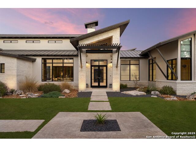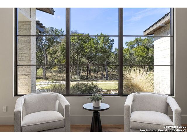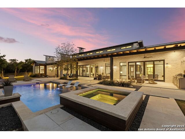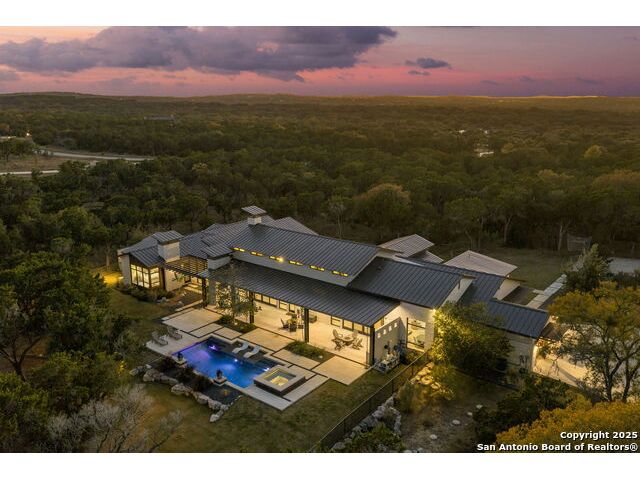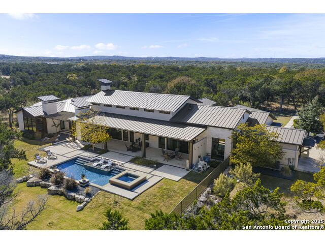 This exceptional estate presents a sophisticated, Todd Glowka single-story custom home, gracefully situated on 13.38 private acres within the Sendero Ridge enclave of Cordillera Ranch. As you pass through the private gated entry, the natural beauty and timeless allure of this property will immediately captivate you. A seamless fusion of Hill Country charm and contemporary design elements, along with a rich mix of materials and textures, has resulted in an architectural masterpiece. For those who love to entertain, this home offers boundless opportunities. Expansive walls of wood-clad windows, transoms, and glass doors frame breathtaking views of the surrounding landscape, while infusing every room with natural light. From the soaring ceilings to the grand stone walls, beautiful hardwood flooring, high-end designer chandeliers, ornate sconces, unique custom cabinetry, and steel columns-no detail has been overlooked. Each room is thoughtfully designed with architectural details that add depth and character, creating a sense of individuality throughout the home. The sprawling floor plan features a majestic great room with a cathedral ceiling and exposed beams, a striking floor-to-ceiling stone wall with a linear fireplace, and an expansive dining area perfect for large gatherings. For the culinary enthusiast, the gourmet kitchen is a true highlight. The island kitchen is meticulously designed with top-tier finishes, featuring a Wolf 6-burner gas range with a griddle and double ovens, complemented by a sleek vent-a-hood. Custom soft-close cabinetry, a wealth of counter space, intricately designed backsplashes, and premium appliances, including a side-by-side Sub-Zero refrigerator and freezer, a built-in Wolf oven, and dual sinks with disposals. The game room, designed for both elaborate entertaining and relaxed living, is equally impressive. With its suspended ceiling treatment and a full-service bar, this space exudes luxury and style. The bar itself showcases a wall of exquisite Poly-Lac cabinetry, creating a true architectural feature. Additional touches include an expansive island with bar seating, a Marvel ice maker, a beverage cooler, and doors that lead directly to the outdoor kitchen and living areas. Adjacent to the game room, the climate controlled wine cellar demands attention. With sleek glass walls that serve as an artful display, this sophisticated wine room is designed to showcase your finest collection. Featuring custom wine racking, accent walls with subtle lighting, and a wine probe, it's as much a visual experience as it is functional. The refined study is equipped with attractive wood and glass sliding doors and a wall of custom-built-in shelves and cabinetry. The owner's wing serves as a serene retreat, offering peaceful views and a tranquil environment. The luxurious, spa-inspired bath features floating vanities, designer sconces and chandeliers, a freestanding Jacuzzi garden tub with an accent wall, and a glass-enclosed shower that overlooks a private Zen rock garden. The two expansive wardrobe rooms within the owner's suite are outfitted with custom shelves, drawers, and hanging rods, offering ample storage space and a refined, organized feel. Three additional bedrooms each feature en-suite bathrooms, custom walk-in closets and automatic shades. The home also includes a well-appointed utility room and mudroom. Designed for year-round enjoyment, the expansive covered patio beckons with its inviting fireplace and multiple seating areas for dining, living, and lounging. This outdoor oasis offers endless possibilities, from hosting grand gatherings in picturesque Hill Country setting to enjoying a quiet morning while sipping coffee. The sparkling pool with an adjoining spa, lounging deck, and a soothing water feature creates the perfect space to unwind and enjoy the beauty of the landscape. Come experience the dream of living amidst one of Texas' most beautiful settings.