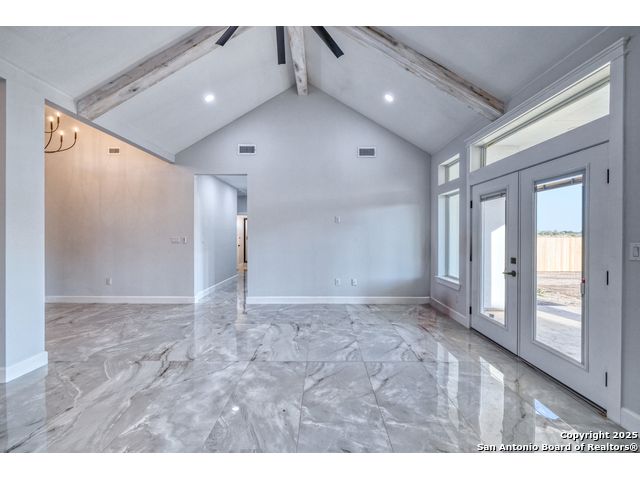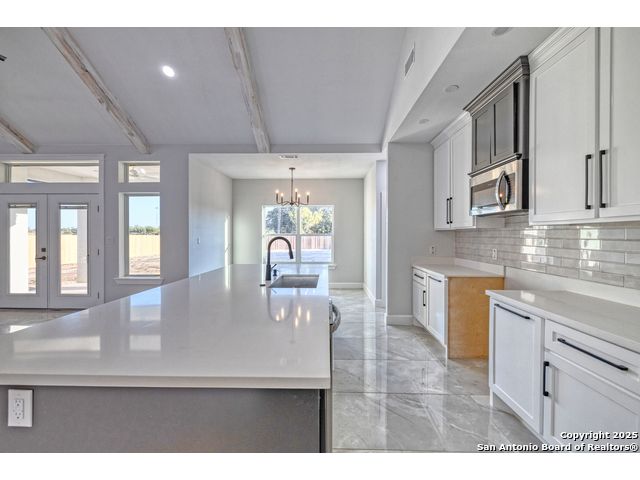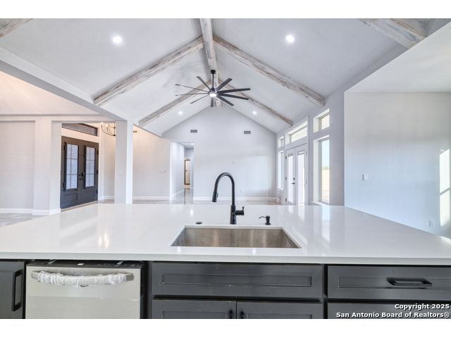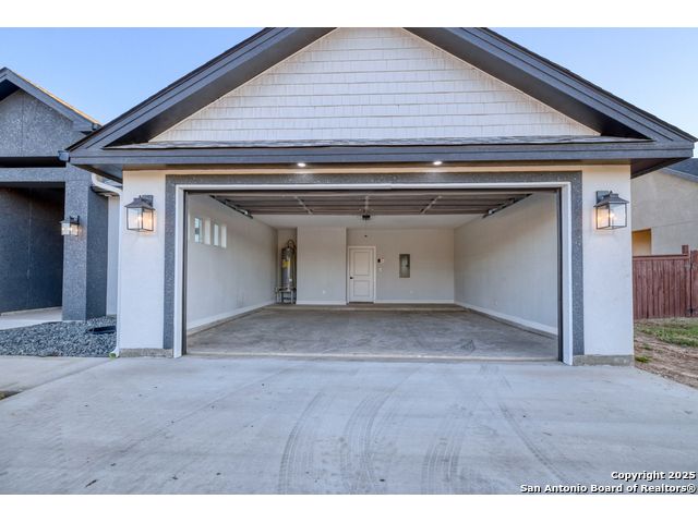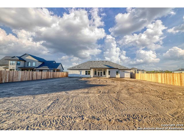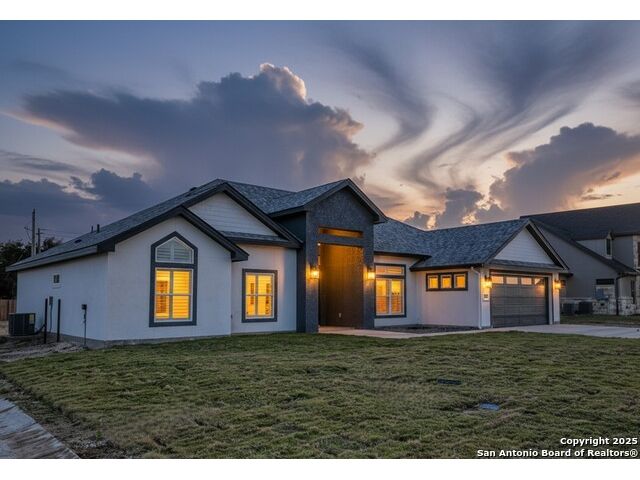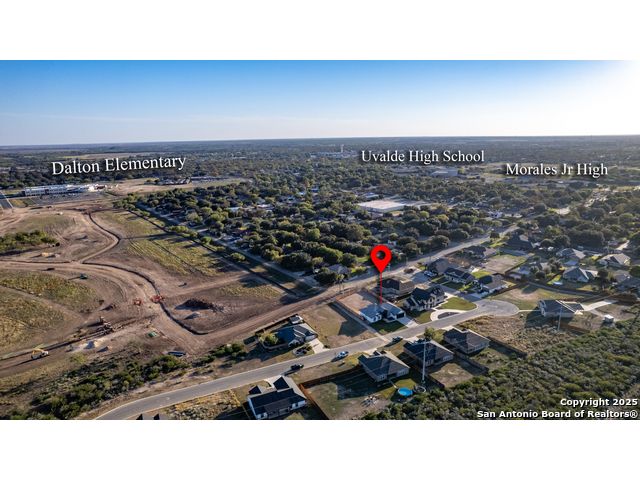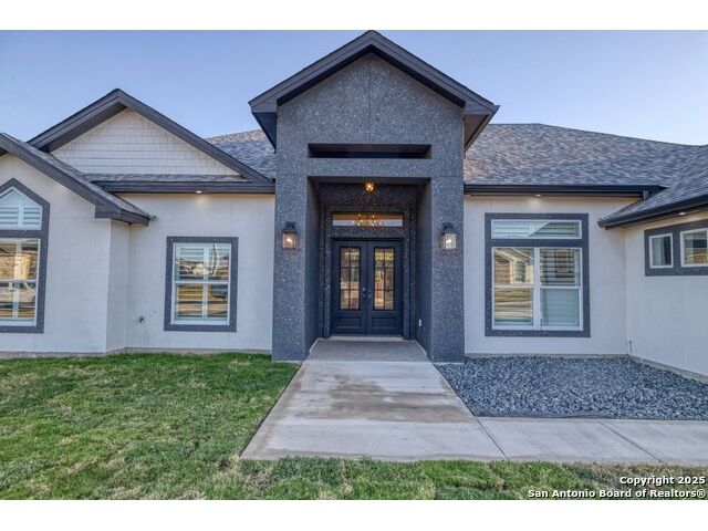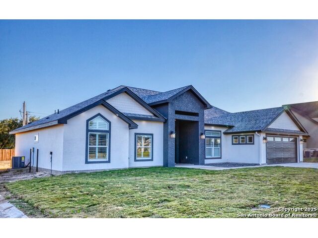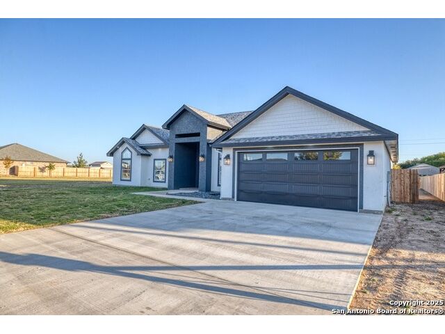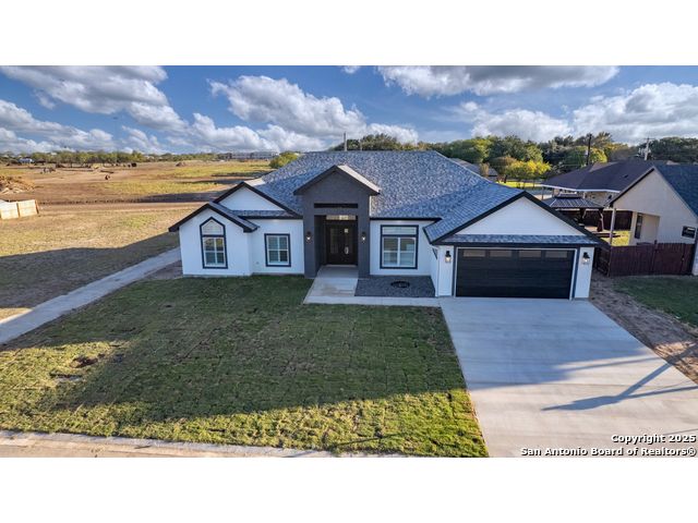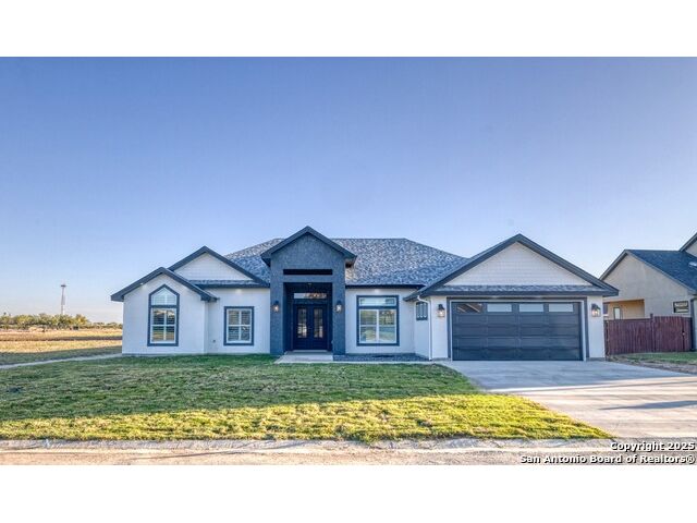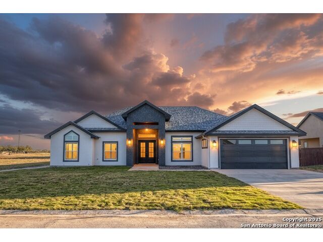 This newly completed custom home in one of Uvalde's most desirable new neighborhoods offers a thoughtful blend of modern design, quality craftsmanship, and everyday comfort. With 4 bedrooms, 3.5 baths, and approximately 2,280 sq. ft. of living space, the layout centers around a highly sought-after open concept that brings the kitchen, dining, and living areas together in one inviting setting. The interior is finished with ceramic tile throughout for a clean, cohesive look and easy maintenance. A 10-foot quartz island anchors the custom kitchen, complemented by custom cabinetry, a beautifully tiled backsplash, and a dedicated dining area plus a breakfast nook. A convenient half bath sits just off the kitchen and also opens to the back patio-an ideal setup for entertaining or future outdoor additions like a pool. Large French doors lead to the covered back porch, creating a great place to unwind in the evenings. The primary suite features a coffered ceiling with white-washed exposed beams, a spacious walk-in closet with built-ins, and a stunning bath complete with dual vanities, a custom tile shower with frameless glass, and a private water closet. Two guest bedrooms include plantation-style shutters, generous walk-in closets with built-in storage, and easy access to a beautifully finished guest bath with quartz counters and a custom walk-in shower. Across the main living area, a second master suite offers flexibility for multigenerational living, extended guests, or a private home office. Additional highlights include custom lighting throughout, decorative eave lighting that gives the home incredible curb appeal at night, a custom steel industrial-style front door with smart keypad entry, and two HVAC units for efficient climate control. The laundry room offers excellent natural light, cabinetry, and a built-in folding table. The fully finished two-car garage includes sheetrock, trim, paint, architectural windows, LED lighting, and an electric opener. Outside, the home features fresh sod, a front sprinkler system, and sits on just over one-third of an acre. The location is hard to beat-just blocks from four major schools and less than five minutes from Uvalde's new hospital. This is a true custom build with finishes and details that set it apart from the typical new-construction home