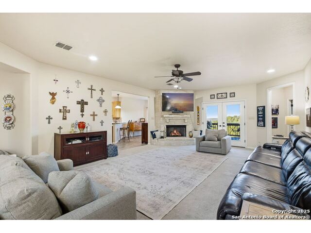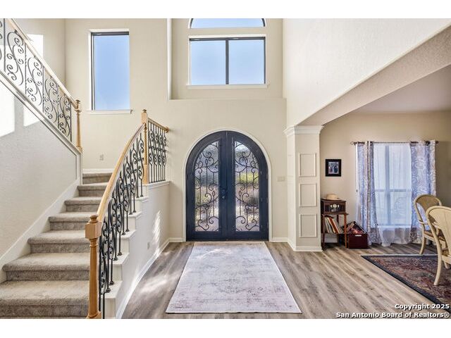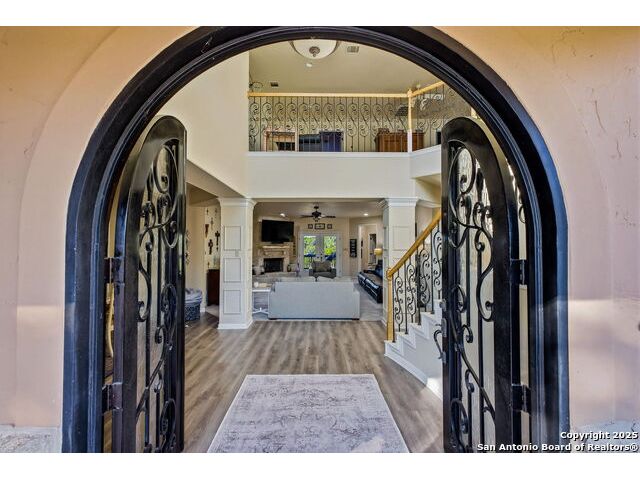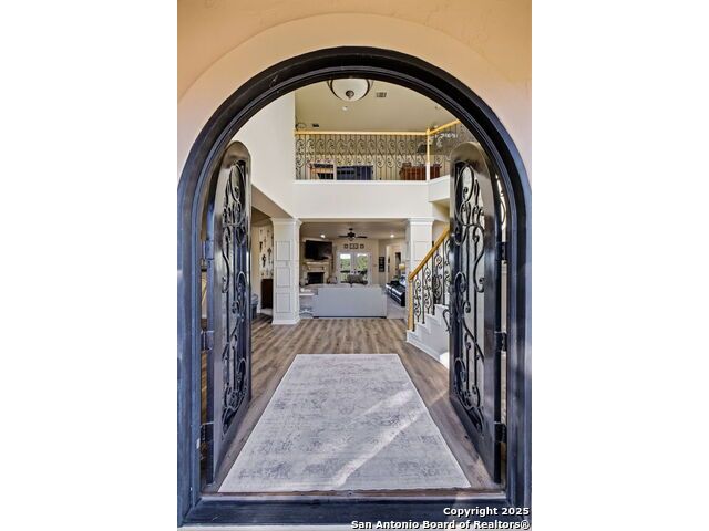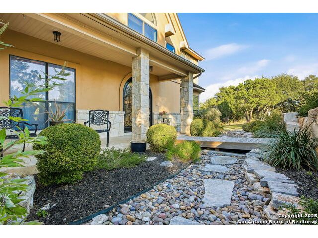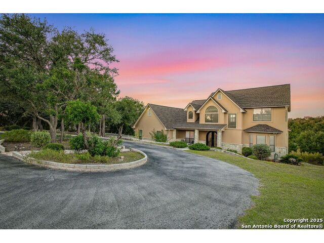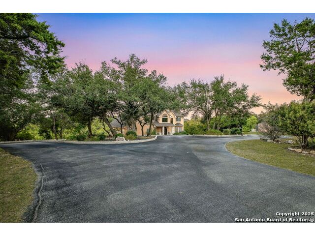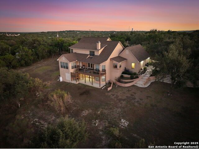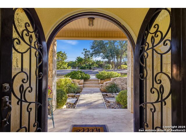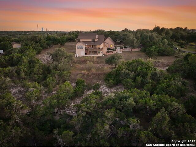 Stunning Hill Country Retreat with Panoramic Views - Your Private Escape Awaits Nestled on a generous and private acres, Perched atop a serene hillside with sweeping, unobstructed Hill Country views, this exceptional multi-level home offers the perfect blend of privacy, space, and timeless craftsmanship. A circular drive and elegant, arched wrought-iron double doors welcome you into a bright, soaring foyer filled with natural light. Detailed millwork, custom iron balusters, and rich wood tones set the tone for a residence designed with both warmth and sophistication. The spacious island kitchen features abundant solid-wood cabinetry, granite countertops, a wrap-around breakfast bar, stainless appliances, and panoramic views from multiple windows-ideal for everyday living and effortless entertaining. The adjoining dining area is surrounded by windows, drawing in the scenic vistas at every turn. Retreat to the luxurious primary suite boasting a tray ceiling, generous sitting area, and private access to the upper deck where breathtaking sunsets stretch across the horizon. The primary space is framed by walls of windows showcasing endless treetops and rolling terrain. A standout feature of this property is the expansive lower-level suite-perfect as guest quarters, multigenerational living, a home office, or an income-producing rental. With exterior access, a full bedroom setup, lounge area, office nook, and fitness space, it offers exceptional flexibility. Step outside to multiple viewing decks where morning coffee and evening relaxation come with show-stopping views of the Texas Hill Country. From sunrise to twilight, the scenery is nothing short of spectacular setting, the property provides room to roam while remaining just minutes from conveniences, dining, and top-rated schools.