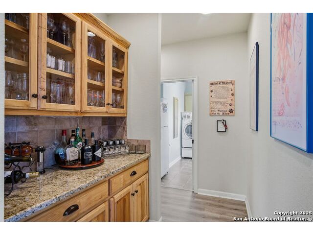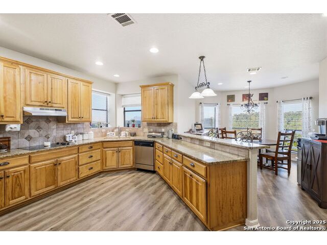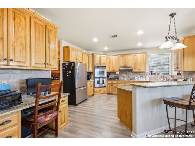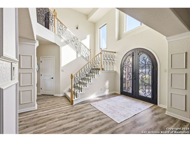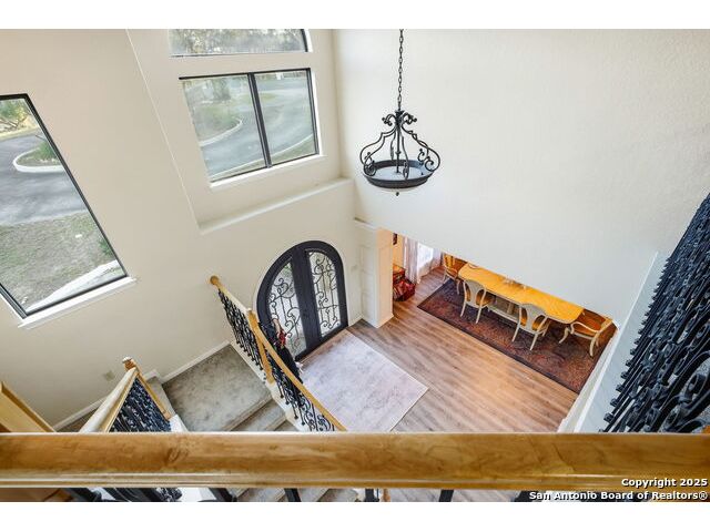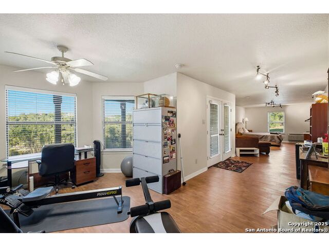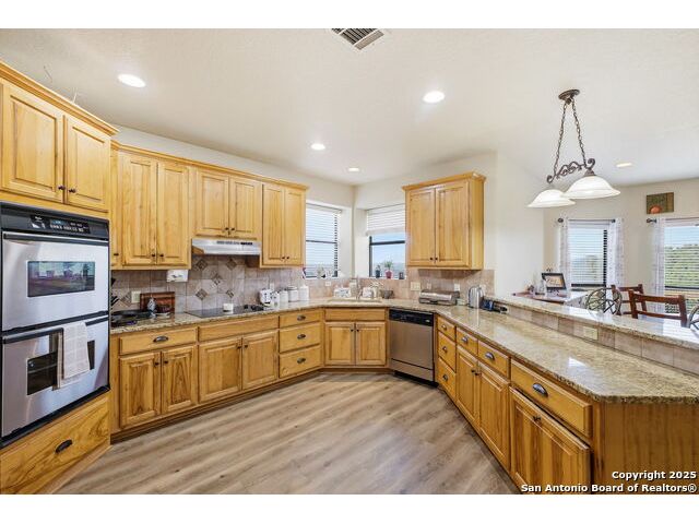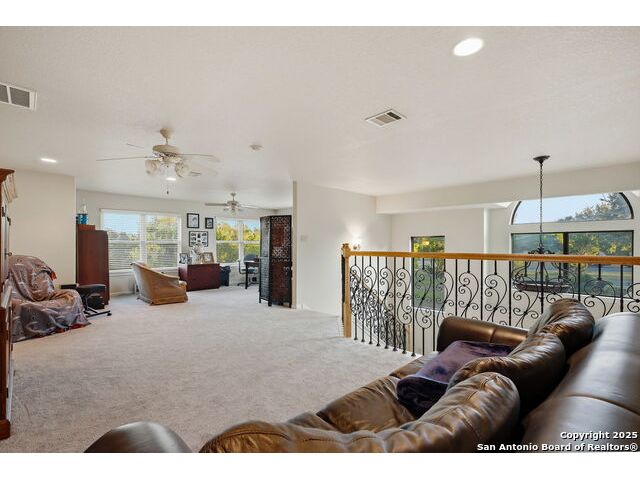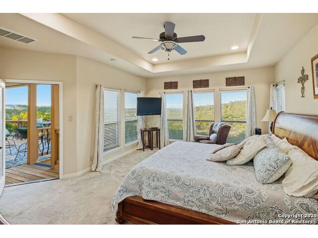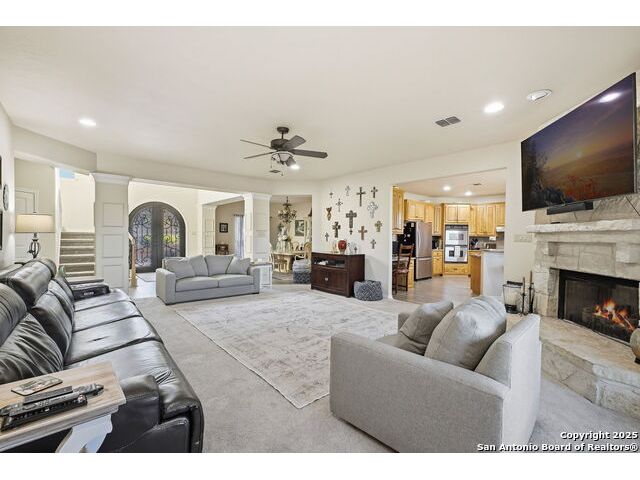Stunning Hill Country Retreat with Panoramic Views - Your Private Escape Awaits Nestled on a generous and private acres, Perched atop a serene hillside with sweeping, unobstructed Hill Country views, this exceptional multi-level home offers the perfect blend of privacy, space, and timeless craftsmanship. A circular drive and elegant, arched wrought-iron double doors welcome you into a bright, soaring foyer filled with natural light. Detailed millwork, custom iron balusters, and rich wood tones set the tone for a residence designed with both warmth and sophistication. The spacious island kitchen features abundant solid-wood cabinetry, granite countertops, a wrap-around breakfast bar, stainless appliances, and panoramic views from multiple windows-ideal for everyday living and effortless entertaining. The adjoining dining area is surrounded by windows, drawing in the scenic vistas at every turn. Retreat to the luxurious primary suite boasting a tray ceiling, generous sitting area, and private access to the upper deck where breathtaking sunsets stretch across the horizon. The primary space is framed by walls of windows showcasing endless treetops and rolling terrain. A standout feature of this property is the expansive lower-level suite-perfect as guest quarters, multigenerational living, a home office, or an income-producing rental. With exterior access, a full bedroom setup, lounge area, office nook, and fitness space, it offers exceptional flexibility. Step outside to multiple viewing decks where morning coffee and evening relaxation come with show-stopping views of the Texas Hill Country. From sunrise to twilight, the scenery is nothing short of spectacular setting, the property provides room to roam while remaining just minutes from conveniences, dining, and top-rated schools.