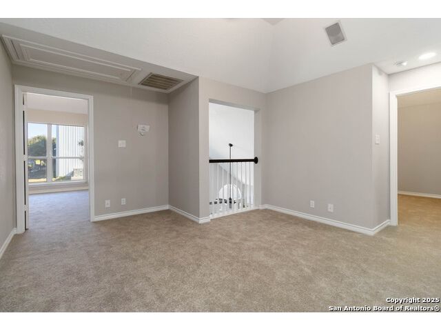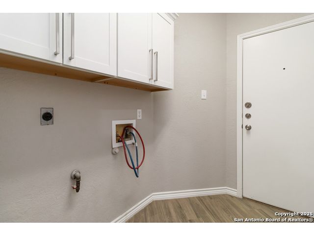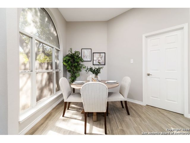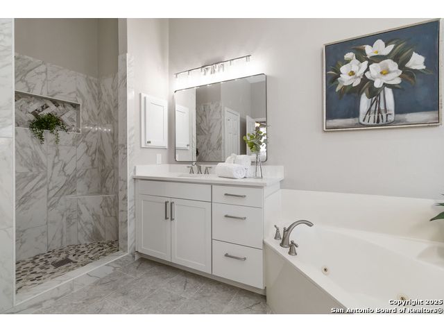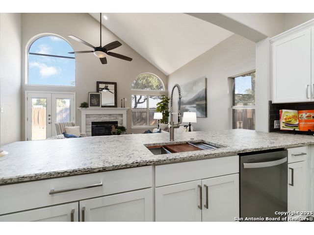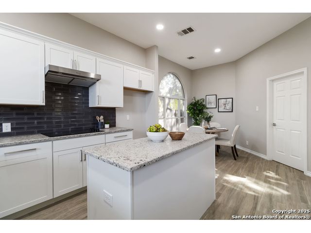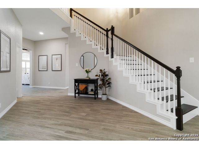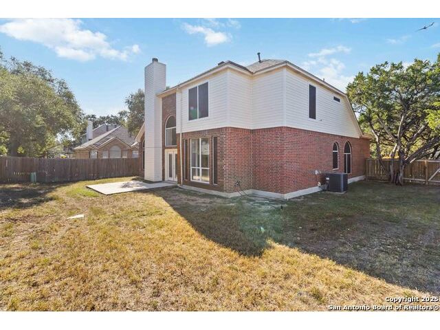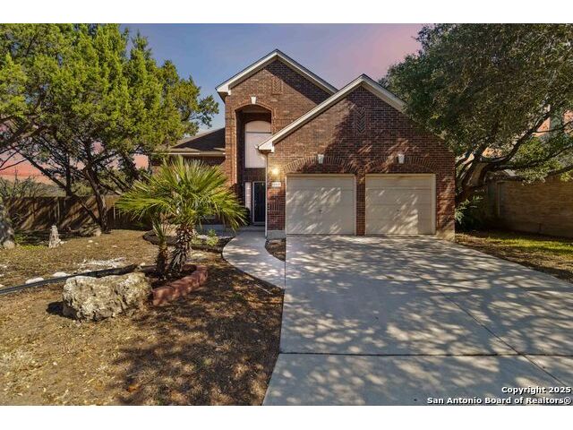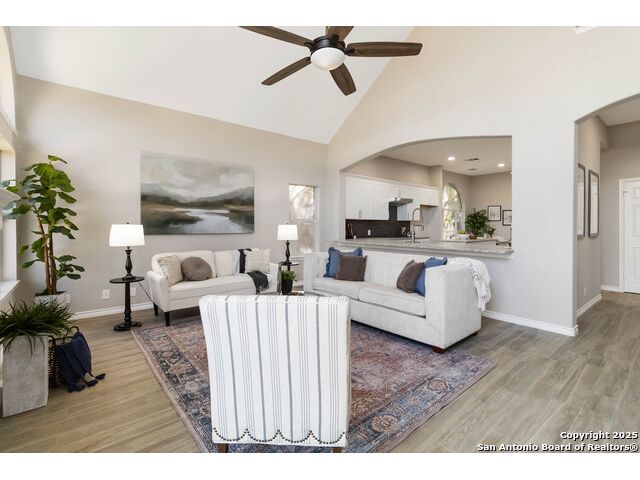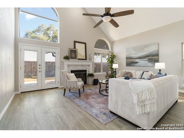 Welcome to a gorgeously updated two-story residence located in San Antonio's sought-after northside community of Regency Park. This four-bedroom, 2.5-bath layout offers elegant finishes, a 2021 roof replacement, and thoughtful upgrades throughout. Enter beneath the dramatic two-story foyer into a bright living area featuring an open-to-above layout and large arched windows. Updated wood-look porcelain tile floors, LED lighting and ceiling fans flow throughout the main level. A refined linear stone fireplace anchors the living space, creating a striking focal point. The kitchen is a showpiece - white shaker-style cabinetry, granite counters with a center island, stainless appliances including a 30 electric cooktop, double wall oven/microwave combo, and a stylish subway-tile backsplash. A built-in workstation sink with pull-down faucet adds both form and function. The island offers breakfast bar seating and opens directly to the living and dining areas - ideal for everyday living or hosting guests. The primary suite on the main level accommodates a generous walk-in closet and a spa-quality bath featuring dual vanities, separate soaking tub, and tiled walk-in shower with marble herringbone niche and natural-stone pebble-floor detail. All guest and secondary bedrooms are located upstairs, each fitted with ceiling fans and spacious closets. The powder room, guest bath and laundry all feature premium fixtures and tile appointments. Outside, the property sits on a spacious lot with established trees, a fenced yard and two-car garage - upgraded with stylish epoxy flooring. Patio access from the main level invites outdoor living and offers superb potential for personalization. This home combines polished elegance, ample space, replaced roof, and practical upgrades in a location with convenient access to Huebner Elementary, Eisenhower Middle, and Churchill High schools, HEB grocery and local shopping corridors, Loop 1604, 410, and I-10, and northside amenities. Don't miss the opportunity to schedule your showing today.