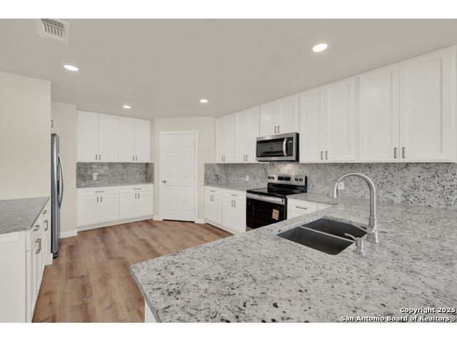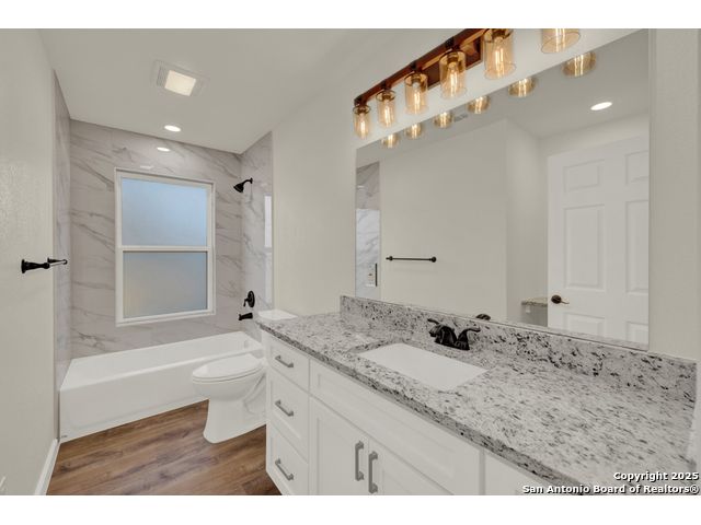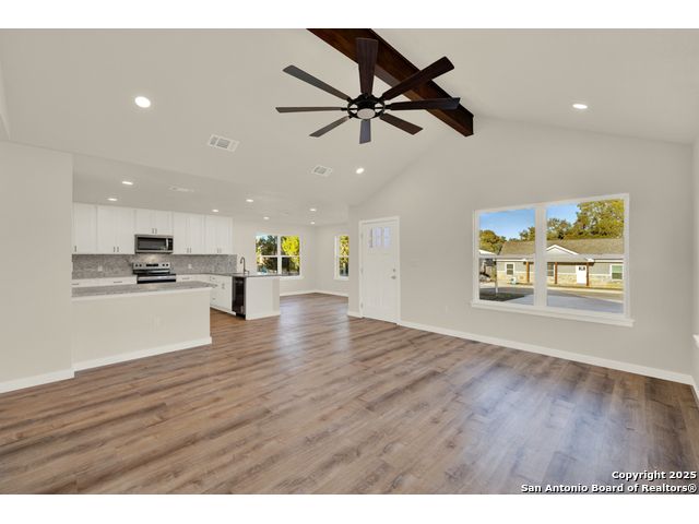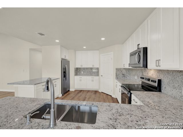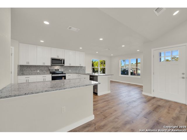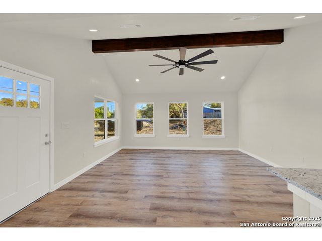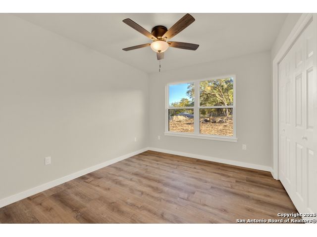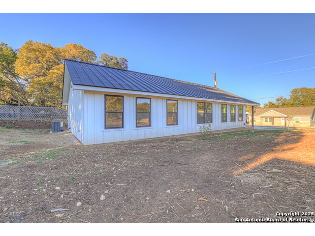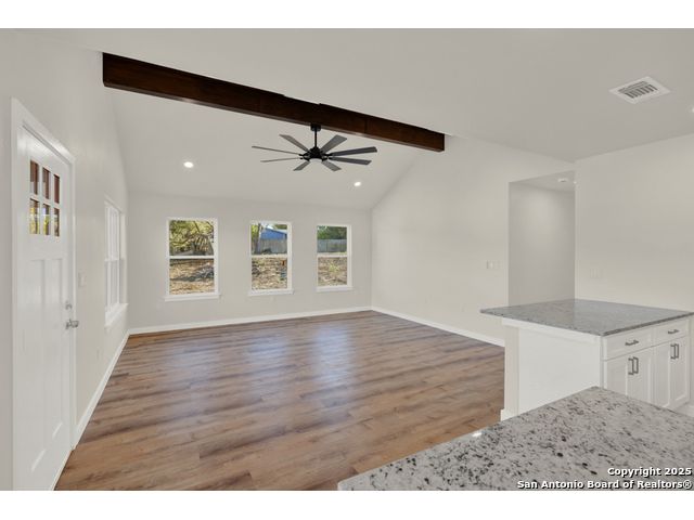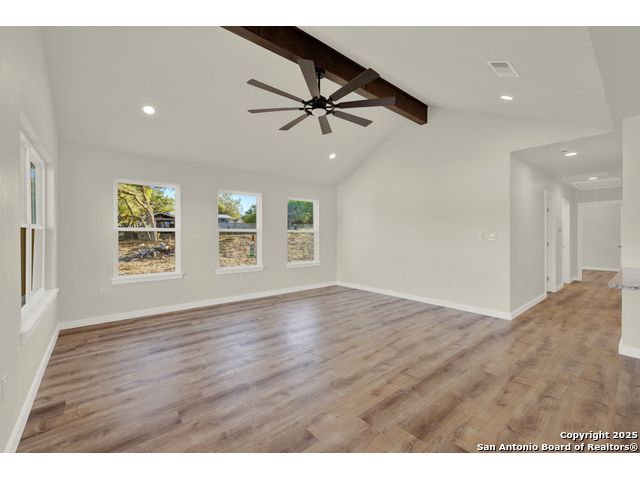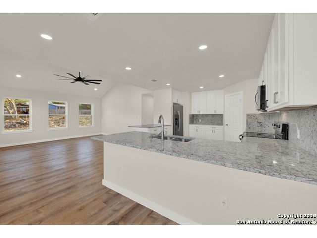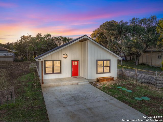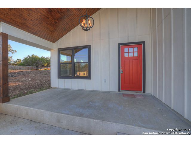 This thoughtfully crafted new construction blends modern design with timeless Hill Country charm. Featuring three spacious bedrooms and two elegant baths, every detail of this home was designed with comfort and quality in mind. The open-concept floor plan creates an effortless flow, perfect for entertaining. The kitchen is a true centerpiece, showcasing double peninsula granite countertops, abundant cabinetry with soft-close features, and a dedicated dining area ideal for family gatherings. Durable luxury vinyl flooring runs throughout the main living and wet areas, providing style and ease of maintenance - with no carpet in sight. The primary suite offers a serene retreat with dual granite vanities and an oversized walk-in shower featuring dual shower heads. Step outside to the inviting front porch, where you can unwind and take in the peaceful Hill Country views and gentle visits from neighborhood deer. Constructed with superior craftsmanship, the home boasts 2x6 exterior framing on the east and west walls for enhanced insulation, OSB sheathing, spray foam throughout the perimeter and ceiling, and a seamless metal roof - ensuring lasting energy efficiency and peace of mind. Ideally located just minutes from Canyon Lake, and within walking distance of the community pool, playground, and tennis courts, this home offers the perfect balance of relaxation and recreation.