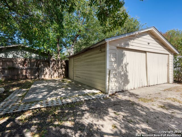 Charming single story home conveniently located less than 20 minutes from downtown San Antonio with easy access to I 10, Loop 410, and major employers. This two bedroom residence offers abundant natural light throughout, featuring a spacious living room and a flexible dining or second living area that adapts easily to your lifestyle needs. The kitchen includes laundry connections and direct access to the fenced backyard, creating a functional flow for daily living. A detached garage provides generous storage space and includes a built in workspace ideal for hobbies, projects, or tools. Situated approximately 8 miles from The Pearl District, 9 miles from the River Walk and San Antonio Museum of Art, and under 12 miles to the San Antonio International Airport, this property combines comfort, convenience, and proximity to the city's most popular destinations. A great opportunity for those seeking accessibility and potential in a central location.