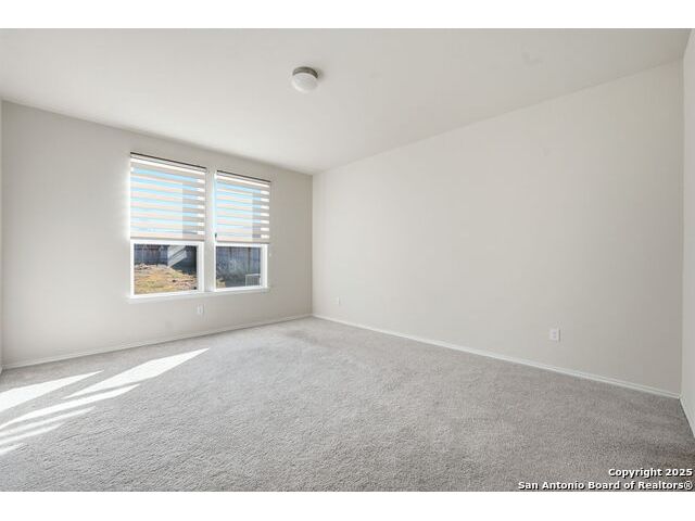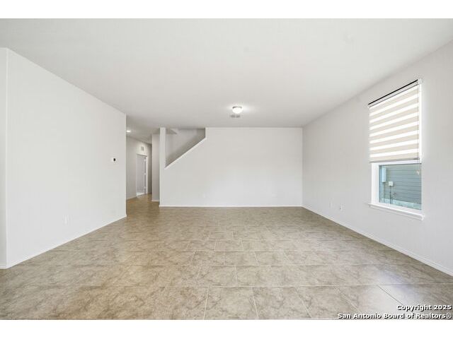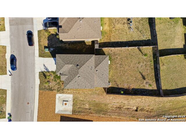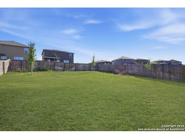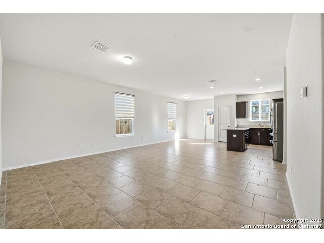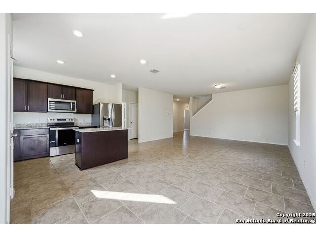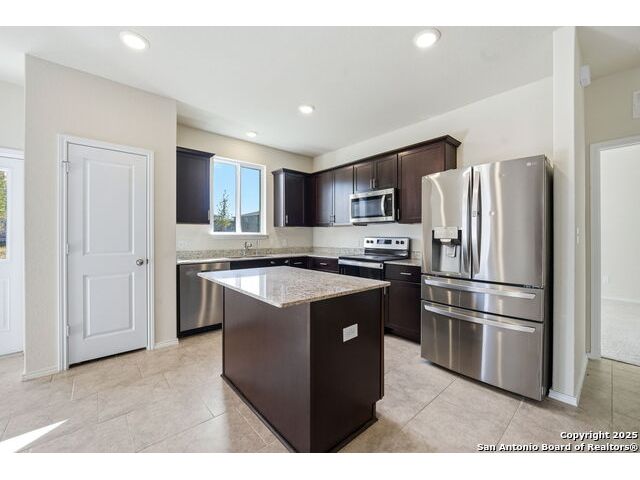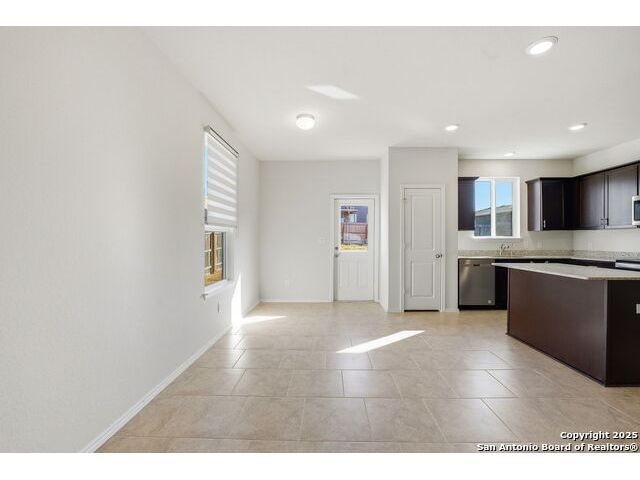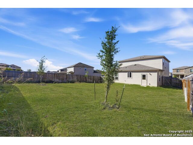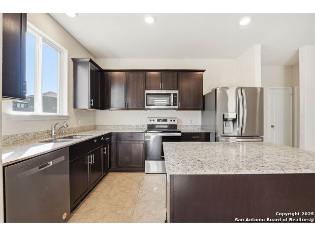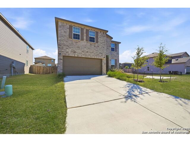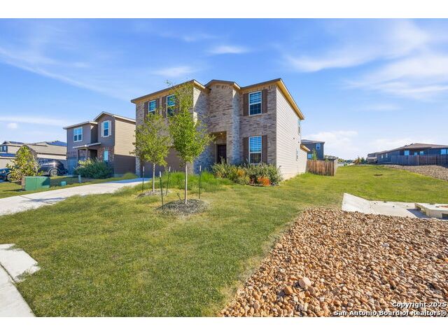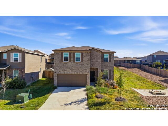 Newer build in the Cinco Lake community, this thoughtfully designed home blends modern style with everyday functionality. The open floor plan highlights recessed lighting, elegant custom blinds in the living area, and rich dark cabinetry paired with granite countertops and stainless steel appliances. A spacious kitchen island adds extra seating and prep space, creating a seamless setting for both cooking and entertaining. A flexible room on the first floor is ideal for a home office or creative studio, while the primary suite on the main level includes a full bath and walk-in closet. Upstairs, a comfortable loft provides additional living space, complemented by a conveniently located laundry room. Additional enhancements include a water softener, gutters, and a fully fenced backyard designed for privacy and easy upkeep. Residents can enjoy community amenities such as a pool and neighborhood park. Located just minutes from Lackland Air Force Base, SeaWorld, and major destinations across San Antonio, with quick access to Loop 1604, shopping, dining, and entertainment.