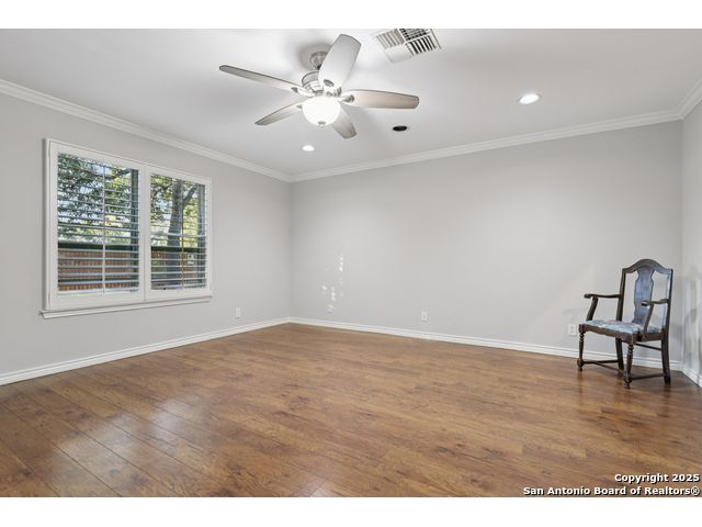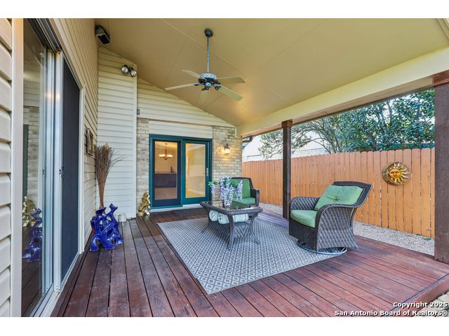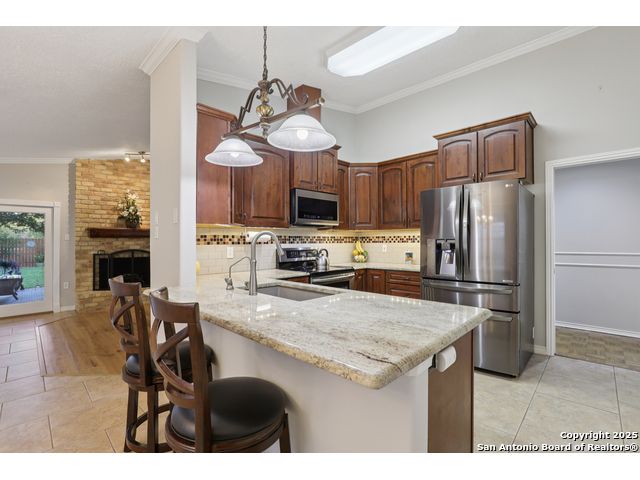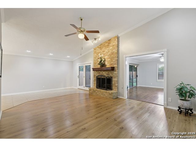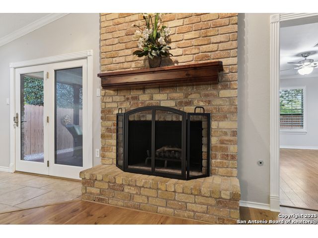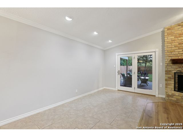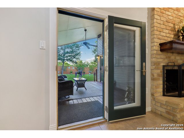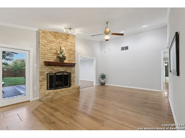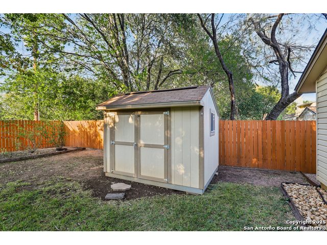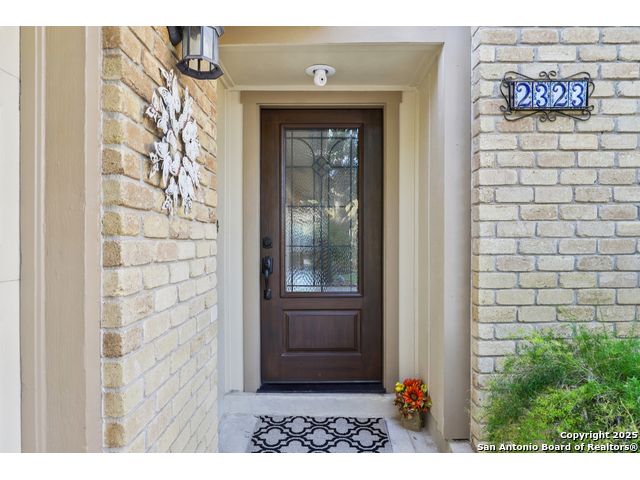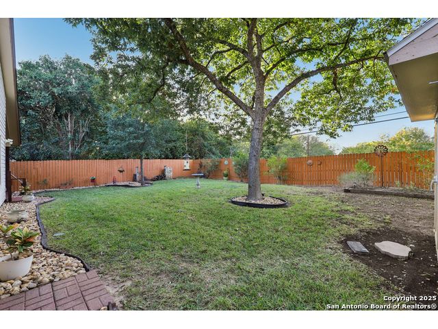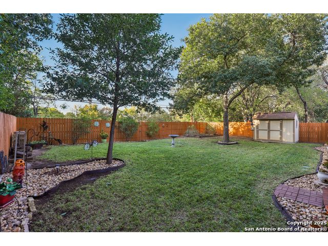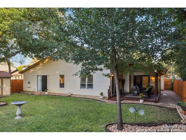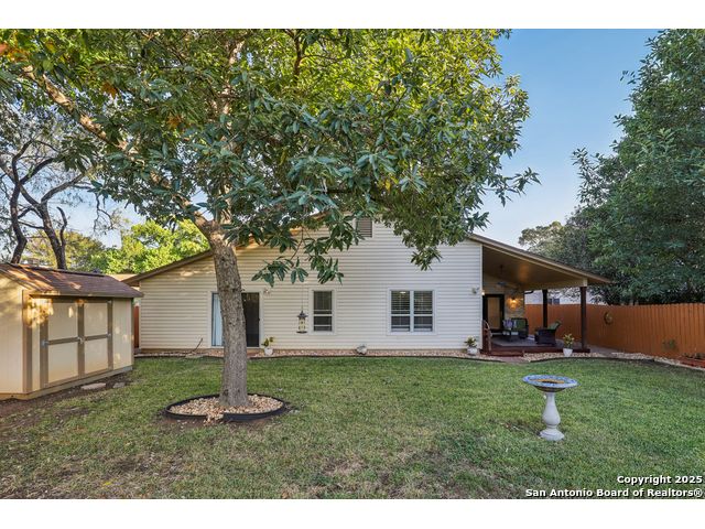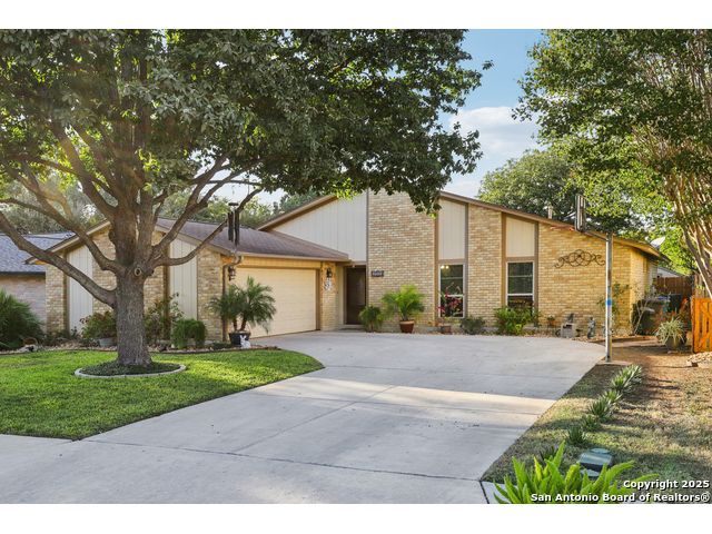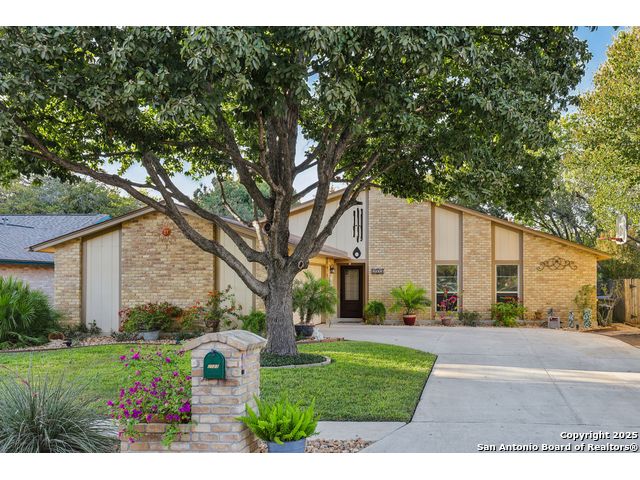 Welcome to 2323 Wilderness Wood, located in the coveted Castle Hills Forest community of San Antonio. This elegant 2,260 sq ft single-story home offers 3 bedrooms, 2 full baths, a private office/nursery off the primary suite, and a flexible bonus room just off the living area-designed for luxury living and everyday comfort. Enter through the mature-treed front yard with a side-entry two-car garage and you're met with vaulted ceilings in the living room and a warm brick wood-burning fireplace, creating a beautiful focal point for both cozy evenings and entertaining. The adjacent flex room adapts easily as a media lounge, formal dining area, game room or second office. The updated kitchen features granite countertops, rich cabinetry, stainless-steel appliances and an easy flow into the dining area. The primary suite is a true retreat with two walk-in closets, dual vanities, a walk-in shower and an attached office/nursery for added convenience. Two additional bedrooms and a second full bath complete the layout. Step into your private backyard oasis. A vaulted-ceiling covered patio overlooks a beautifully manicured yard with tall live-oak trees and professional landscaping. With no neighbors behind and peaceful greenbelt views, this space offers rare privacy in the heart of the city. Castle Hills Forest also offers optional HOA membership, giving members access to community amenities including a pool and tennis/pickleball courts-without mandatory fees. Outdoor enthusiasts will love being within walking distance with a private trailhead access within the neighborhood of the Salado Creek Greenway Trail, a scenic paved trail perfect for walking, running and biking. With quick access to Wurzbach Pkwy, NW Military, the South Texas Medical Center, the Alon Center, the JCC, restaurants, shopping and parks, this home offers exceptional convenience paired with the tranquility of a tree-lined, established neighborhood.