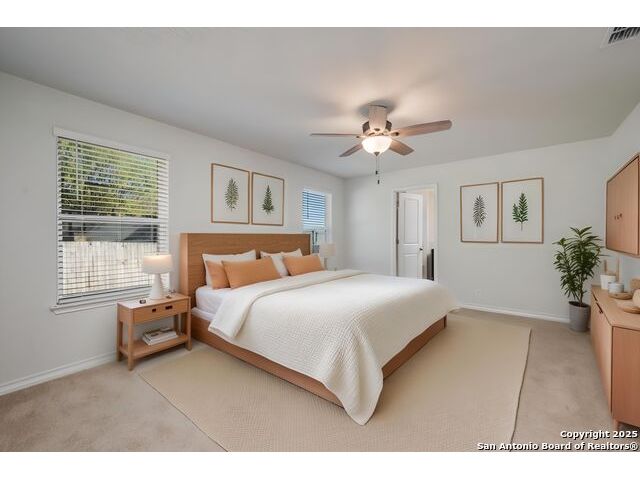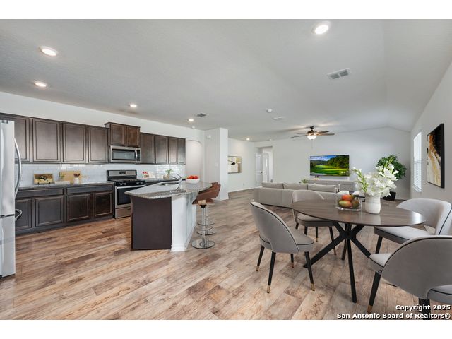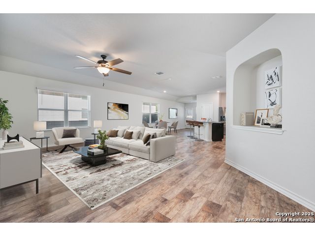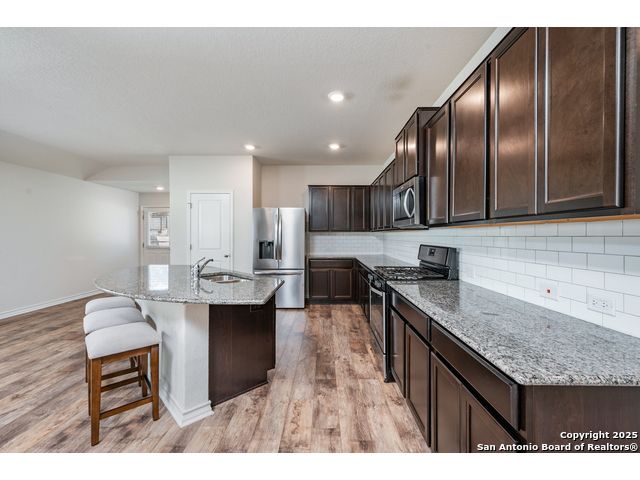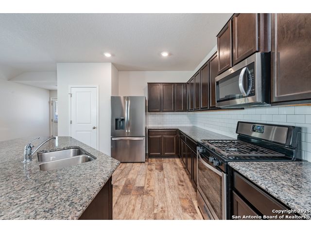 Welcome to this inviting one-story home in Valley Ranch with style and a deeply private backyard. Step inside to an inviting entryway accented by a decorative wall niche that leads into a wide-open living space. The family room, dining area, and kitchen flow together seamlessly, creating an ideal setup for everyday living and entertaining. The kitchen stands out with granite countertops, stainless steel appliances, a classic subway tile backsplash, and a large island that offers plenty of prep and gathering space. This home features four bedrooms arranged for privacy and convenience. Two secondary bedrooms and a full bath are located near the front of the home, while a third secondary bedroom and the utility room sit just off the kitchen. Tucked at the back, the spacious primary suite includes an ensuite bath with a soaking tub, separate shower, dual vanities, a private water closet, and a generous walk-in closet. Additional highlights include 9-foot ceilings, luxury vinyl plank flooring in the main living areas, ceramic tile in wet spaces, 2-inch faux wood blinds, and pre-plumbing for a water softener. The backyard is fully landscaped with irrigation and offers peaceful separation from neighboring homes due to the expansive lot behind it-ideal for relaxing or entertaining outdoors. This home offers the perfect blend of comfort, functionality, and modern style minutes from major retail and restaurants.