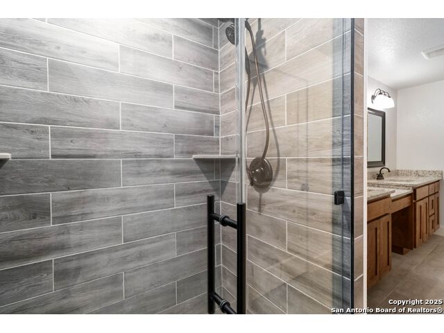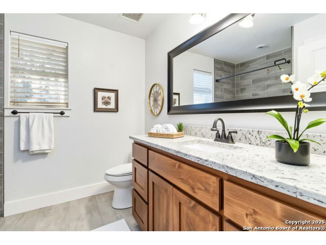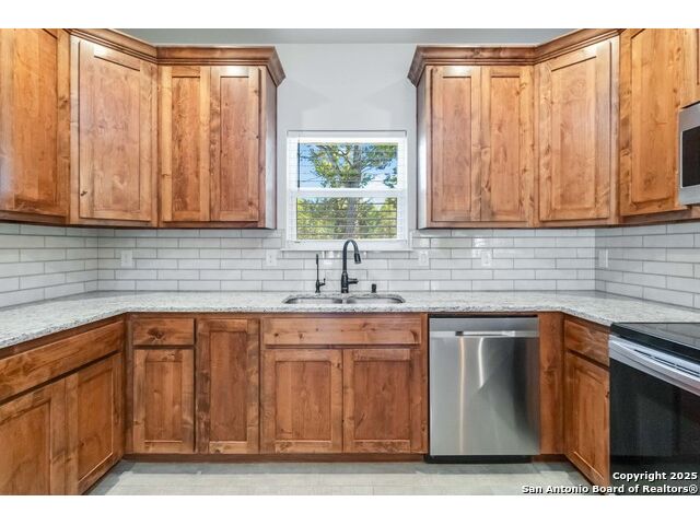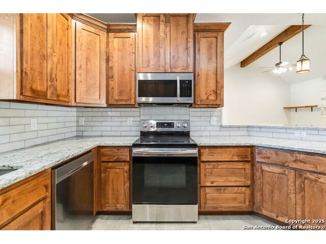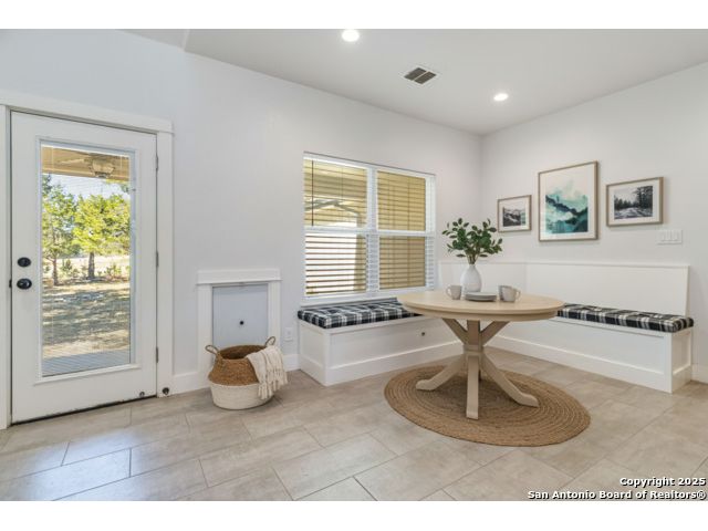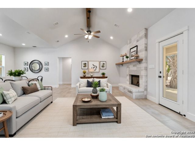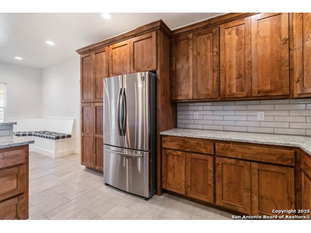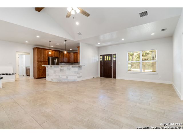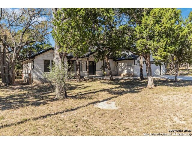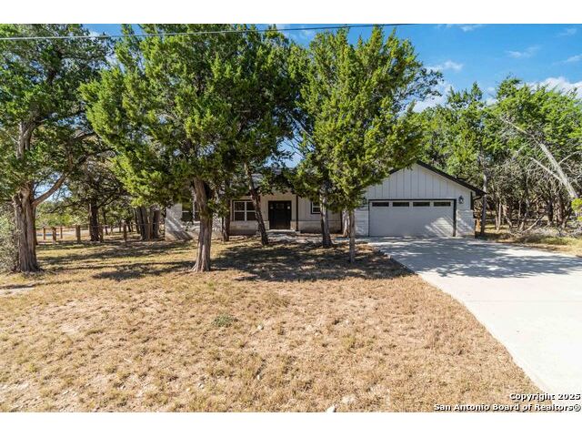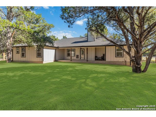 Discover modern Hill Country living in this stunning 3-bedroom, 2-bath home built in 2021 and situated on an expansive over half-acre corner lot in the sought-after Bandera River Ranch community. Thoughtfully designed for both comfort and style, this home welcomes you with an open-concept layout, abundant natural light, and high ceilings that enhance the spaciousness of the main living area. A beautiful rock fireplace serves as the focal point, creating a warm and inviting atmosphere. The well-appointed kitchen features 42" upper cabinets, granite countertops, a classic subway tile backsplash, reverse osmosis system, and a convenient breakfast bar-perfect for casual dining or entertaining. A versatile flex room offers endless possibilities and can easily serve as a home office, gym, or playroom to suit your lifestyle. Retreat to the private primary suite, complete with a luxurious en-suite bathroom showcasing a large walk-in shower, dual granite vanities, and a spacious walk-in closet with custom built-ins. Two additional guest bedrooms provide comfort and convenience for family or visitors. Step outside to enjoy Texas living at its finest on the large covered back patio, overlooking a generous yard with ample space to add a pool, garden, or outdoor kitchen. The finished 2-car garage includes a floor A/C unit, , new water softener, and offering flexibility for use as a workshop, home gym, or hobby space. Even better-all appliances convey, including the refrigerator, stove, microwave, dishwasher, washer, dryer, and deep freezer, making this home truly move-in ready. Located in a peaceful and desirable neighborhood with access to community amenities, which includes a 24 acre park, tennis, basketball, BBQ, and pool. This property combines modern comfort with serene Hill Country charm. Schedule your showing today-this exceptional home won't last!