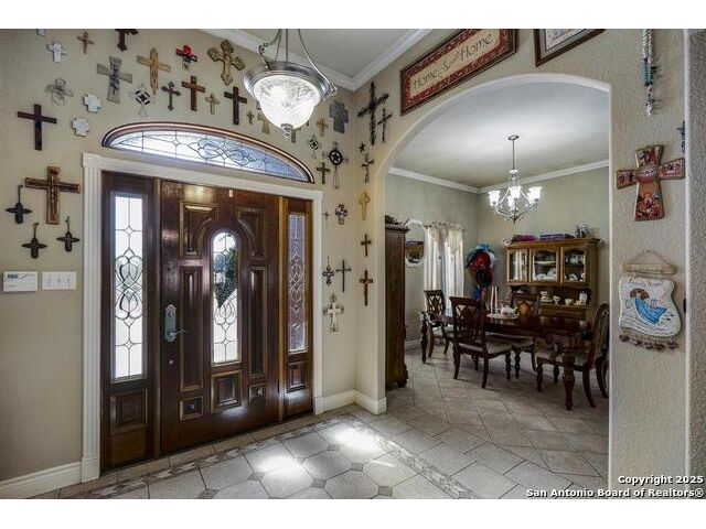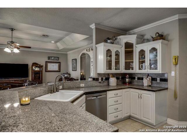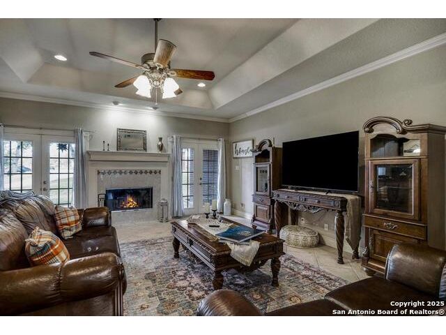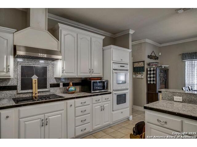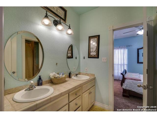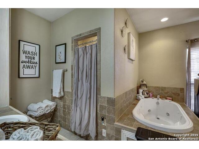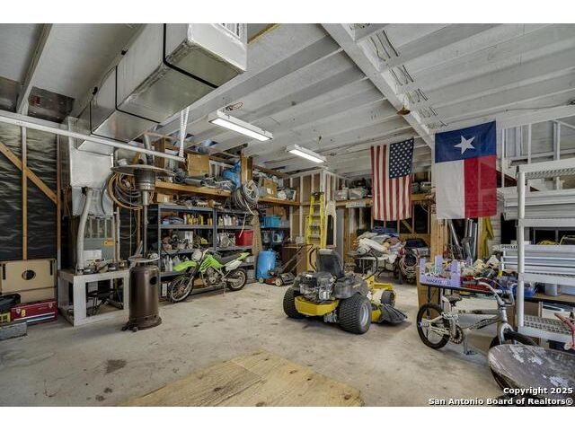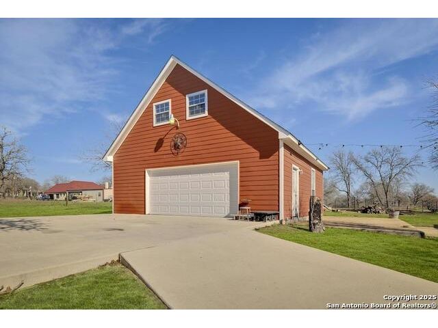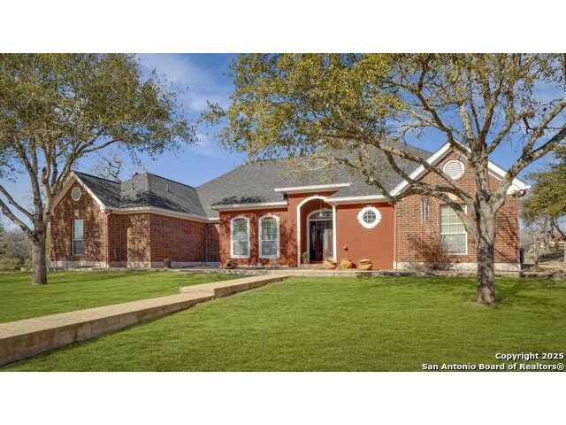 Exceptionally priced custom-built brick home on over 2.5 acres! Step inside a welcoming entry with high ceilings and a spacious family room featuring a wood-burning fireplace and French doors opening to a large back patio. This thoughtfully designed home includes a front dining room and a generous eat-in kitchen with double ovens, a newer 5-burner cooktop, and a new vent hood and dishwasher (installed 2025). The split primary suite offers dual vanities, a jetted tub, and two walk-in closets with built-ins. Additional features include an attached garage with extra storage and new opener, plus a large detached shop/garage with a half bath and a massive unfinished loft. Set on fully fenced acreage in La Vernia ISD.