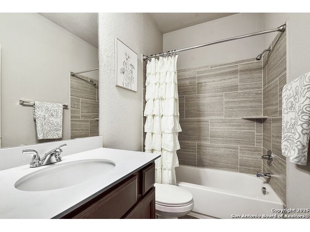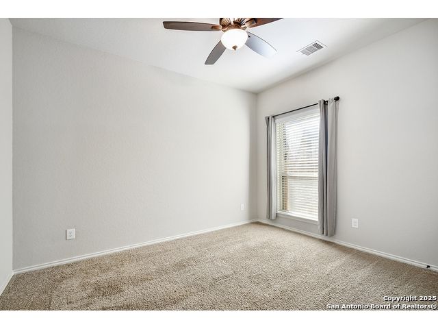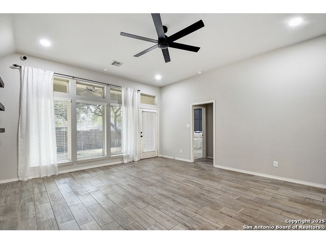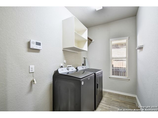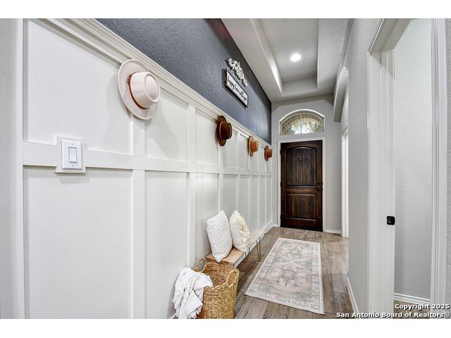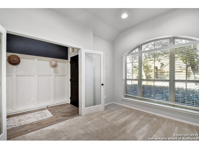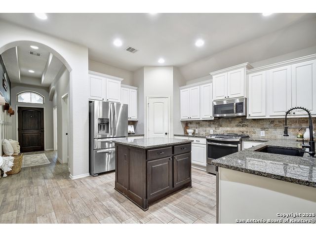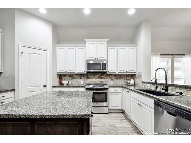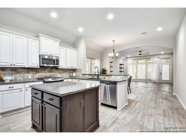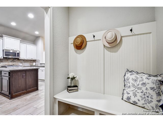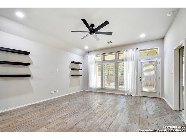 8610 Lajitas is a beautifully updated 3 bedroom, 2 bath single-story in the highly sought-after Stillwater Ranch community, offering instant curb appeal with its brick and stone exterior, mature trees, and thoughtfully selected finishes inside and out. Inside, pride of ownership shines. The entry sets the tone with an inset ceiling and a custom drop zone featuring molding, hooks, and storage - the perfect place to land coats, bags, and daily essentials. Just off the foyer, a dedicated front office filled with natural light overlooks the front yard, ideal for working from home, but easily flexes as a playroom, workout room, or hobby space. Near the garage entry, a second mudroom-style drop zone with wainscoting, hooks, and a bench with built-in storage keeps backpacks, work boots, and purses neatly tucked away. Wood-look tile flows through the main living areas, leading you into the heart of the home. The spacious kitchen features granite countertops, white cabinetry with under-cabinet lighting, a contrasting oversized island in a warm wood tone, stainless steel appliances, decorative backsplash, breakfast bar seating, and a corner pantry. The dining area seamlessly connects the kitchen to the large living room, where decorative wall shelving and a wall of windows create a bright, inviting space that's perfect for everyday living and entertaining. The private primary suite offers high ceilings, another expansive wall of windows, and stylish decorative wall molding. The ensuite bath includes a soaking tub, separate walk-in shower, dual-sink vanity, and a generous walk-in closet with shelving. Two well-sized secondary bedrooms share a full bath with a tiled tub/shower surround. A water softener and reverse osmosis system add everyday comfort and convenience, and the sellers have also thoughtfully updated ceiling fans throughout the home. Step outside to unwind in the backyard, complete with a covered patio, mature trees, a storage shed, and a cozy corner fire pit area. Even better-the fire pit and chairs convey, creating an instant outdoor retreat. The washer and dryer also convey, and the epoxy-coated garage floor adds a polished, low-maintenance finish to the two-car garage with its own separate bay. All of this in amenity-rich Stillwater Ranch, where you'll enjoy two pools, a full fitness center, basketball court, and walking trails, plus a convenient location close to major employers, dining, and shopping.