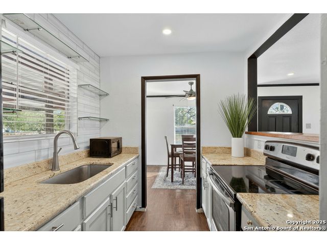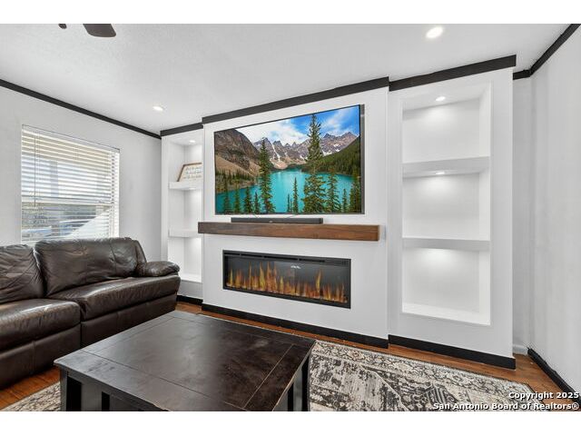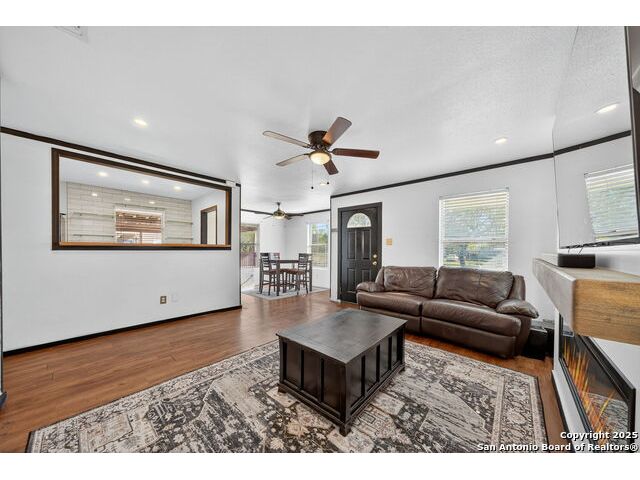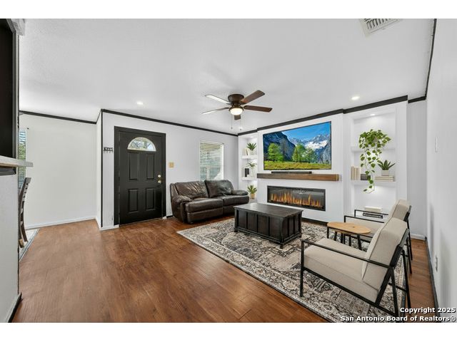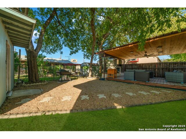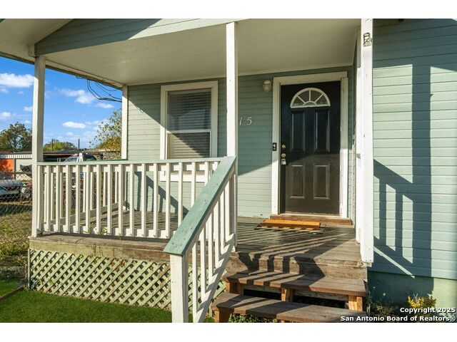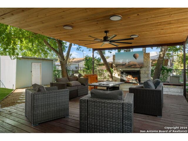 Welcome to 315 West Emerson-a charming, thoughtfully updated residence perfectly situated in the heart of San Antonio. This inviting home blends timeless character with modern comfort, offering light-filled living spaces and meaningful upgrades that elevate everyday living. Step inside to an open-concept layout that flows effortlessly from the spacious living room into a beautifully remodeled kitchen. Here, painted cabinetry, updated backsplash and sleek glass shelving create a clean, contemporary aesthetic. A newly added passthrough from the kitchen to the living room enhances connection and natural light. The living area showcases custom built-in shelving with app-controlled accent lighting-featuring adjustable color settings-and a newly added electric fireplace that provides both ambiance and supplemental heat. The central bath offers a serene retreat, featuring a walk-in shower with floor-to-ceiling tile, replacing the original tub for a more modern, spa-like feel. Additional enhancements include a smart thermostat for efficient climate control. Step outside and experience an outdoor setting designed for both relaxation and entertaining. Extensive concrete flatwork has been added from the front to the back along the right side of the home, leading to a newly built wooden deck. A metal roof extension runs along that same side-from fence line to the front of the home-offering shade and protection. The back deck features an exterior electric fireplace, built-in Bluetooth speakers, and an outdoor TV that conveys with the home, creating a turnkey entertainment zone. The fence line has also been moved forward to sit flush with the front of the home, enhancing both privacy and usable yard space. Energy-conscious buyers will appreciate the solar panels (balance owed), adding long-term value and efficiency. Average summer electric bills were less than $50 a month! Centrally located near Downtown San Antonio, major highways, shopping, and dining, this home offers convenience, comfort, and elevated lifestyle living in one thoughtfully curated package. Move-in ready and full of character-welcome home to 315 West Emerson.