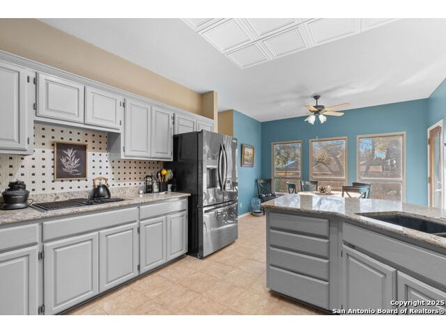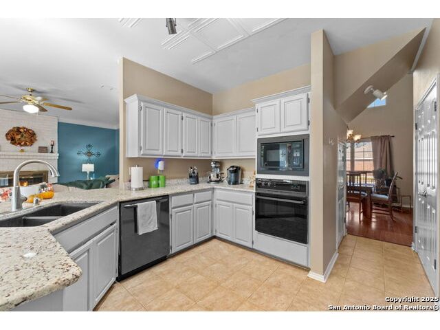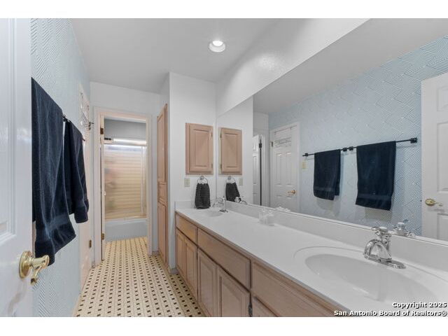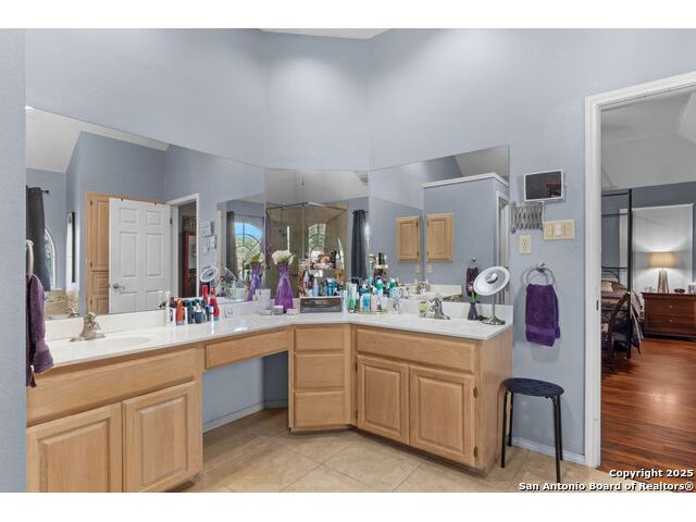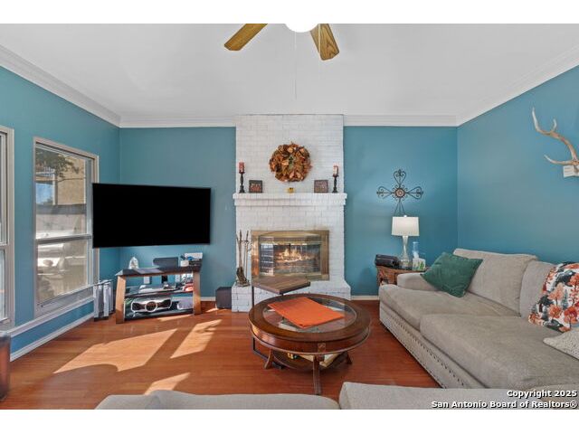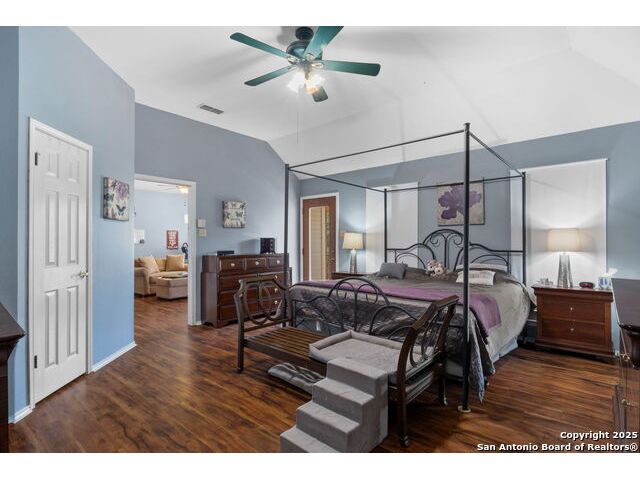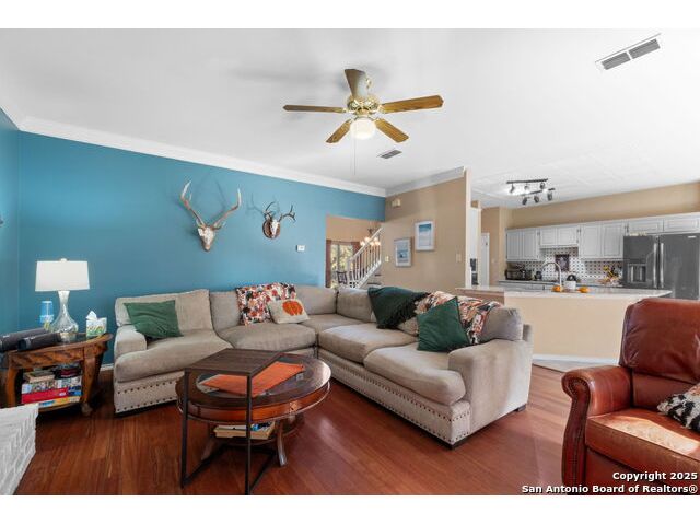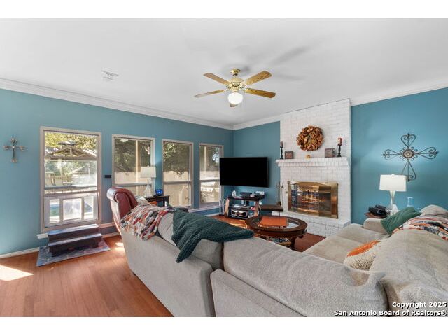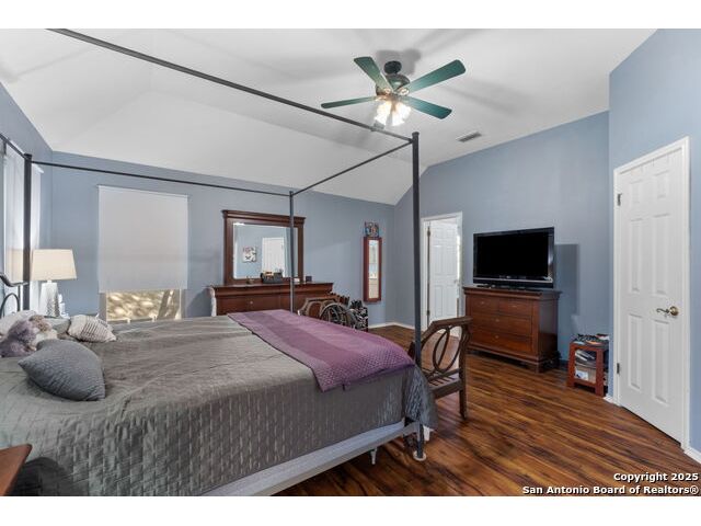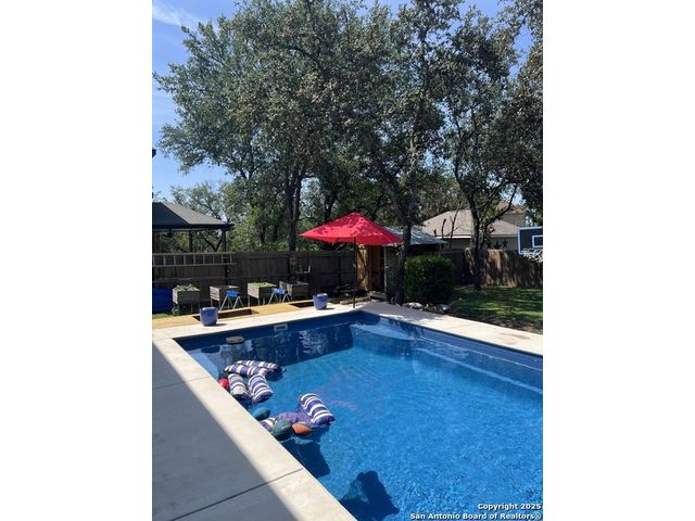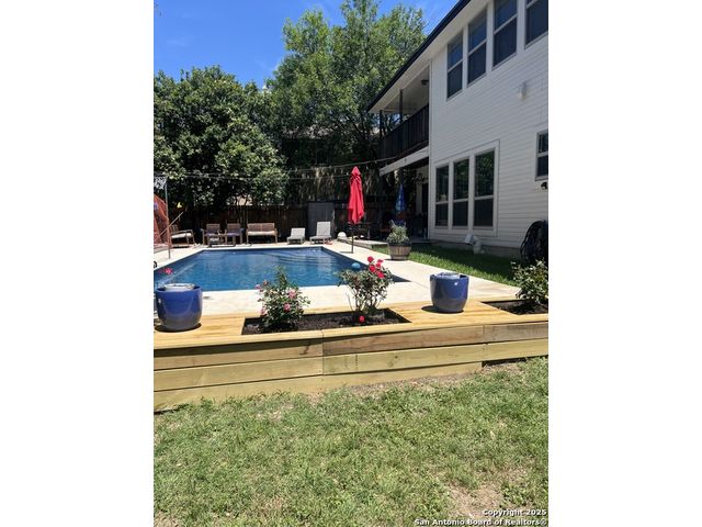 Gorgeous home with a pool in the centrally-located Oaks at Vista del Norte gated community located on a low traffic cul-de-sac. Ideal for a growing family, this beauty offers plenty of space for everyone. The open floorplan with high ceilings and natural light create a wonderful flow. Three living areas including cozy family room with fireplace, downstairs flex office space, plus a formal dining, and a loft game room upstairs. Downstairs fourth bedroom is ideal for generational living or as a guest suite. Generously sized secondary bedrooms upstairs. Beautiful wide-planked wood flooring throughout home. Large primary suite upstairs with access to balcony overlooking a park-like backyard. Enjoy endless Summer days relaxing around the lap pool and picnicking under the pool-side pavilion. Fresh exterior paint in 2025. Roof and HVACs replaced within the past 5 year. Community playground and picnic area. NEISD schools, easy access to Wurzbach Pkwy. and Hwy. 281, insulated from heavy traffic flow. Convenient to shopping and restaurants.
