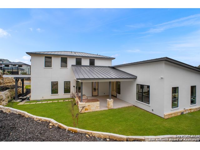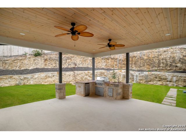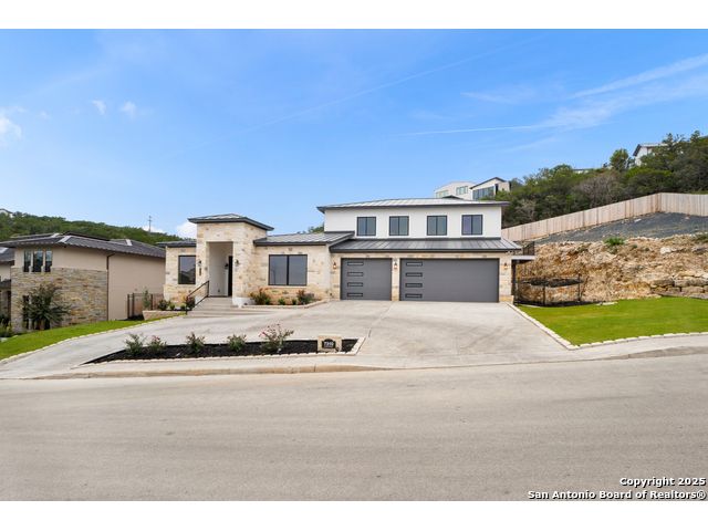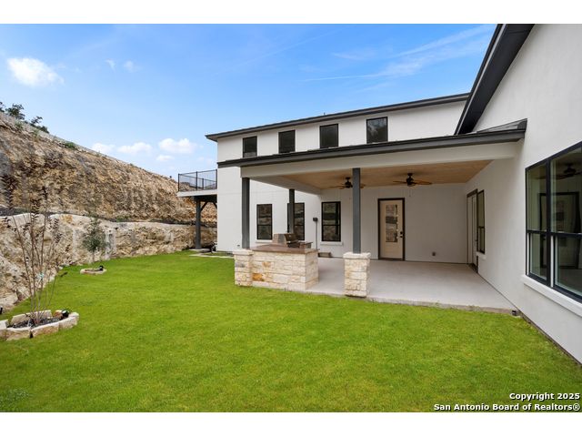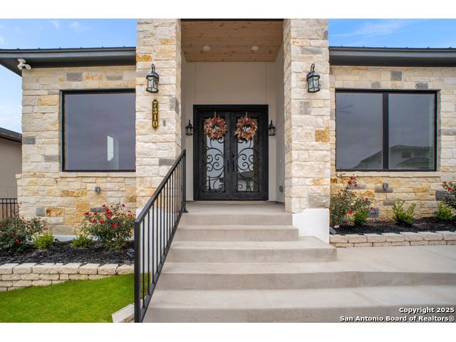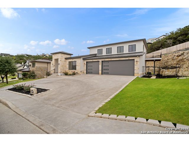 Experience refined living in this custom built, new construction home in the highly coveted, gated community of Cresta Bella. Designed with intention, the home features wide walkways, generous room proportions, lowered switches, and ADA friendly elements, making it ideal for multi-generational living, or hosting visitors who need a comfortable first floor suite. The gourmet kitchen is a centerpiece of style and function, offering abundant custom cabinetry, a beautiful Calacatta Gold quartz waterfall island, and a 48" professional gas range. The open layout flows into the dining and living areas, while a private study with French doors offers the perfect work from home retreat. The main level primary suite is thoughtfully separated for privacy and evokes a spa inspired atmosphere with its oversized shower and a WoodBridge heated whirlpool soaking tub featuring hydromassage and chromatherapy lighting. The expansive primary closet is ready for custom design to suit your lifestyle. A large guest suite on the main level provides comfort and accessibility for guests or live in family. Upstairs, two additional bedroom suites each feature their own ensuite bathrooms, with a private balcony offering Hill Country views. The exceptionally private backyard is spacious enough to accommodate a future pool and includes greenbelt access through a lockable gate. A covered patio with an outdoor kitchen allows for year round entertaining with complete privacy. Ideally located near La Cantera, The Rim, and with seamless access to I-10, this residence offers a rare blend of luxury, privacy, and accessible living in one of San Antonio's most exclusive hilltop communities.
