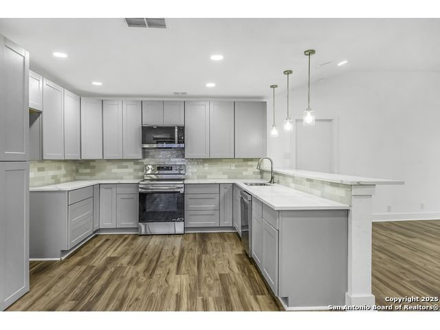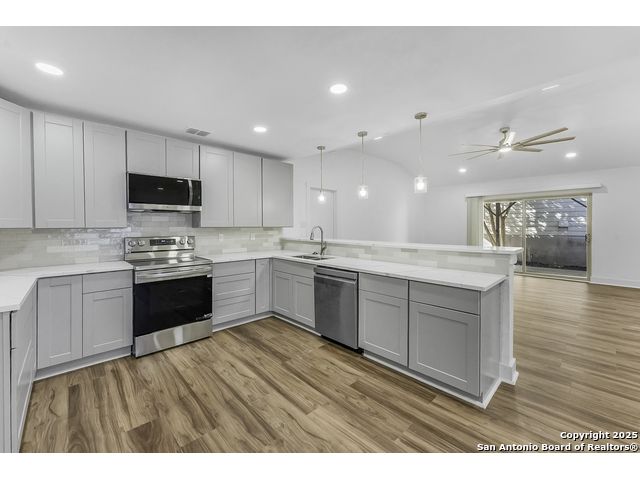 Beautifully Remodeled 1,674 Square Foot Home. This Stunning Single-Story, 3-Bedroom, 2-Bath Home With A 2-Car Garage Offers An Open-Concept Layout Where The Kitchen, Living Room, And Dining Area Flow Together-Creating The Perfect Space For Entertaining Or Everyday Living. The Kitchen Features Pendant Lighting Over The Breakfast Bar, Brand-New Cabinetry, A Subway Tile Backsplash, Quartz Countertops, And New Stainless Steel LG Appliances, Including A Smooth-Top Stove, Over-The-Range Microwave, And Dishwasher. Both The Primary And Secondary Bathrooms Have Been Beautifully Remodeled With Modern, Elegant Finishes And The Split Primary Bedroom Provides Added Privacy And Direct Access To The Backyard. Additional Highlights Include New Exterior Paint, Ceiling Fans In Every Room With Remotes, Updated Lighting And Plumbing Fixtures, Luxury Vinyl Plank Flooring In The Main Areas, Carpet In The Bedrooms, Recessed Lighting, 2-Inch Faux Wood Blinds, And Fresh Interior Paint Throughout. Enjoy The Outdoors With Three Inviting Spaces-The Private Patio Off The Dining Room, The Backyard Patio, Or The Cozy Space Just Off The Living Room- Each Offering The Perfect Spot To Relax Or Entertain. Conveniently Located Near IH-10, Loop 1604, And The Medical Center Area, This Home Is Just Minutes From UTSA, Six Flags, The Rim, And An Array Of Shopping And Dining Options. Offering The Perfect Blend Of Comfort, Style, And Convenience-This Home Truly Has It All.