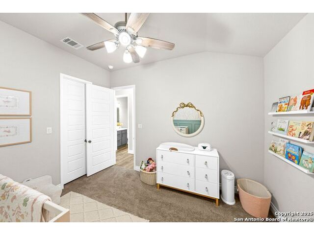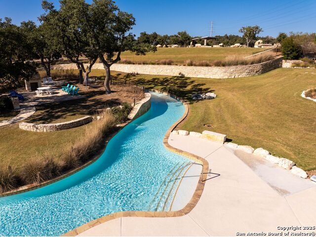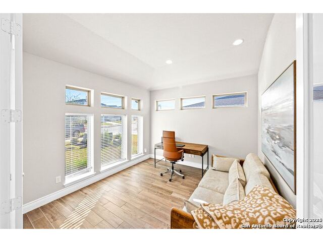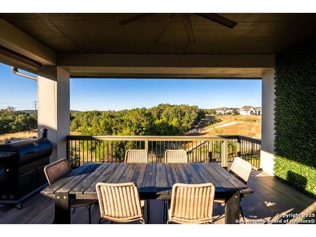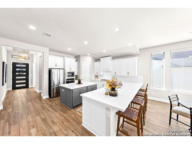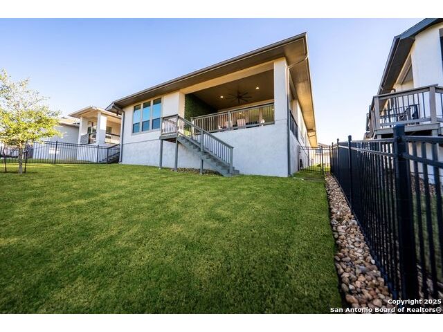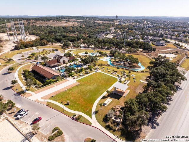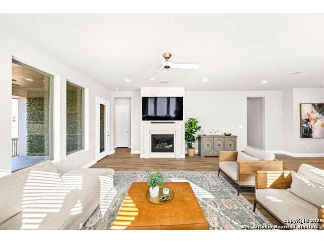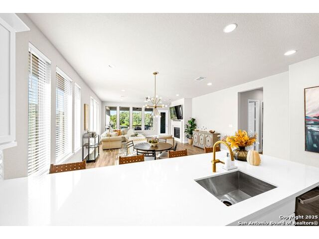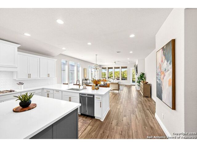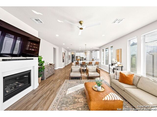 Welcome home to a beautifully crafted single-story Perry home tucked inside a quiet gated community, where every day feels like an escape into Texas Hill Country living. From the moment you step inside, the soft glow of the electric fireplace invites you to imagine cool fall evenings wrapped in a blanket, sipping hot cocoa while watching your favorite show. It is the kind of warmth that makes a house feel like home. The open-concept kitchen is designed for real life. A center island plus a peninsula island means there is always room for everything that happens in a busy household or relax with morning coffee chats, kids doing homework while dinner simmers, friends gathering around for game nights, and that one family member who never leaves the snack bar. Upgraded fixtures and finishes bring just enough luxury to elevate everyday moments. And with wood-look tile throughout and no carpet, life stays clean, simple, and stress-free, even on those muddy-paw, post-soccer-practice days. A formal study sits peacefully at the front of the home, ideal for focused work sessions, Zoom meetings, or transforming into the quiet reading room you have always wanted. At the end of the day, step into your backyard and take in the greenbelt and country views. A calming reminder that you live somewhere special. The privacy, the open sky, the sound of wind moving through the trees... it is the kind of backdrop that resets your mind after long days. Living here means unlocking a lifestyle many dream about. You are just a golf-cart ride away from Herff Ranch Elementary in Boerne ISD, making school drop-offs effortless and even a little fun. Spend weekends floating down the lazy river, letting the kids burn energy at the dog park, or exploring scenic walking and biking trails that wind through nature. And the amenities are unmatched: an 11-acre private club, modern fitness center, upcoming pickleball courts, sand volleyball, multiple resort-style pools, a food-truck court, live music lawns, and more. Every day here feels like a vacation that never ends.