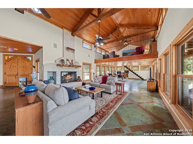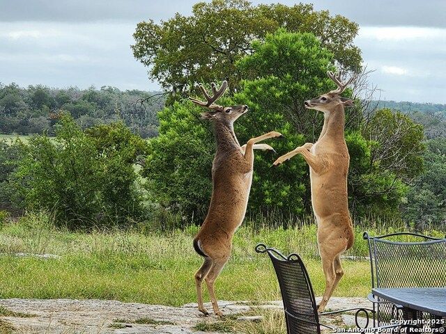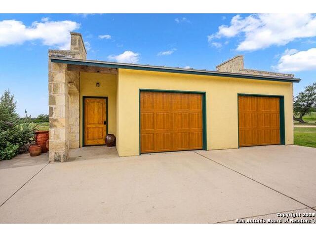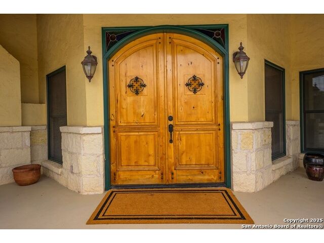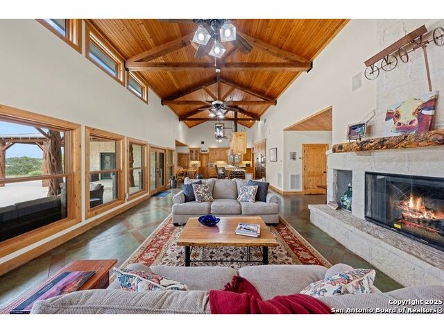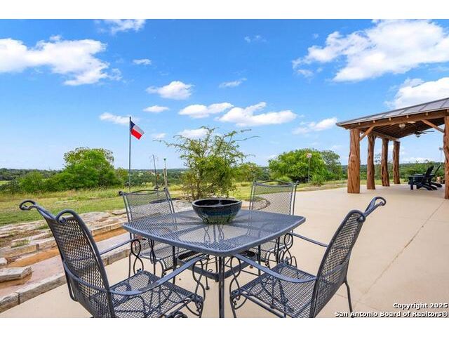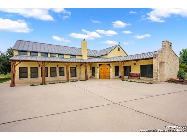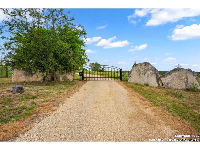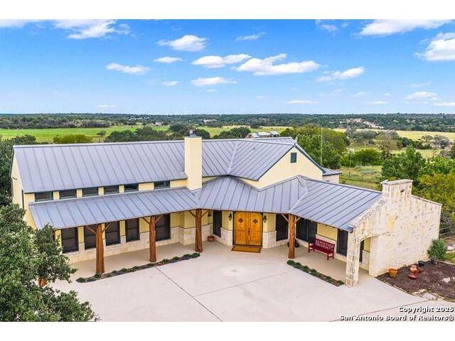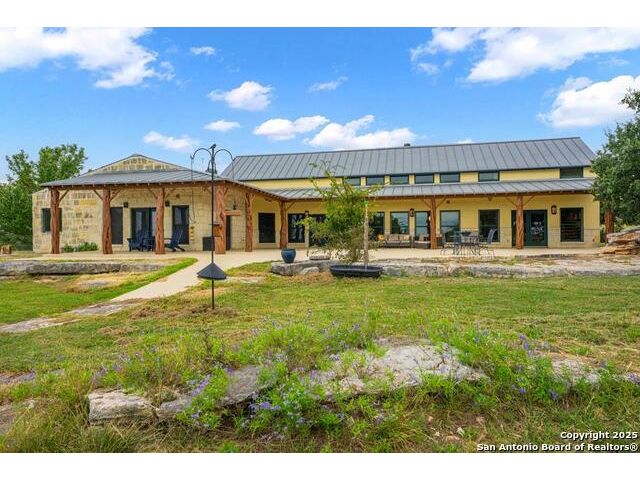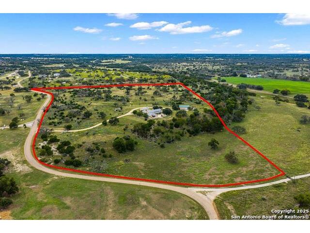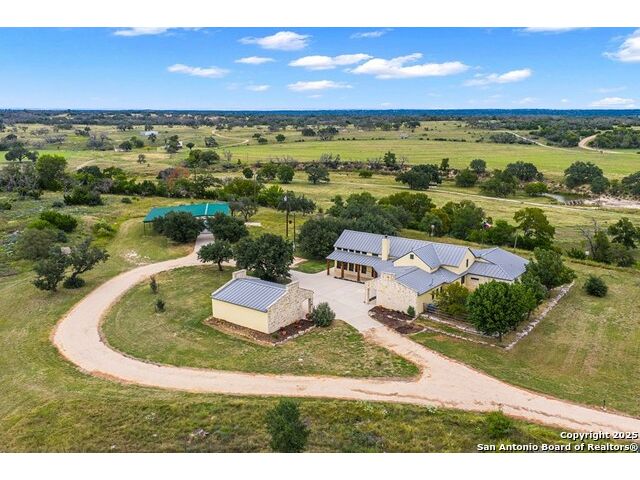 Discover a unique and private retreat nestled on 27.11 acres of pristine, unrestricted, and ag-exempt land. This stunning property offers a rare combination of luxurious living and the untamed beauty of the Texas Hill Country. The residence, set down a winding driveway, allows the surrounding grounds to provide a secluded sanctuary for those seeking tranquility, space, and a connection to nature. Step through the one-of-a-kind custom double front doors into this custom-designed home and be captivated by its bespoke features. The meticulously designed residence includes a great room with a 22-foot ceiling with exposed beams, creating a subtle lodge atmosphere. The open-concept living area is anchored by a magnificent floor-to-ceiling stone fireplace, complete with a custom spalted pecan mantel. A ceramic gas log set adds to the warm and inviting ambiance for gatherings. The heart of the home is a chef's dream, boasting a gourmet kitchen equipped with commercial-grade appliances, ensuring every culinary endeavor is a delight. The home is designed so that you have stunning long-range views from every single window. Wake up to panoramic vistas of rolling hills and watch the vibrant sunrises and sunsets that paint the sky. The seamless integration of the home with its natural surroundings provides a constant sense of peace and wonder. The 27.11 acres are completely fenced and cross fenced with multiple gates offering a secure and private environment. A new, custom main entry gate provides both convenience and peace of mind. The entire property is usable land, making it perfect for a variety of uses, from recreational activities to agricultural pursuits. Nature enthusiasts will be thrilled to know that the land is a haven for exotics, including Axis and white-tail deer, as well as an abundance of turkey and dove and many beautiful songbirds. This creates a unique opportunity for wildlife observation and hunting. The property also includes a 250-gallon propane tank plus a 500-gallon propane tank for added convenience. Beyond the main residence, the property offers exceptional outbuilding(s) designed to accommodate every need. A 31' x 26' detached two-car garage with additional 19'x7' work space provides secure parking, while a spacious 30'x50' insulated metal building with a 25'x50' side awning offers endless possibilities for workshops, storage, or housing a collection of vehicles and equipment. This property is more than a home; it's a lifestyle. With its unparalleled features, stunning views, abundant wildlife, and unrestricted land, this is a rare opportunity to own a true piece of the Texas Hill Country. Don't miss your chance to experience this one-of-a-kind estate.