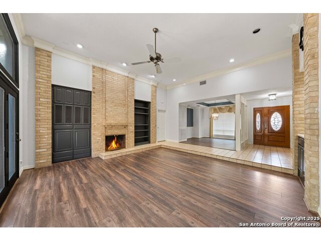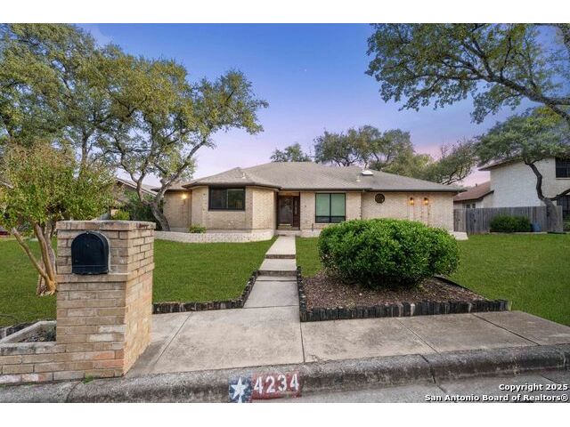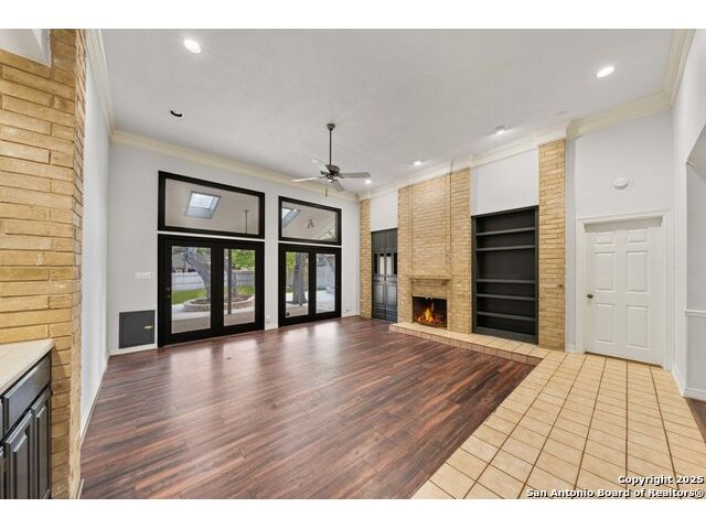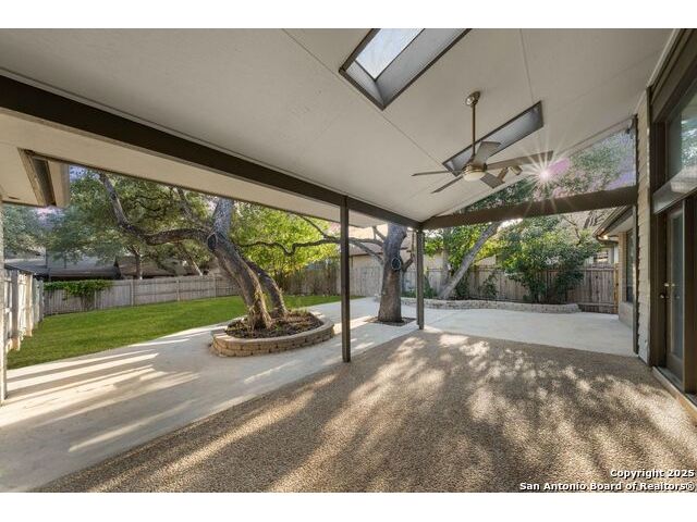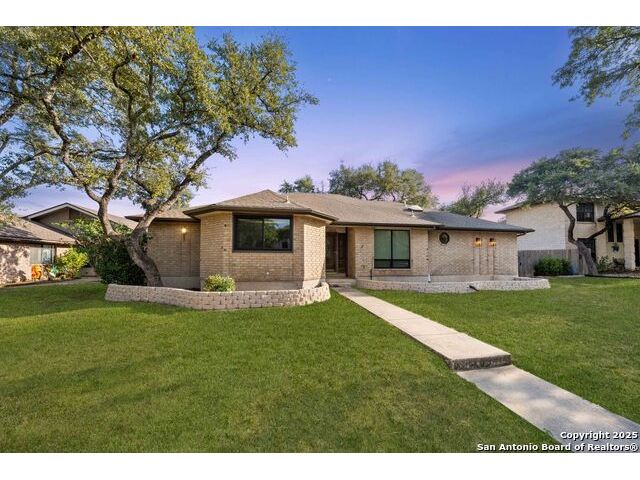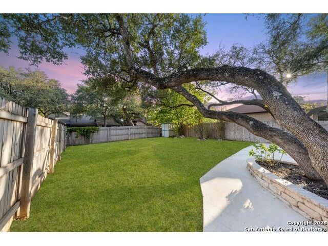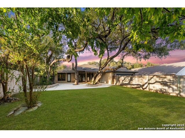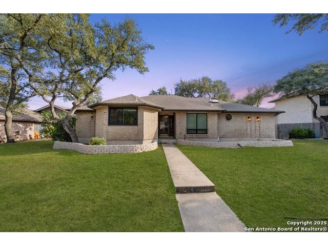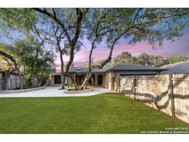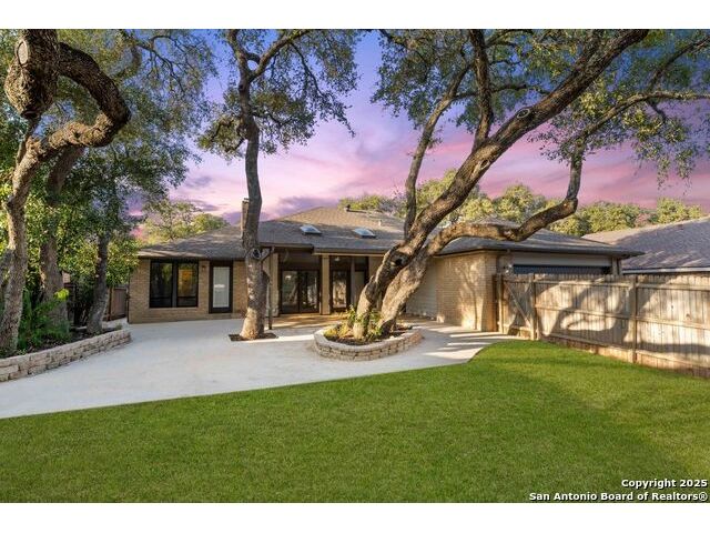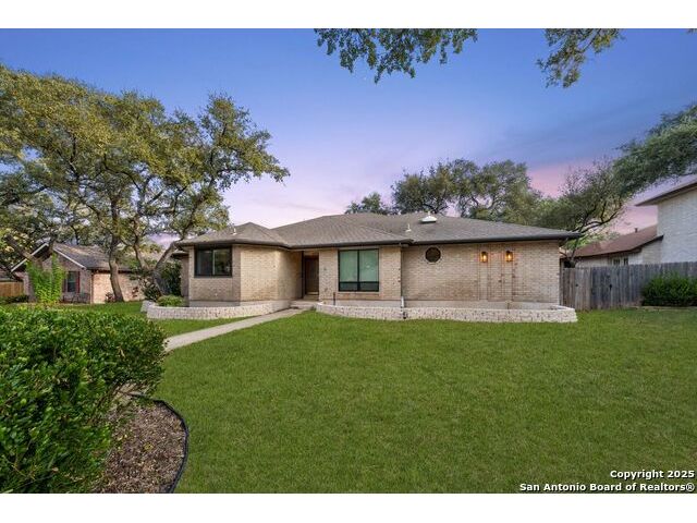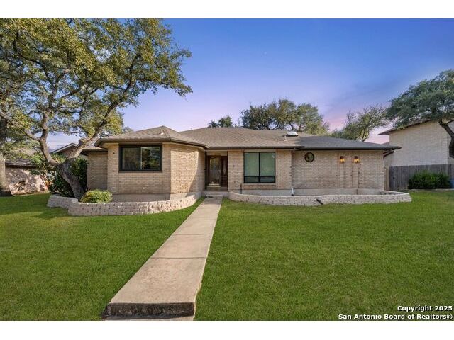 A rare find! Charming 3-bedroom, 2-bath single-story jewel nestled in the highly desirable Woods of Shavano. Nicely situated on a quiet, tree-lined street, this thoughtfully designed 1918 sqft. home strikes a perfect balance of warmth, comfort and easy living. Greeted by an inviting open floor plan, the expansive family room becomes the heart of the home with soaring ceilings, a cozy floor to ceiling brick fireplace, and large windows that fill the space with natural light all day long. The kitchen is ideal for the master chef with a generous island for food prep and storage, plus a built-in beverage fridge that adds a touch of modern convenience. The primary suite, separate from the secondary bedrooms, offers a serene retreat-including a full ensuite bath and a large walk-in closet. The two additional bedrooms are spacious and nicely positioned in the home, adjacent to the modern, chic updated secondary bath. Freshly painted walls and updated flooring (NO CARPET!) throughout offer a pristine, move-in-ready feeling. The large backyard offers space and lots of privacy- no home behind you! The oversized covered patio and recently updated extended concrete slab offers the ideal setting for morning coffee, barbeques and plenty of room to play. The upgraded landscaping elevates the curb appeal and creates a charming, tranquil setting. The attached 2-car garage further enhances this property and opens to the private driveway in the back. Awesome location! Just minutes from the Medical Center, USAA, UTSA, schools, The Rim and The Shops at La Cantera-balancing suburban serenity with city-side accessibility. This home has been lovingly maintained, thoughtfully updated, and it is move-in ready. Don't miss the opportunity to make it yours!