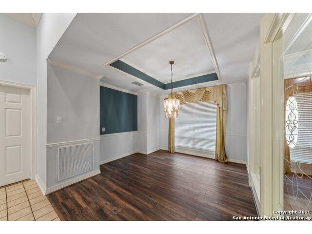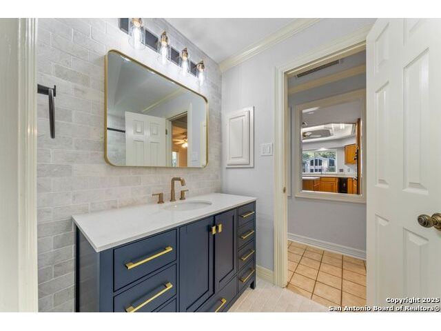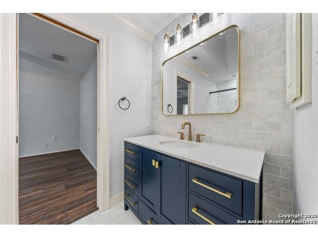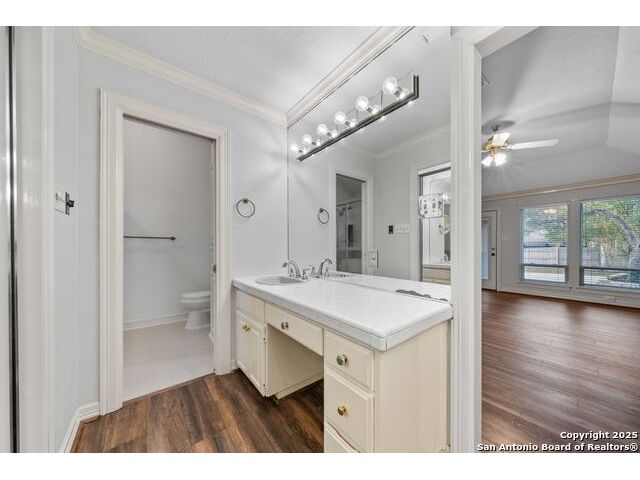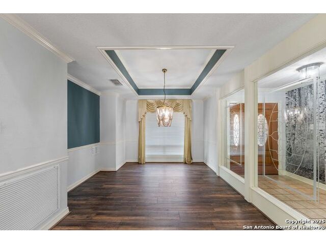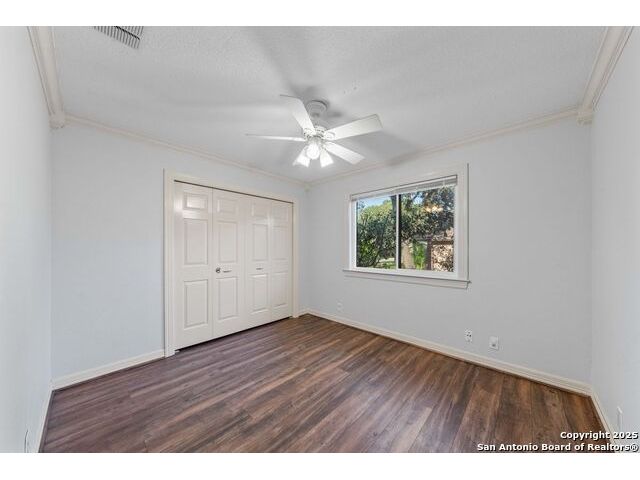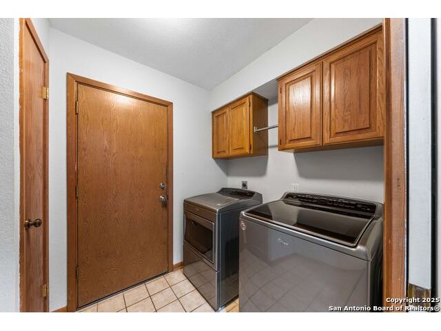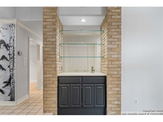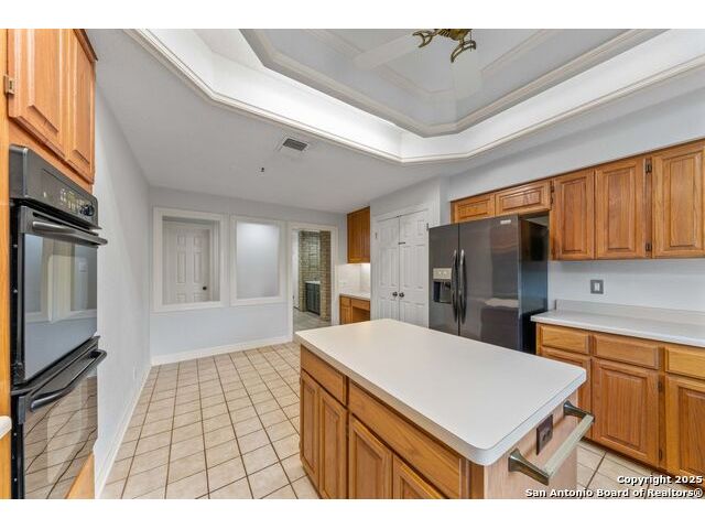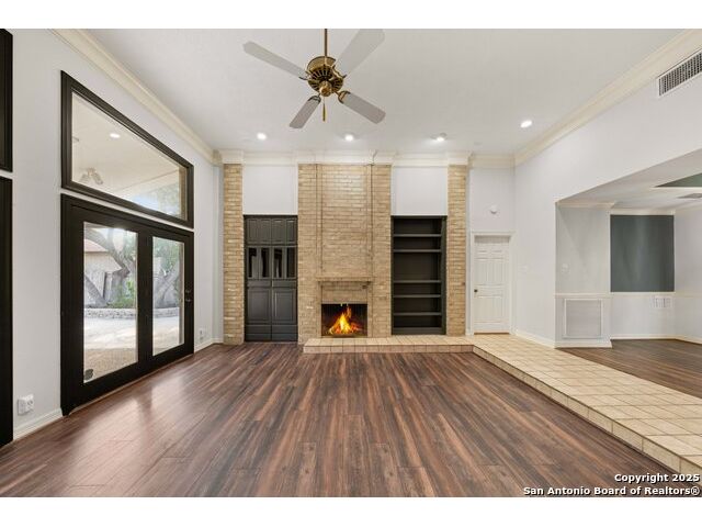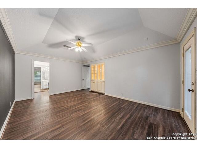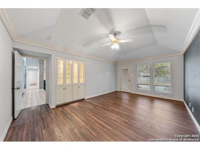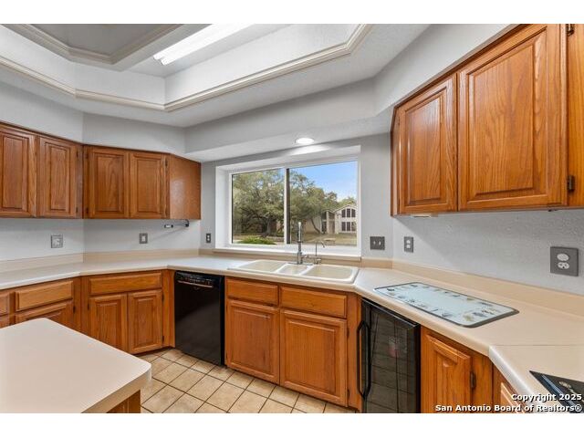 A rare find! Charming 3-bedroom, 2-bath single-story jewel nestled in the highly desirable Woods of Shavano. Nicely situated on a quiet, tree-lined street, this thoughtfully designed 1918 sqft. home strikes a perfect balance of warmth, comfort and easy living. Greeted by an inviting open floor plan, the expansive family room becomes the heart of the home with soaring ceilings, a cozy floor to ceiling brick fireplace, and large windows that fill the space with natural light all day long. The kitchen is ideal for the master chef with a generous island for food prep and storage, plus a built-in beverage fridge that adds a touch of modern convenience. The primary suite, separate from the secondary bedrooms, offers a serene retreat-including a full ensuite bath and a large walk-in closet. The two additional bedrooms are spacious and nicely positioned in the home, adjacent to the modern, chic updated secondary bath. Freshly painted walls and updated flooring (NO CARPET!) throughout offer a pristine, move-in-ready feeling. The large backyard offers space and lots of privacy- no home behind you! The oversized covered patio and recently updated extended concrete slab offers the ideal setting for morning coffee, barbeques and plenty of room to play. The upgraded landscaping elevates the curb appeal and creates a charming, tranquil setting. The attached 2-car garage further enhances this property and opens to the private driveway in the back. Awesome location! Just minutes from the Medical Center, USAA, UTSA, schools, The Rim and The Shops at La Cantera-balancing suburban serenity with city-side accessibility. This home has been lovingly maintained, thoughtfully updated, and it is move-in ready. Don't miss the opportunity to make it yours!