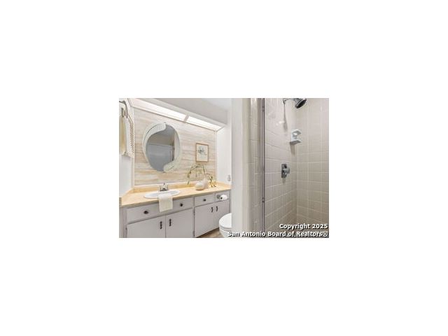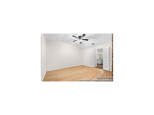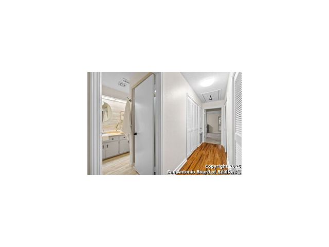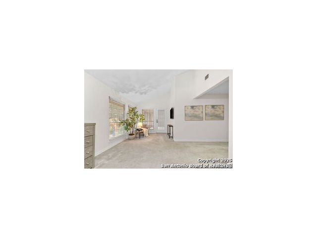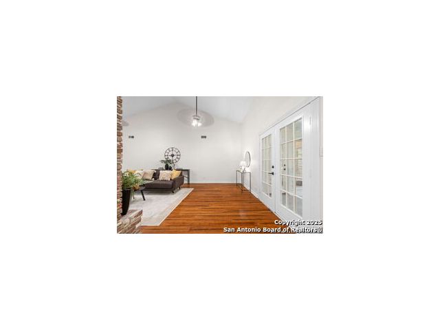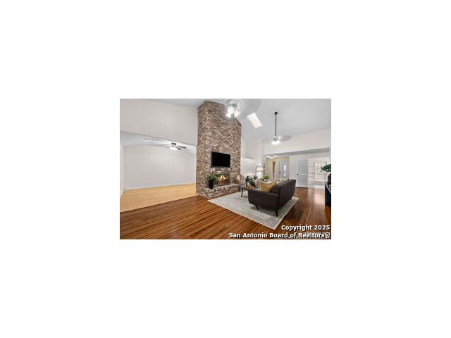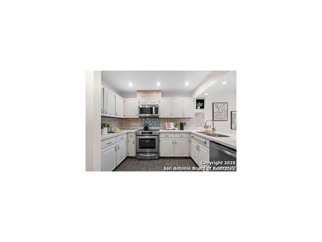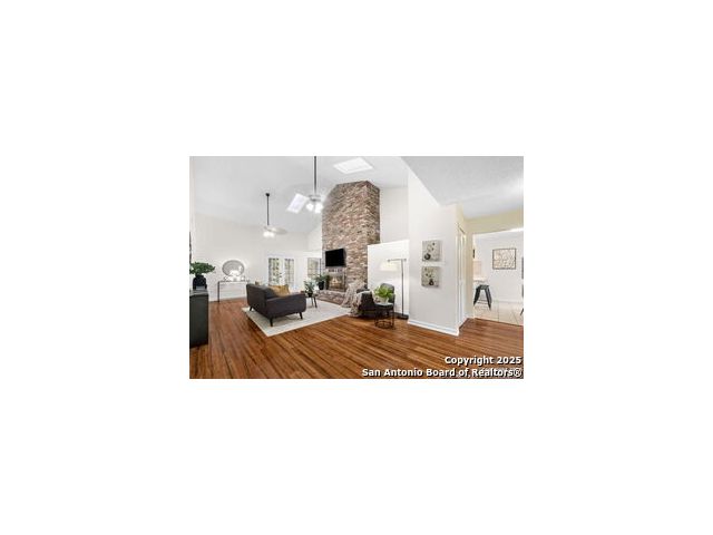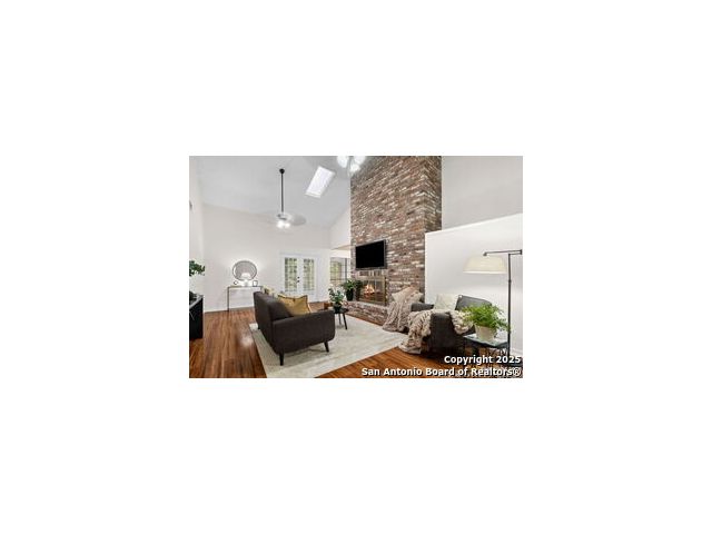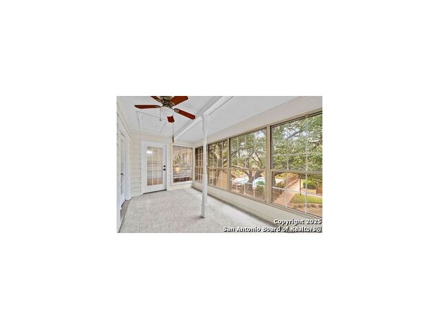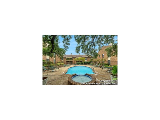 Welcome to sophisticated living in this stunning two-bedroom, two-bathroom + private office condo that perfectly balances luxury and comfort in one of San Antonio's most desirable gated communities. This meticulously maintained residence spans 1,960 square feet of thoughtfully designed space, featuring soaring ceilings that create an impressive sense of grandeur throughout. The heart of this home showcases a custom upgraded kitchen equipped with stainless steel appliances, complemented by high-end luxury bamboo flooring that flows seamlessly through the living areas. Two distinct eating areas provide flexibility for both casual dining and formal entertaining, while the floor-to-ceiling wood burning fireplace serves as a captivating focal point. The spacious primary suite offers a private retreat with oversized his and hers walk-in closets, ensuring ample storage for the most discerning wardrobe. High-end upgrades and recessed lighting enhance the sophisticated atmosphere throughout the residence. Step outside to your enclosed back patio sunroom, where you can enjoy pool views while surrounded by the community's lush landscaping. The custom finished attic with temperature control provides additional storage or workspace possibilities, adding valuable functionality to this already impressive home. Located within an exclusive, private community with gated access, residents enjoy beautifully maintained grounds and peaceful surroundings. The prime location offers convenient access to Northeast Baptist Hospital, Loop 410, and sits just minutes from the airport, diverse dining options, and excellent shopping destinations. This exceptional condo represents an opportunity to embrace upscale living in a community that values privacy, quality construction, and attention to detail throughout. Two covered parking spaces are located directly in front of unit offering convenience and ease. All stainless steel appliances convey with washer & dryer as well. Set up a showing today!
