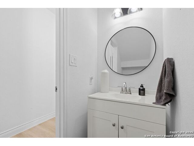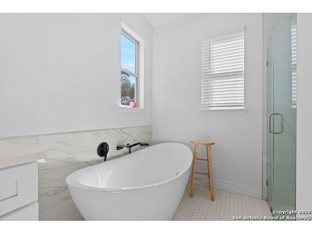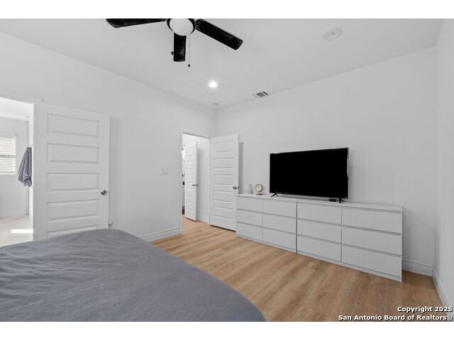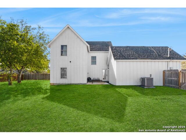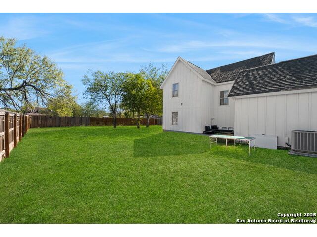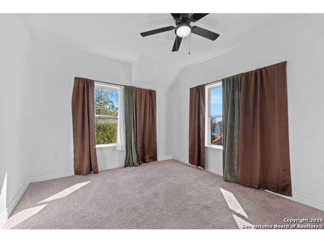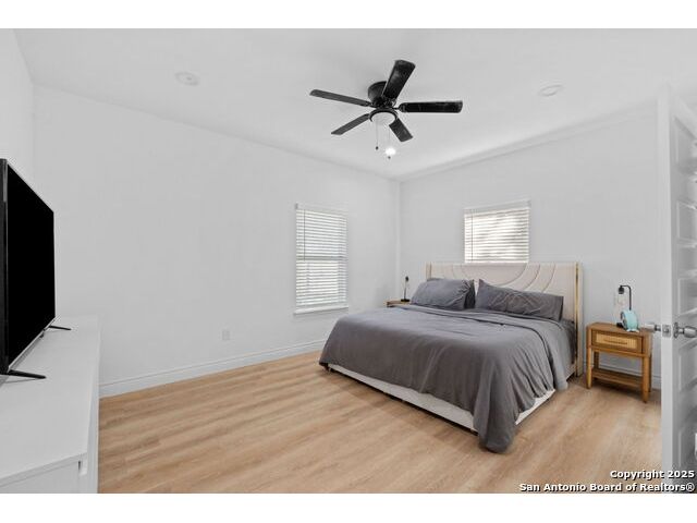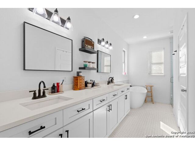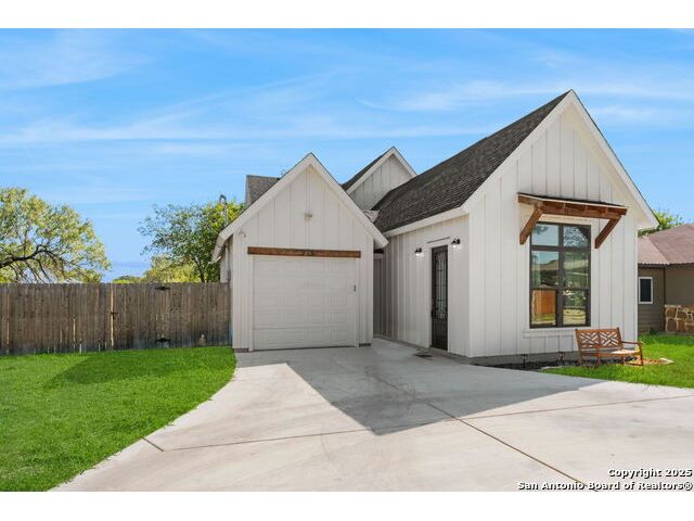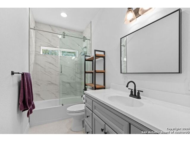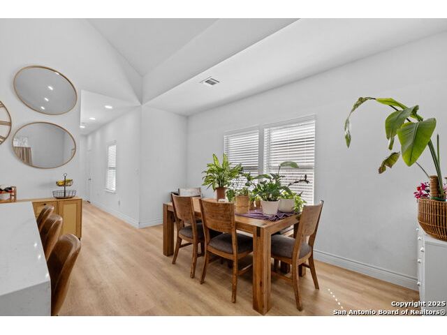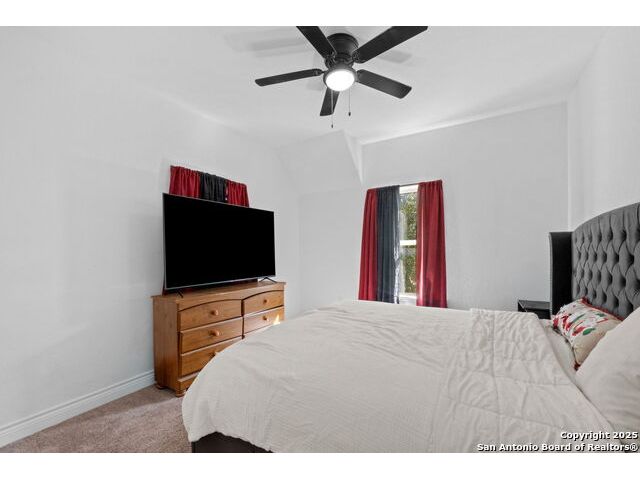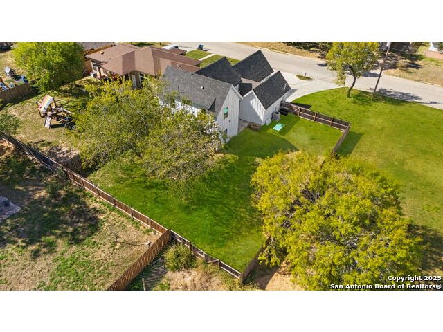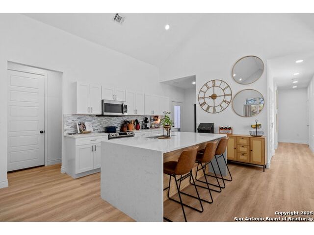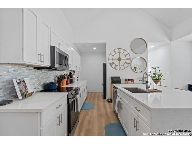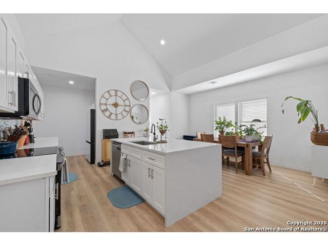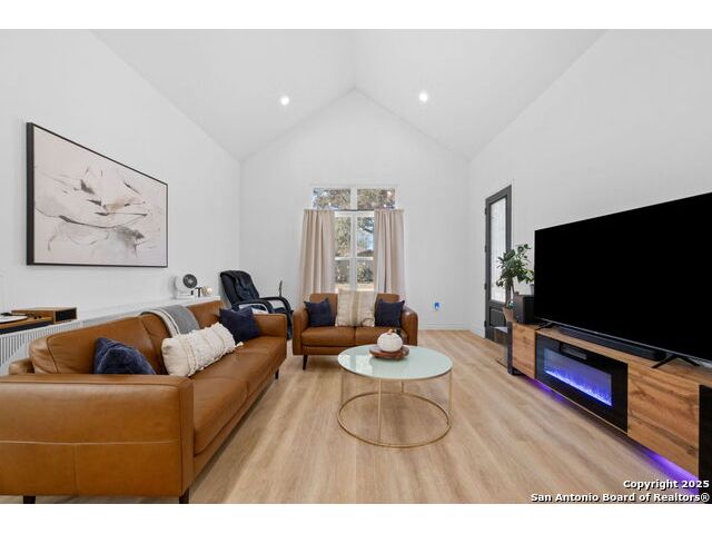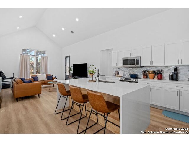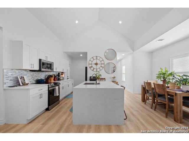 Step inside a thoughtfully designed two story home featuring soaring vaulted ceilings accented by recessed lighting. The open concept layout creates a bright and inviting atmosphere, enhanced by generous window placement throughout. A versatile flex room provides an excellent option for an office or creative workspace. The kitchen serves as a striking focal point with a waterfall edge quartz island, a breakfast bar, stainless steel appliances that blends style with everyday function. The downstairs primary suite offers a relaxing retreat with a separate shower, a garden tub, double vanities, and a spacious walk in closet complete with built in shelving. Upstairs and down, the home reflects careful maintenance and a modern feel throughout. Situated in Poteet, known for its unique local charm and convenient access to San Antonio, the location also places you within walking distance to the Strawberry Festival grounds, adding to the appeal of the setting.