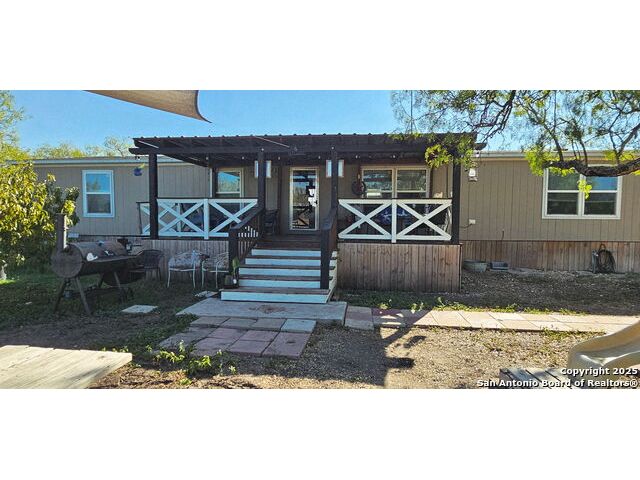 Escape to this ideal Quiet country living home Nestled on almost 3 acres (2.5 acers) providing both privacy and space for all your lifestyle needs. Cleared and level and fenced, ready for your dream custom life in your new home. Enjoy paved road frontage and to convenient access to two major highways (IH-37 and Hwy 97), facilitating a convenient commute to Pleasanton 5M, Floresville 20M, or San Antonio 35M. The lot is approximately 325 feet wide and 360 feet deep, Paved roads and entry to subdivision adding character and curb appeal to the exterior. Home offers roomy open floor plan with split bedroom design. This charming home combines elegance and comfort with thoughtful design. Inside, you'll find beautiful real wood cabinets and detailed crown molding throughout, creating a cohesive and timeless look in every room. The spacious kitchen is a standout feature, complete with a large pantry, Island kitchen that provides ample space for cooking, meal prep, and entertaining. An Office for those who like to work from home. Hardwood floors. Utility inside. Step outside to enjoy the inviting front porch deck, perfect for morning coffee or greeting guests, or family, ideal for relaxing or hosting gatherings while overlooking the peaceful surroundings. Storage/workshop building, pole barn/a shed plus a carport. Property is fenced Therefor home is further enhanced by adding your pets in this new home like up to 2 horses. This property offers the perfect combination of indoor elegance and outdoor tranquility, Set your appointment today.