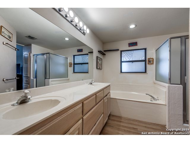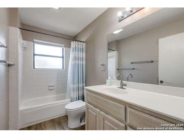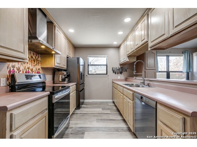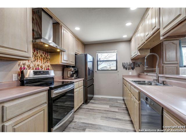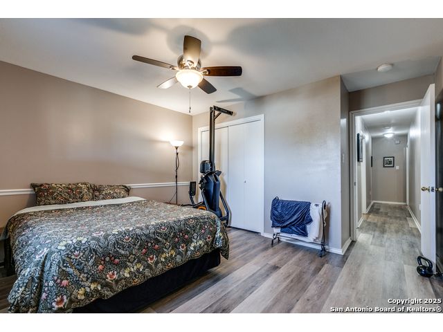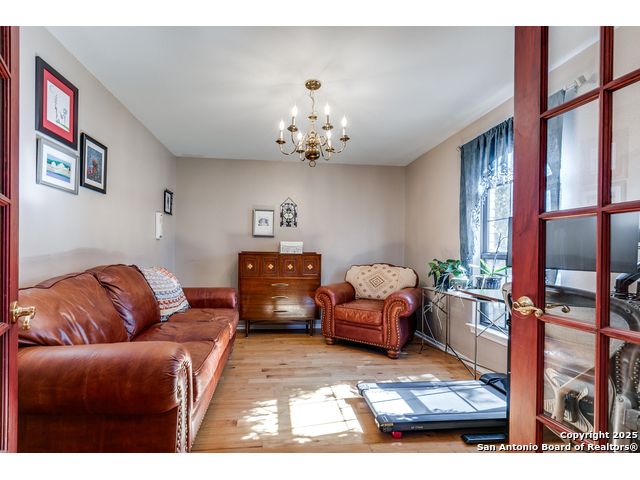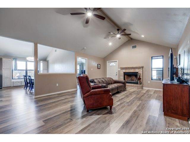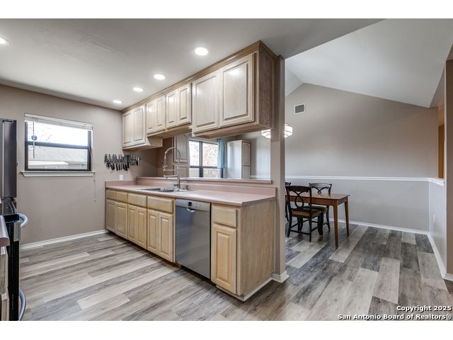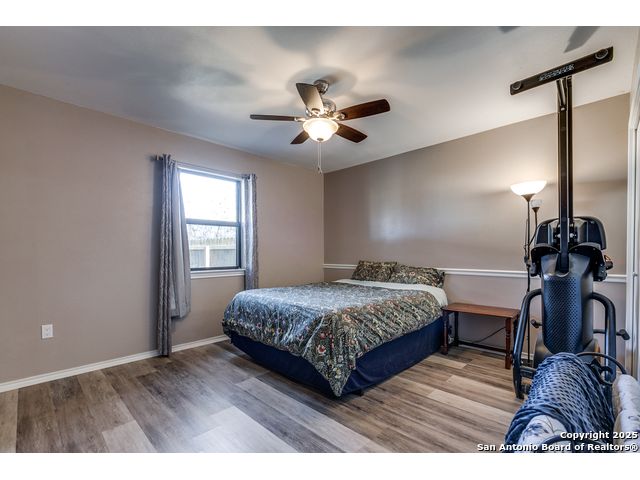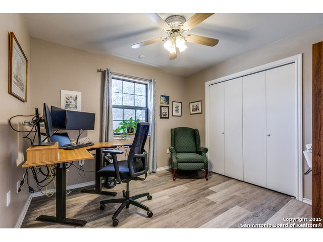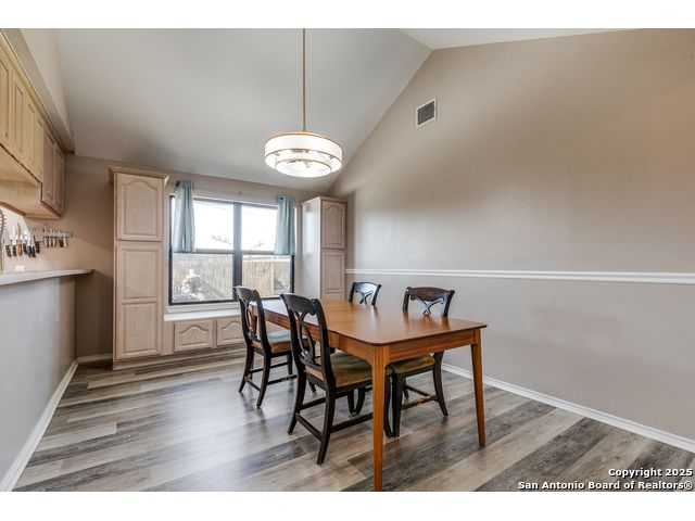 This updated 3-bed home in San Antonio sits on a rare double corner lot with no HOA, RV access, and a huge covered patio-perfect for outdoor living. Inside, you'll find 2 full baths, a flexible study, and vaulted ceilings across a 2,260 sq ft carpet-free layout. The living area offers wood and laminate floors, a fireplace, and separate dining with upgraded lighting. The kitchen includes recessed lighting, vent hood, a California Closet pantry, and a Frigidaire induction range with air fryer. Recent updates: 2024 roof and gutters, 2021 HVAC, new windows in the kitchen and dining, storm door, and low-flow toilets in both baths. A brand-new shed adds even more storage. The side-entry garage and extra driveway space provide easy parking for your boat, trailer, or RV. Located in Crestlake and zoned to East Central ISD, this home is also walking distance to Sinclair Elementary.