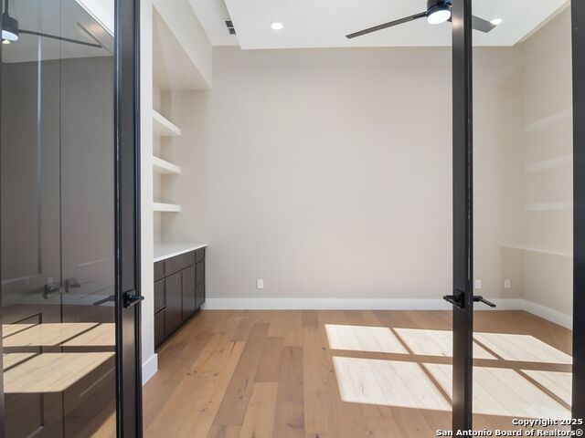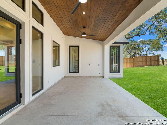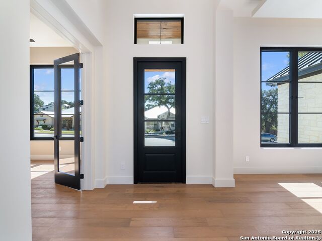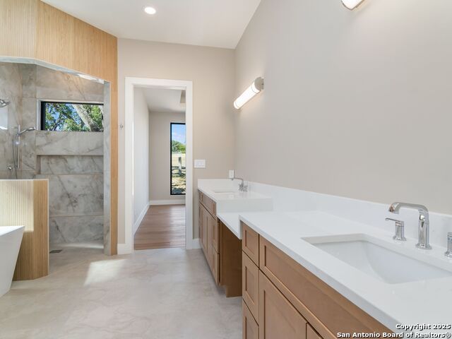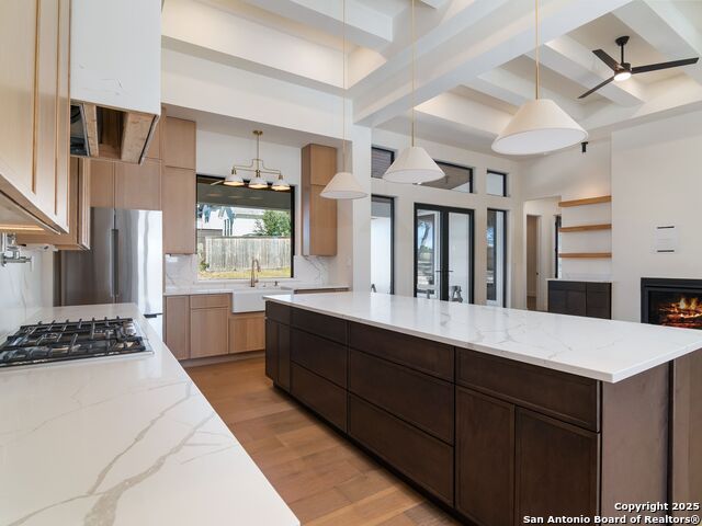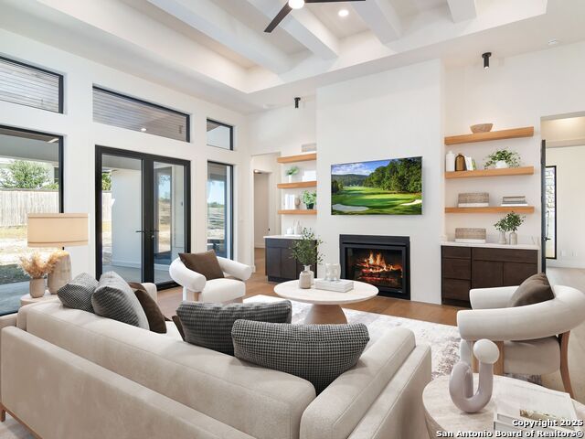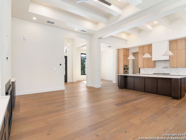 New construction and refined contemporary design come together in this impeccably crafted single-story estate. The open layout is bright and inviting, wrapped in walls of windows that highlight the home's elevated finishes, including hand-scraped hardwood floors, designer lighting, and custom ceiling treatments. The chef's kitchen centers the home with its oversized island, professional-grade stainless steel appliances, gas cooking, floating shelves, and built-in cabinetry, all opening seamlessly to the family room. The primary suite offers a true retreat with a spa-inspired bath featuring a soaking tub, walk-in shower, and a generously sized closet with extensive built-ins. A dedicated office sits toward the front of the home, while the additional guest bedrooms provide comfort, space, and thoughtfully finished details. Outdoors, a large covered patio creates a quiet, private setting ideal for relaxing or entertaining.