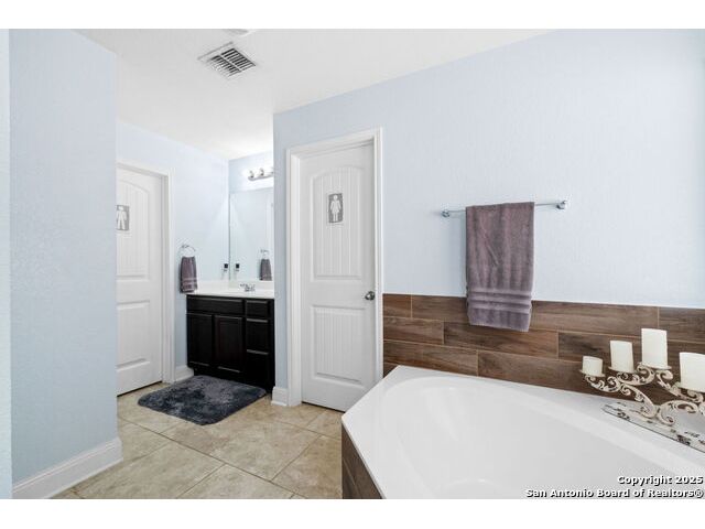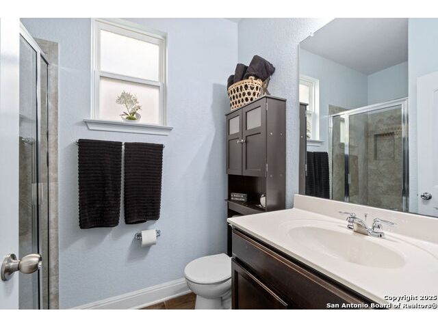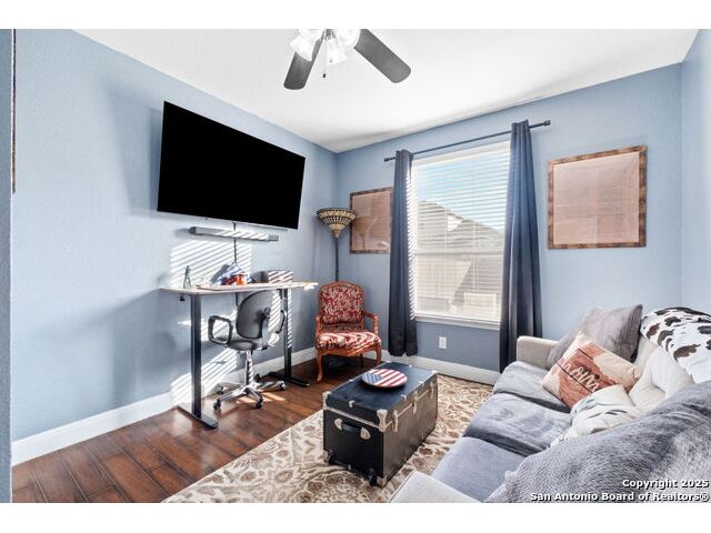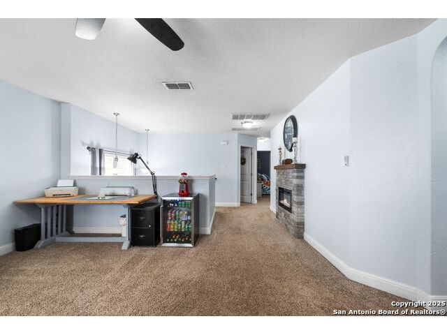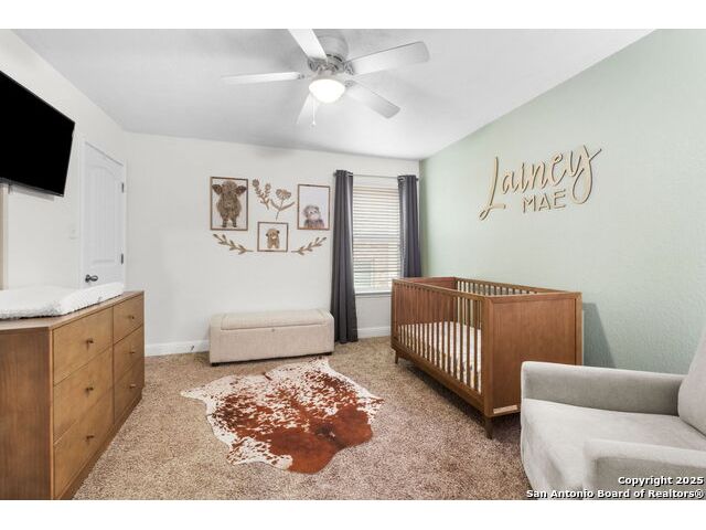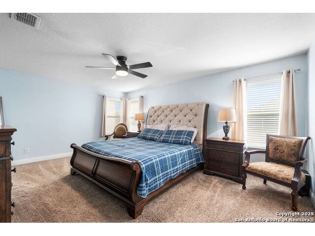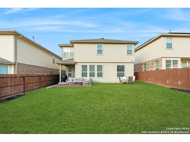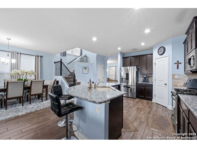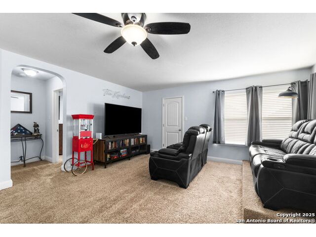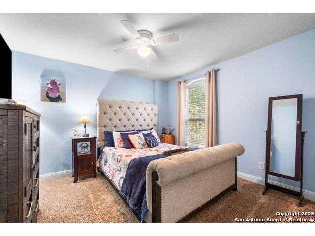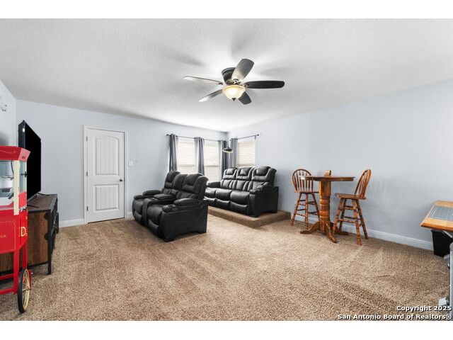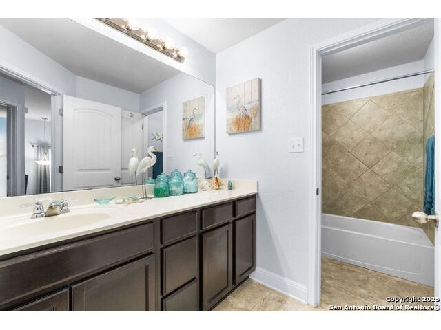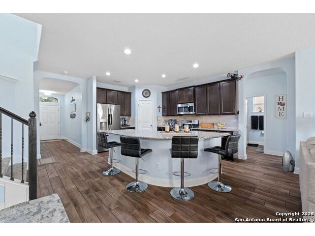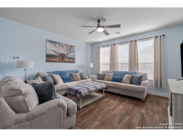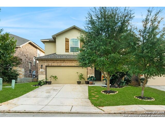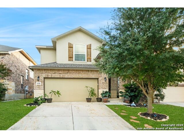 Set in the Wortham Oak neighborhood, this well maintained home combines comfort, style, and convenience. Wood like tile floors, arched entryways, and abundant natural light create a warm and cohesive feel the moment you step inside. The open kitchen features granite countertops, stainless steel appliances, tall dark cabinets, and a spacious island with a rounded breakfast bar. It connects effortlessly to the main living area, making everyday living and gatherings easy. A flexible downstairs bedroom offers the option for a private office or guest suite, and the main level also includes a dedicated laundry room. Upstairs, a beautiful handrail leads to four rooms including the primary suite, which offers two separate closets and dual separate vanities along with a separate tub and shower. A large game room adds additional space for relaxation or entertainment, complete with a mock stone fireplace that adds charm and character. Recent improvements include a new roof, upgraded ceiling fans, and a painted two car garage. The backyard offers a covered patio, an extended concrete slab, and a privacy fence. Neighborhood amenities include two pools, a clubhouse, and a playground. An elementary and middle school are located just outside the neighborhood gate, making mornings easier and afternoon pickups more convenient. The location provides quick access to Loop 1604 and Highway 281 and is conveniently close to Live Oak and IKEA. Randolph Air Force Base and Fort Sam Houston are a short commute away, and the property is located within Judson Independent School District.
