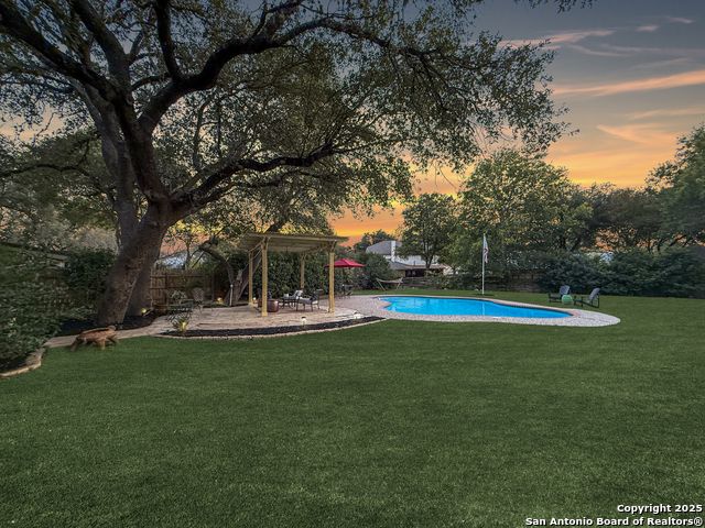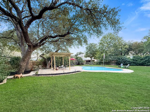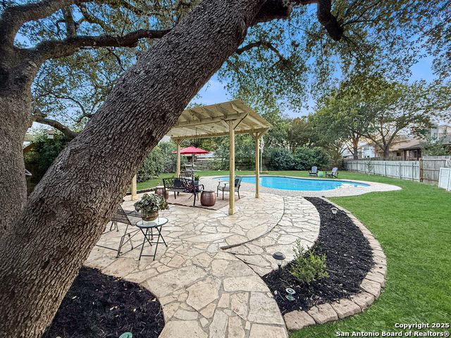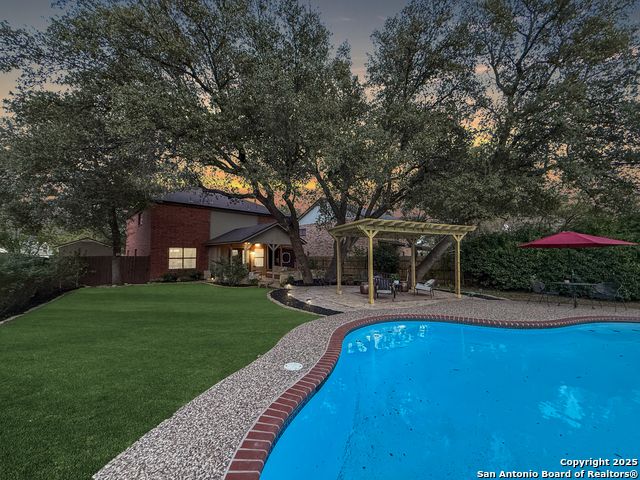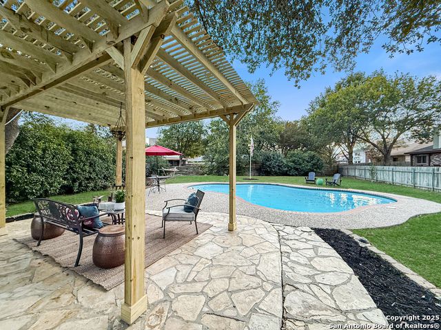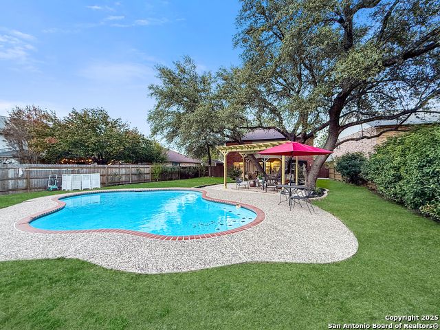 **Open House Saturday 11/29 11-3pm** If your dream backyard feels like a vacation you don't have to pack for, this home is calling your name. Sitting on just over a quarter acre, the outdoor space steals the show: a sparkling pool, a breezy covered patio with a ceiling fan, a stone path tucked between lush green views, and a brand-new pergola waiting for slow mornings and late-night conversations. There's even a storage shed tucked away on the side yard. Inside, the home is clean, bright, and updated throughout with brand-new stainless appliances, waterproof luxury vinyl plank flooring (no carpet!), and fresh interior paint. All bedrooms are upstairs, and the primary suite is surprisingly spacious, featuring recessed lighting, a soaking jet tub, separate shower, a recently updated vanity with anti-fog lighted mirrors, and a walk-in closet with built-ins that actually makes sense.This home lets you escape without leaving town. The outdoor space gives you room to breathe, relax, and reset while the location puts you minutes from UTSA, 1604, I-10, The Rim, and La Cantera. It's convenience without compromise. Roof (2024), HVAC (2022), and Water heater (2024). Washer, dryer, and fridge convey.