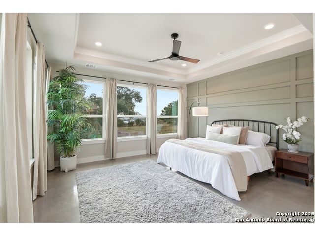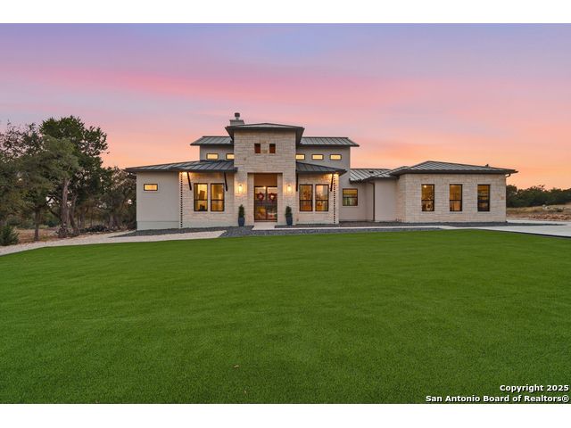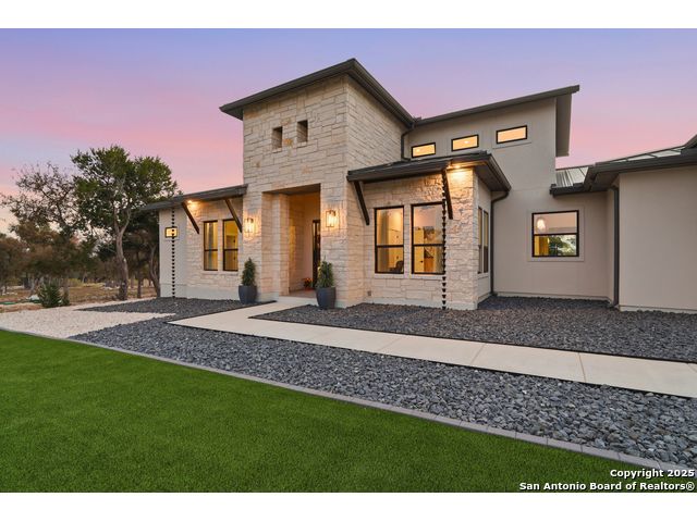 Welcome to this stunning Weston Dean custom home nestled within the guarded gates of the prestigious Copper Ridge community. This single-story masterpiece blends luxury, comfort, and impeccable design at every turn. Step through the grand oversized metal door and into an inviting living space filled with natural light from a striking wall of windows. The open-concept layout showcases soaring ceilings, a gas fireplace, and effortless transitions to the expansive covered patio-perfect for seamless indoor-outdoor living. The gourmet kitchen is a showstopper, featuring sleek quartz countertops, timeless designer backsplash, upgraded custom cabinetry, generous island, stainless steel appliances, and a hidden walk-in pantry. A dedicated office, game room, and attached media room-pre-wired for surround sound-offer exceptional flexibility for work, play, and entertainment. The split floor plan provides added comfort and privacy for guests. Throughout the home, oversized windows, elegant tray ceilings, & custom trim work elevate the architectural sophistication. The primary suite serves as a serene retreat with peaceful views of the beautifully xeriscaped backyard. The spa-inspired en-suite bath boasts a luxurious walk-in shower, impressive double vanity, modern finishes, and separate walk-in closets. Outdoor living is equally impressive. The covered patio is pre-plumbed for a future outdoor kitchen with gas, water, and electrical already in place. A pre-wired sound system extends to both the patio and the primary suite, while Cat5 wiring throughout supports a connected lifestyle. Low-maintenance artificial turf-totaling 4,500 sq. ft. across the front and back yards-ensures beauty and ease year-round. The 2.5-car garage includes a 50AMP plug for EV or RV charging, and the property features a 500-gallon propane tank, offering flexibility for a future pool. With its resort-style amenities and upscale Hill Country setting, Copper Ridge continues to be one of New Braunfels' most desirable neighborhoods-making this home a standout opportunity.