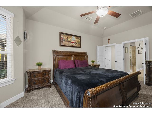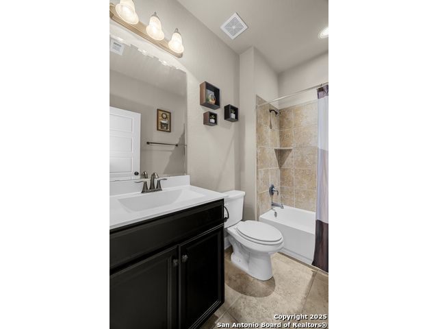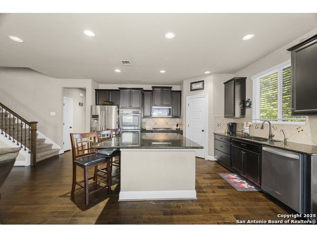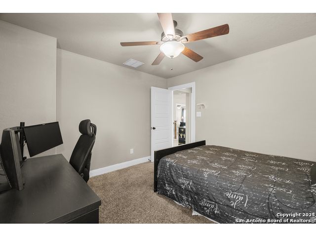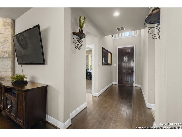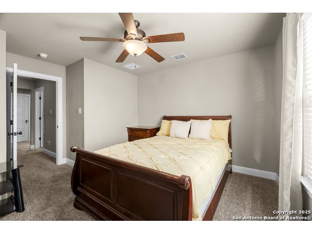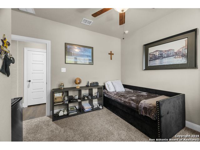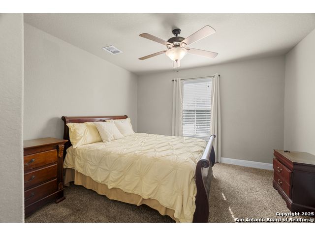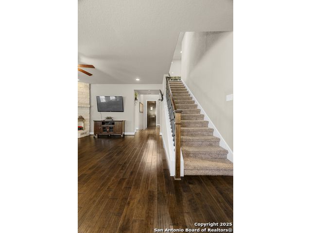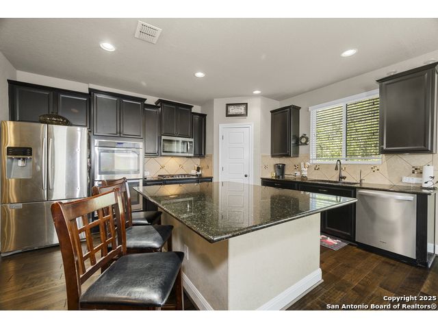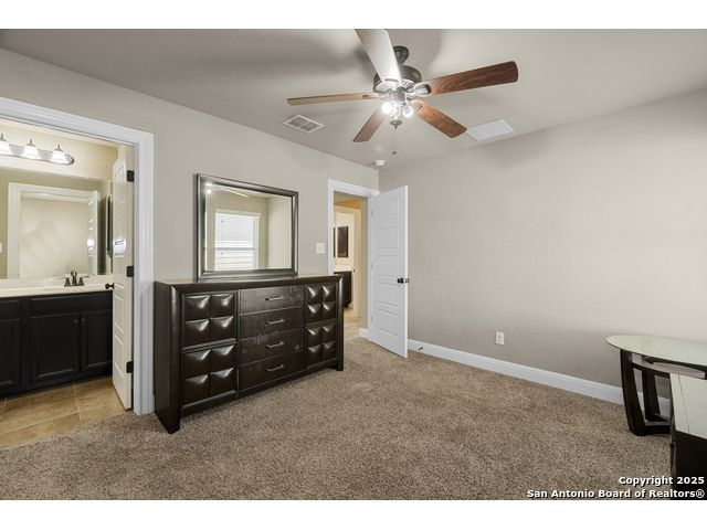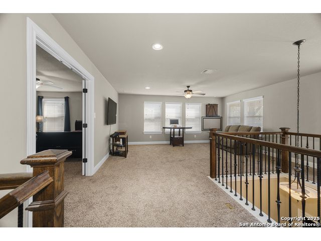 Stunning 5-bedroom, 4-bath home nestled in a quiet gated community in the heart of Far West San Antonio! This spacious property offers an exceptional layout featuring two bedrooms on the main level, including a luxurious primary suite with a charming bay window, an expansive spa-style bath with a garden tub, oversized walk-in shower, and a massive walk-in closet. The huge gourmet island kitchen impresses with extensive granite countertops, 42" cabinetry, generous storage, and abundant prep space-perfect for cooking and entertaining. The kitchen opens to the inviting family room, highlighted by a beautiful stone fireplace and hardwood floors that extend throughout the first floor. Upstairs, you'll find three large secondary bedrooms, two additional full baths, and an oversized game room with outdoor access to a private second-story balcony-ideal for relaxing and watching the sunset. A versatile flex room can be used as a media room, home office, or fitness space. Step outside to a peaceful backyard featuring a beautiful mature Magnolia tree, a covered patio, full sprinkler system, whole-house water filtration/softener, and the added privacy of no rear neighbors. Taft High School sits conveniently behind the home with a buffer for privacy. This small, well-maintained gated community offers fantastic amenities, including a swimming pool, basketball court, clubhouse, BBQ/picnic area, playground, park, tennis court, and exercise room. Perfectly located near Loop 1604-with quick access yet no heavy traffic-this home offers both convenience and tranquility.
