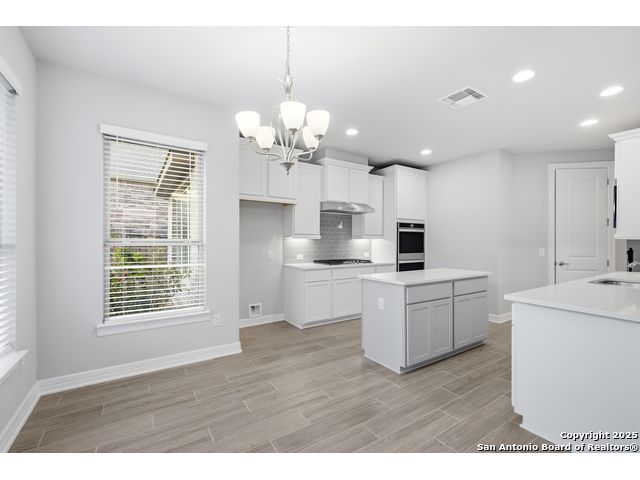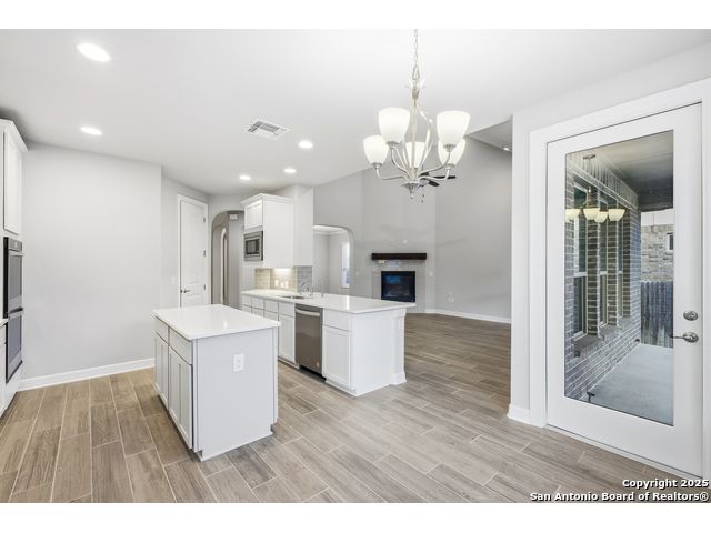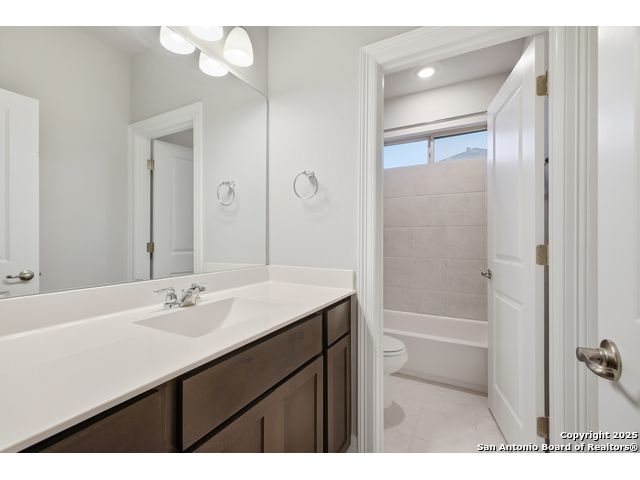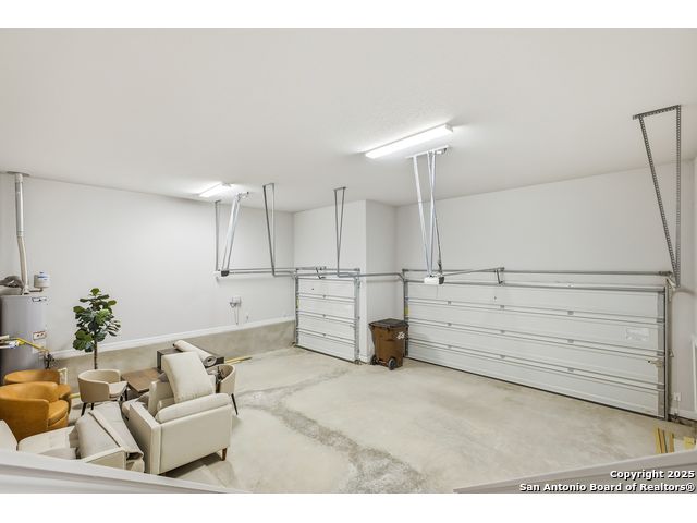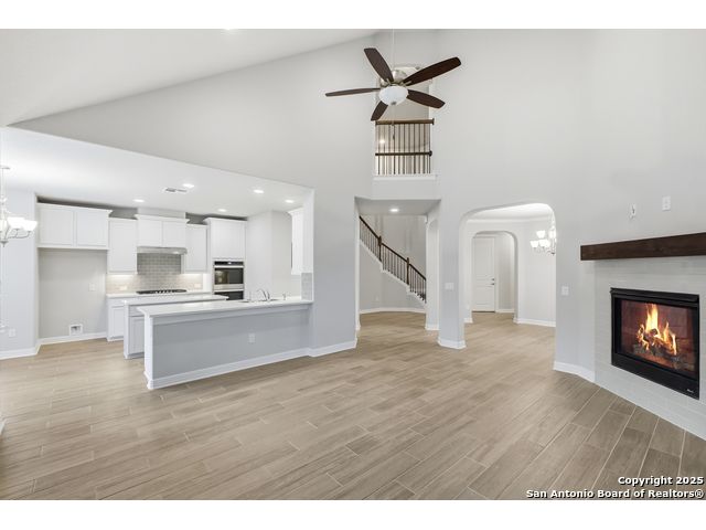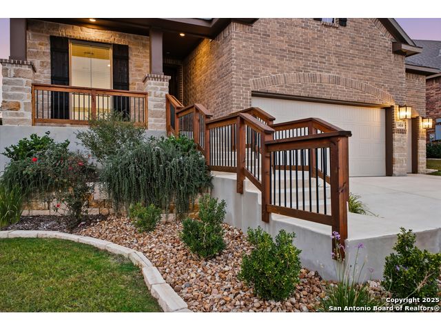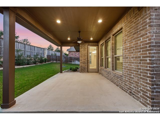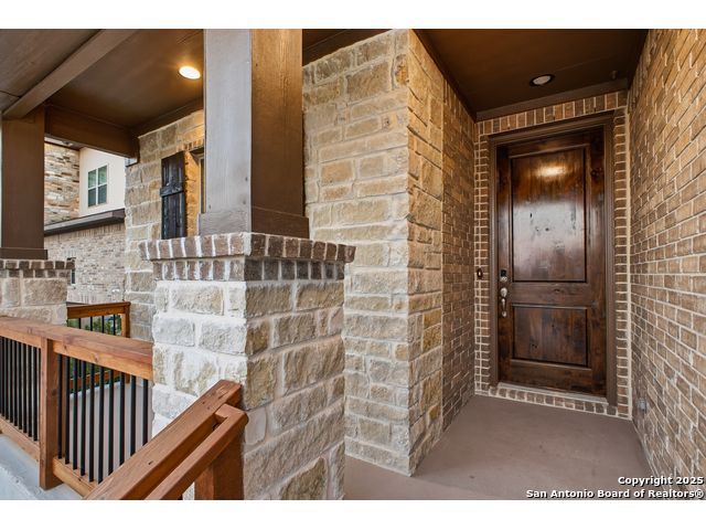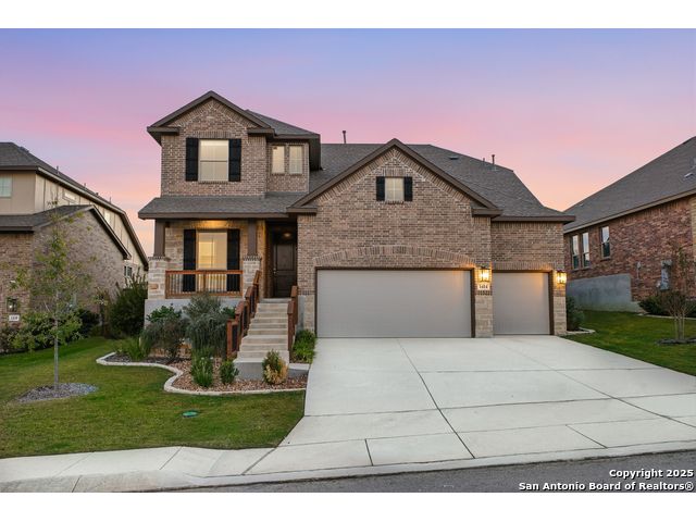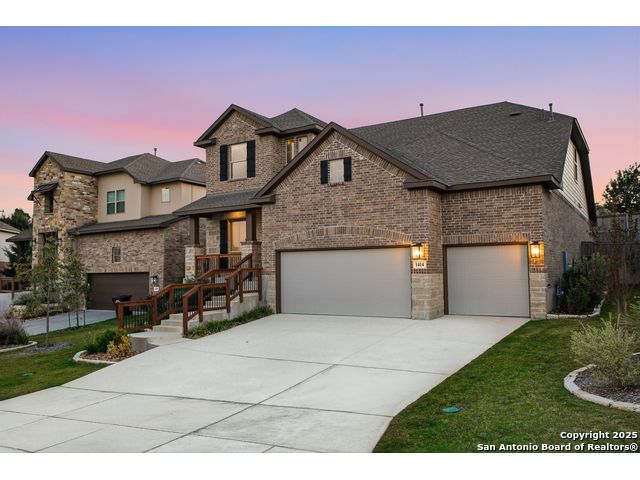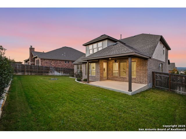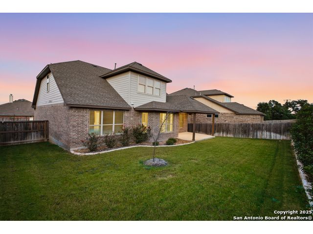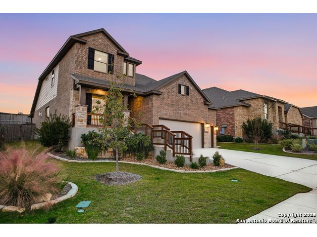 Stunning new construction by Sitterle Homes, perfectly positioned on a 0.17-acre lot within the exclusive gated community of Sunday Creek at Kinder Ranch. This sophisticated two-story Patterson floor plan offers 4 bedrooms, 3 full baths, 1 half bath, a 3-car garage, and 2,909 sq ft of thoughtfully curated living space backing to no rear neighbors. Elevated design elements include soaring ceilings, abundant natural light, and wood-look ceramic tile flooring extending through the main living areas, dining room, study, and laundry. An elegant foyer with arched openings and crown-trimmed formal dining leads into the expansive great room, where a dramatic vaulted ceiling, gas fireplace, and wall of windows create an inviting atmosphere ideal for both everyday living and elevated entertaining. The gourmet kitchen showcases white cabinetry, granite countertops, stainless steel appliances, a gas cooktop with vent hood, dual built-in ovens, built-in microwave, tile backsplash, an oversized center island, additional prep island, breakfast bar seating, and a sunlit breakfast area overlooking the backyard. The downstairs primary suite features a tranquil retreat with a tray ceiling, soft carpeting, and a luxurious bath offering an oversized walk-in shower with rainfall head, dual vanity, private toilet room, and a spacious walk-in closet. Upstairs includes a generous game room, two secondary bedrooms served by a full hallway bath, and a fourth bedroom featuring its own private full bathroom. The upstairs hallway highlights open railing overlooking the staircase and foyer, adding architectural depth and a sense of openness. Outdoor living is enhanced by an extended covered patio and a beautifully landscaped yard offering a private setting with generous space to relax or entertain. Additional features include a full irrigation system and plumbing for a water softener. Nestled within the master-planned Kinder Ranch community, residents enjoy gated access, highly acclaimed Comal ISD schools with on-site K-12 campuses, a Jr. Olympic swimming pool, multi-acre nature preserve, scenic walking and biking trails, and a community playground. This prime North San Antonio location provides effortless access to Hwy 281, Hwy 46, Loop 1604, premier Stone Oak dining and shopping, Timberwood Park, Canyon Lake, Guadalupe State Park, top medical facilities including Methodist Stone Oak Hospital, and a convenient commute to Camp Bullis and Randolph AFB. Built with Sitterle's renowned craftsmanship, this exceptional home blends modern luxury, timeless finishes, and refined living in one of the area's most desirable communities.