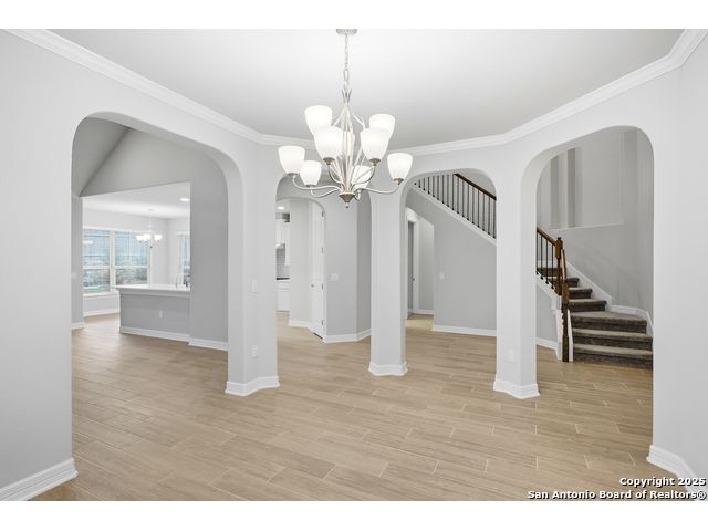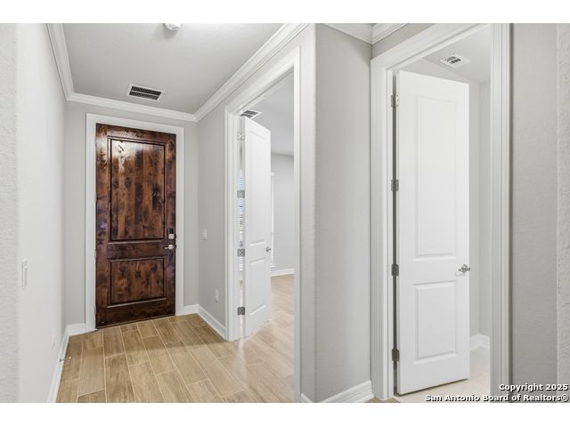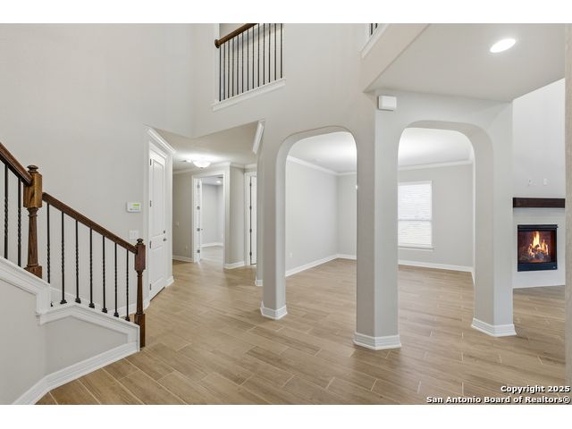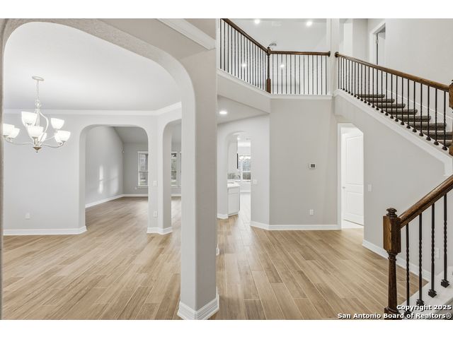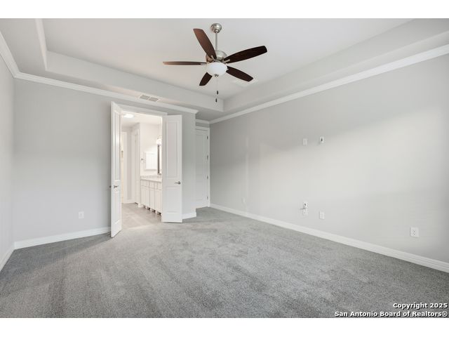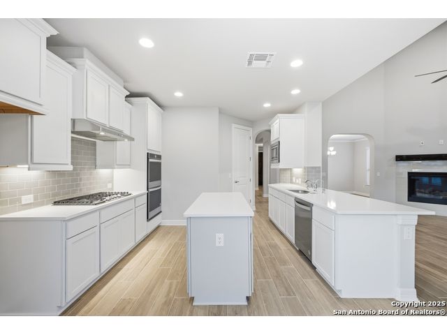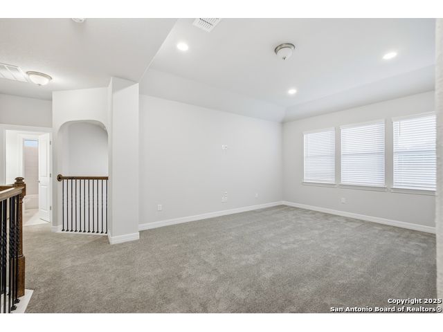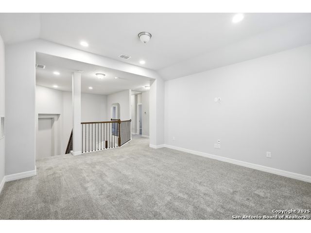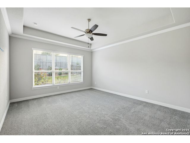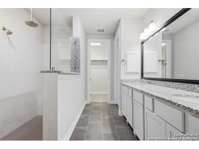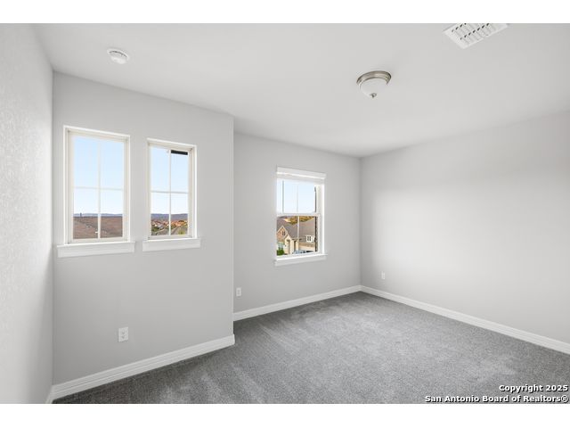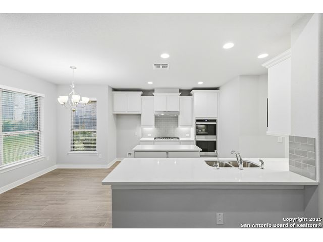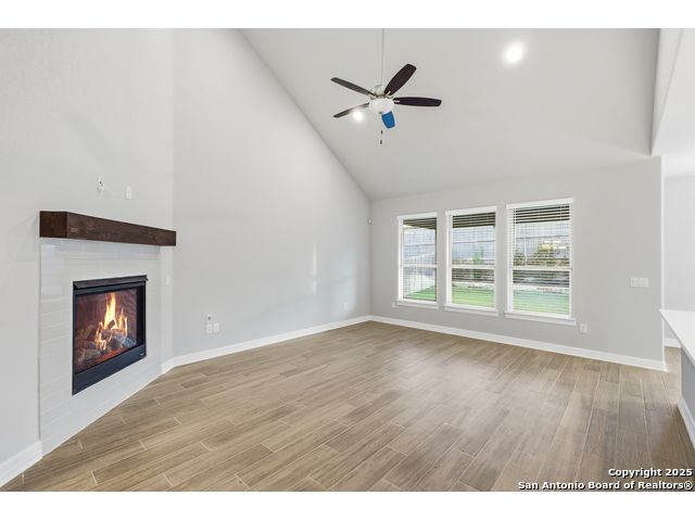 Stunning new construction by Sitterle Homes, perfectly positioned on a 0.17-acre lot within the exclusive gated community of Sunday Creek at Kinder Ranch. This sophisticated two-story Patterson floor plan offers 4 bedrooms, 3 full baths, 1 half bath, a 3-car garage, and 2,909 sq ft of thoughtfully curated living space backing to no rear neighbors. Elevated design elements include soaring ceilings, abundant natural light, and wood-look ceramic tile flooring extending through the main living areas, dining room, study, and laundry. An elegant foyer with arched openings and crown-trimmed formal dining leads into the expansive great room, where a dramatic vaulted ceiling, gas fireplace, and wall of windows create an inviting atmosphere ideal for both everyday living and elevated entertaining. The gourmet kitchen showcases white cabinetry, granite countertops, stainless steel appliances, a gas cooktop with vent hood, dual built-in ovens, built-in microwave, tile backsplash, an oversized center island, additional prep island, breakfast bar seating, and a sunlit breakfast area overlooking the backyard. The downstairs primary suite features a tranquil retreat with a tray ceiling, soft carpeting, and a luxurious bath offering an oversized walk-in shower with rainfall head, dual vanity, private toilet room, and a spacious walk-in closet. Upstairs includes a generous game room, two secondary bedrooms served by a full hallway bath, and a fourth bedroom featuring its own private full bathroom. The upstairs hallway highlights open railing overlooking the staircase and foyer, adding architectural depth and a sense of openness. Outdoor living is enhanced by an extended covered patio and a beautifully landscaped yard offering a private setting with generous space to relax or entertain. Additional features include a full irrigation system and plumbing for a water softener. Nestled within the master-planned Kinder Ranch community, residents enjoy gated access, highly acclaimed Comal ISD schools with on-site K-12 campuses, a Jr. Olympic swimming pool, multi-acre nature preserve, scenic walking and biking trails, and a community playground. This prime North San Antonio location provides effortless access to Hwy 281, Hwy 46, Loop 1604, premier Stone Oak dining and shopping, Timberwood Park, Canyon Lake, Guadalupe State Park, top medical facilities including Methodist Stone Oak Hospital, and a convenient commute to Camp Bullis and Randolph AFB. Built with Sitterle's renowned craftsmanship, this exceptional home blends modern luxury, timeless finishes, and refined living in one of the area's most desirable communities.