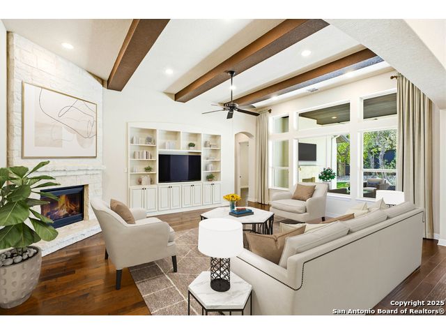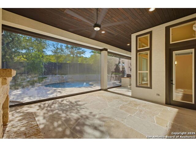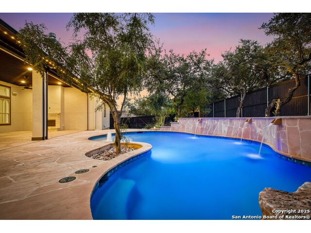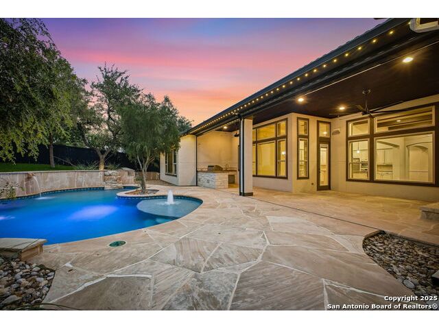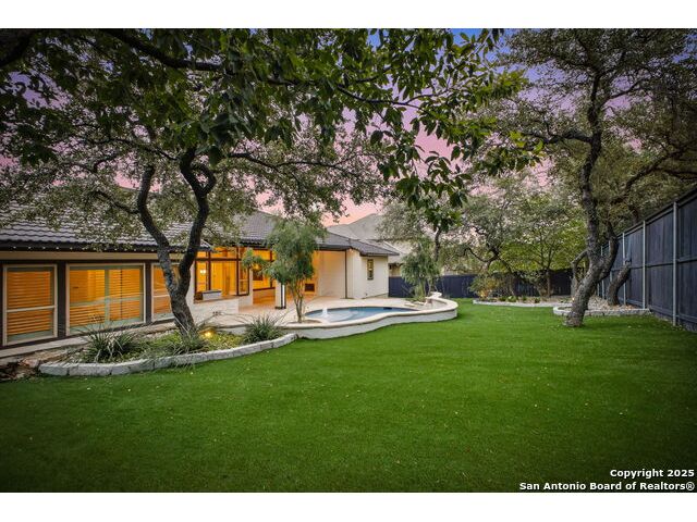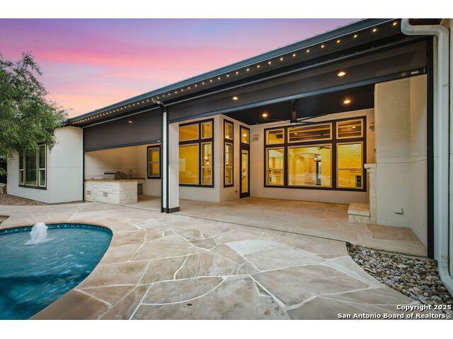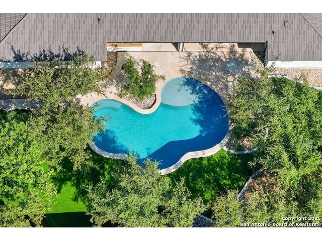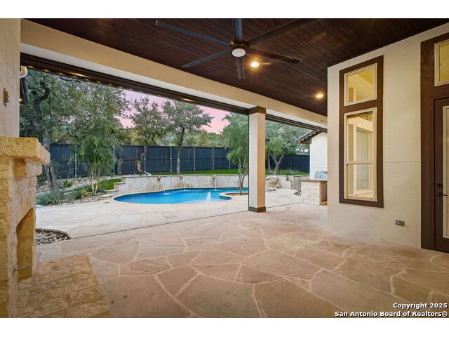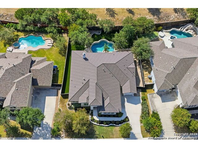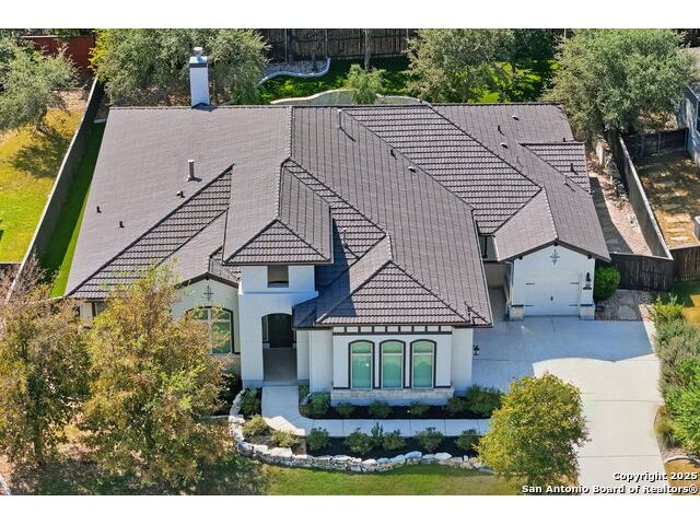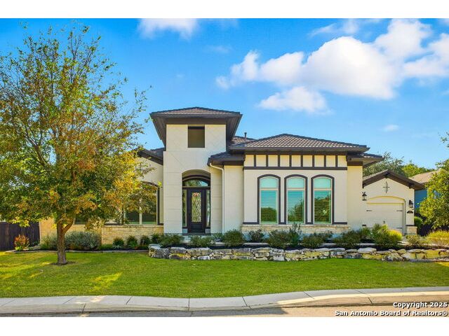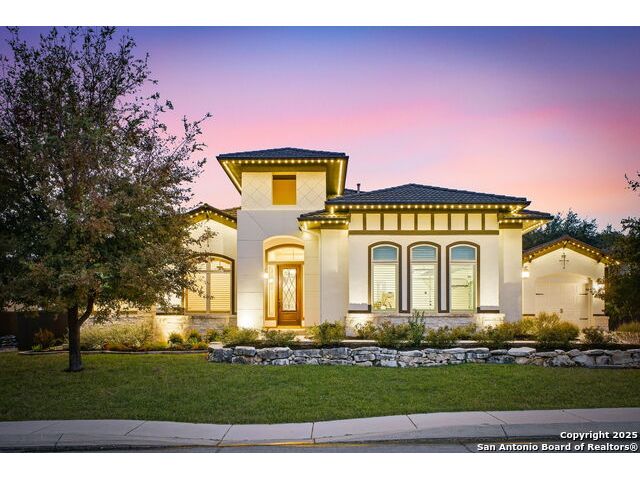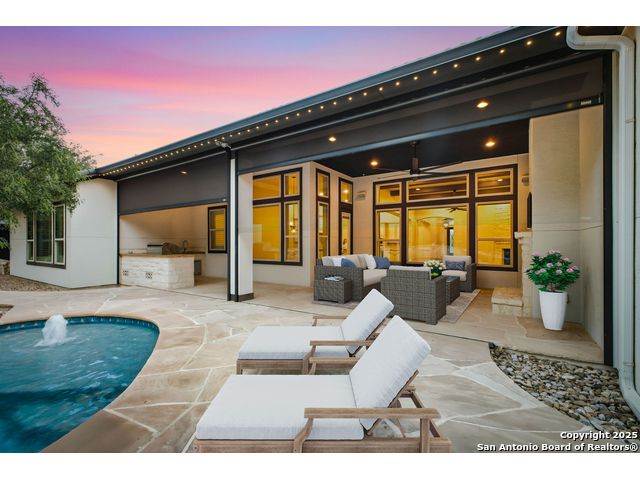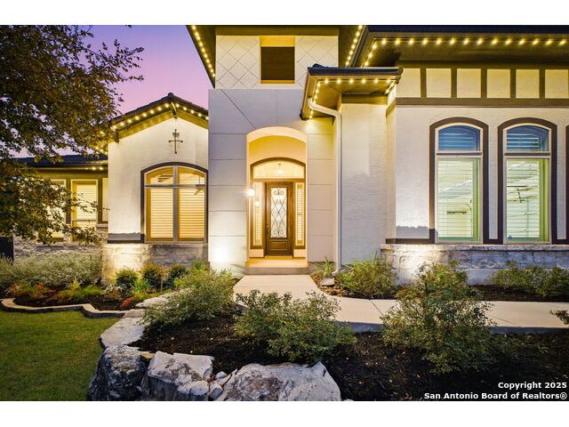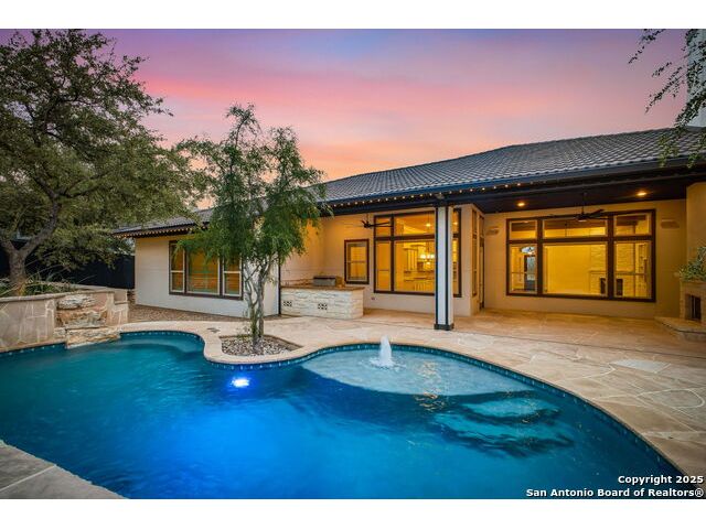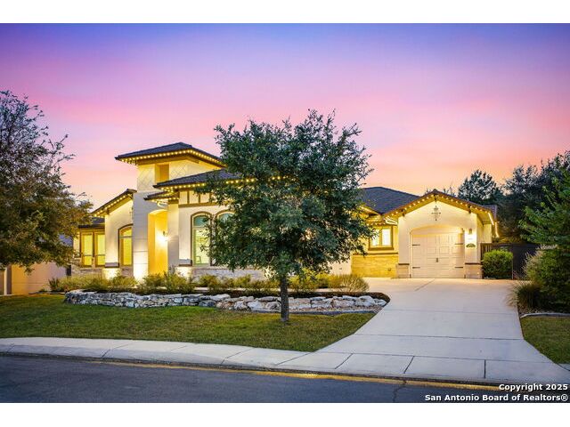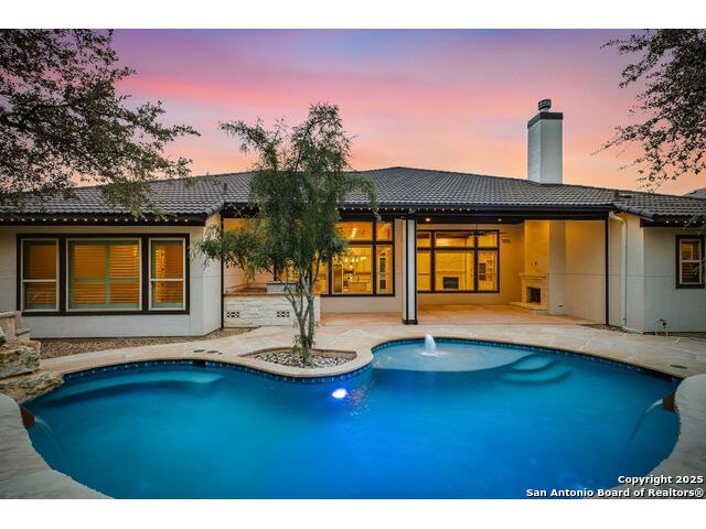 Situated on a majestic .32-acre private lot in the exclusive "Shavano Highlands" community, this one story elegantly designed residence offers a refined balance of luxury and comfort. Drive up to the stunning curb appeal with lush landscape, stucco exterior & Boral steel roof boasts elegant curb appeal. The thoughtful flowing layout showcases superior craftsmanship throughout, with wood/tile floors, plantation shutters, open floorplan, windows galore allowing natural light to flow through and detailed custom architectural elements at every turn. The chef's kitchen features stainless steel appliances, ample built-in cabinetry, gas stove/range perfect for both everyday living and entertaining. The primary suite is split from the other bedrooms & offers a serene retreat with a spa-inspired bathroom and 2 spacious walk-in closets. Walk out to an entertainers dream back yard with a huge covered patio, outdoor fireplace & kitchen w gas grill, stunning pool, low maintenance artificial turf & a generator for backup power. You will never want to leave home! This home is a very rare find in a rare community and won't last long so come and see it today!