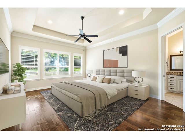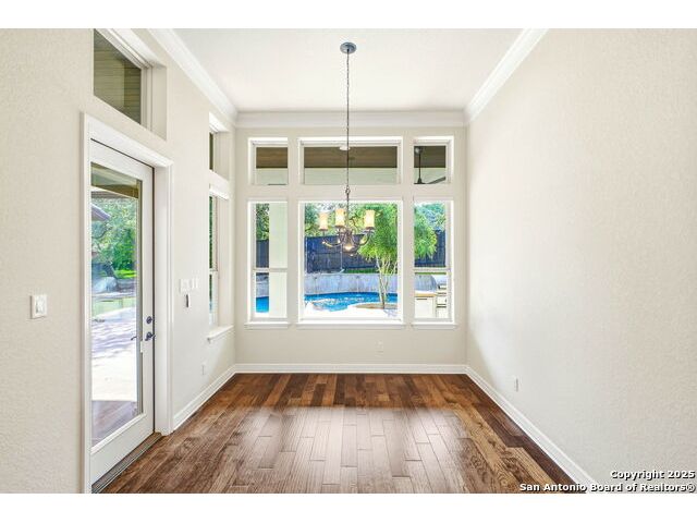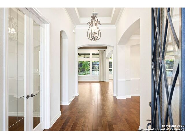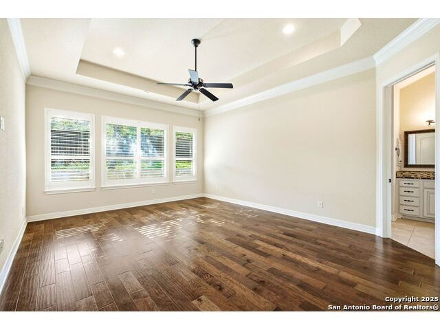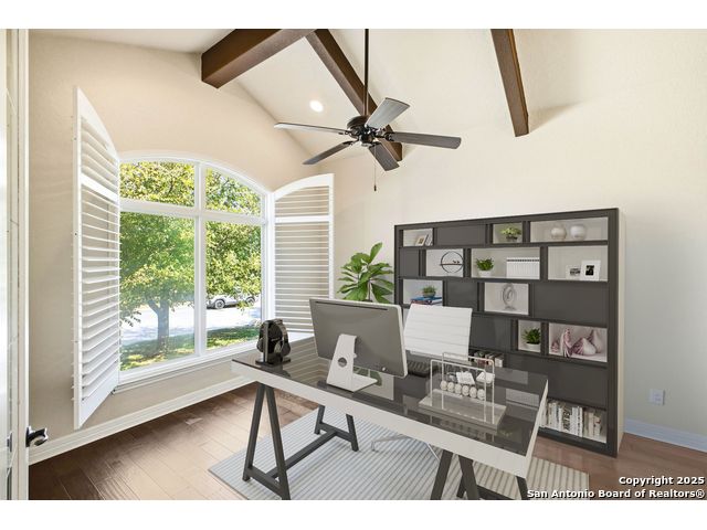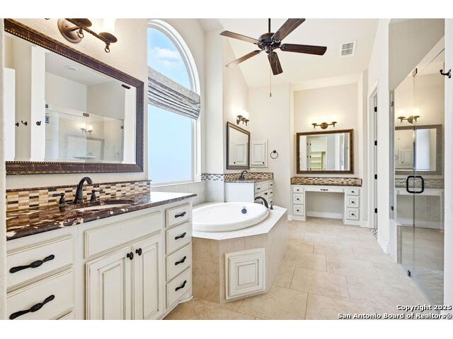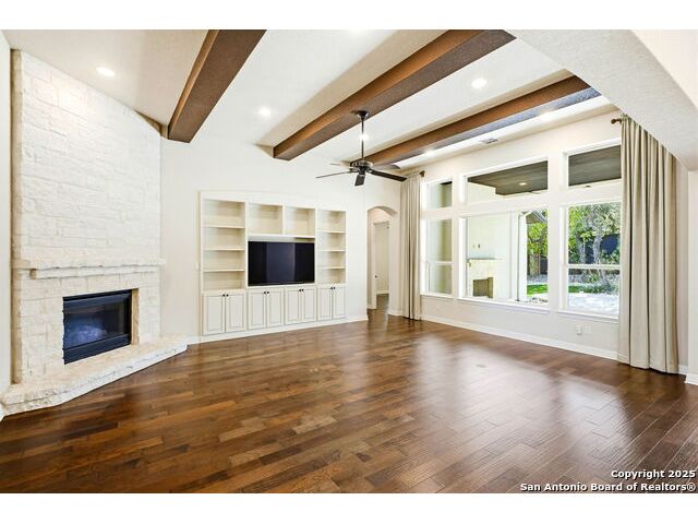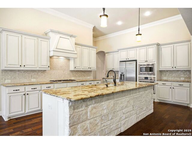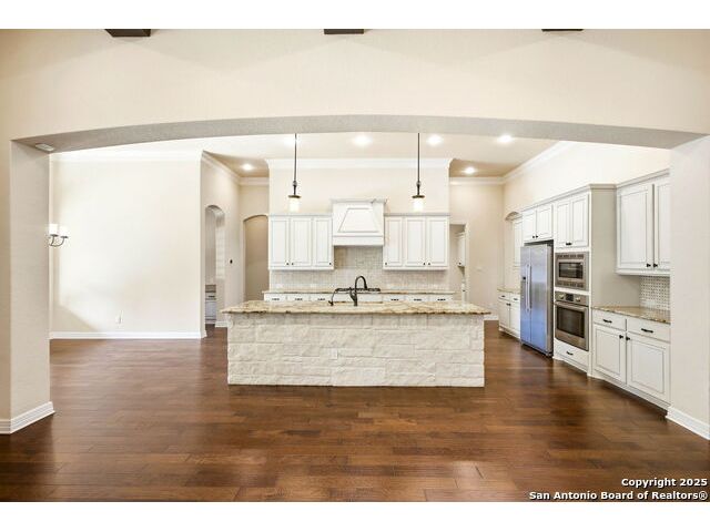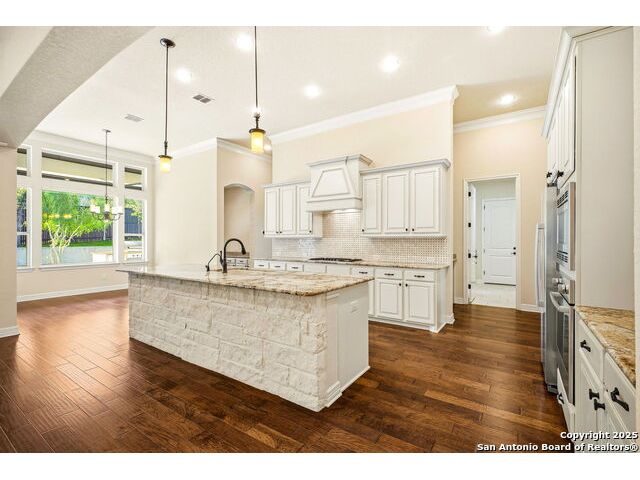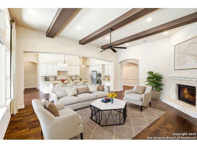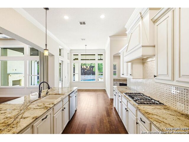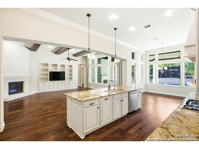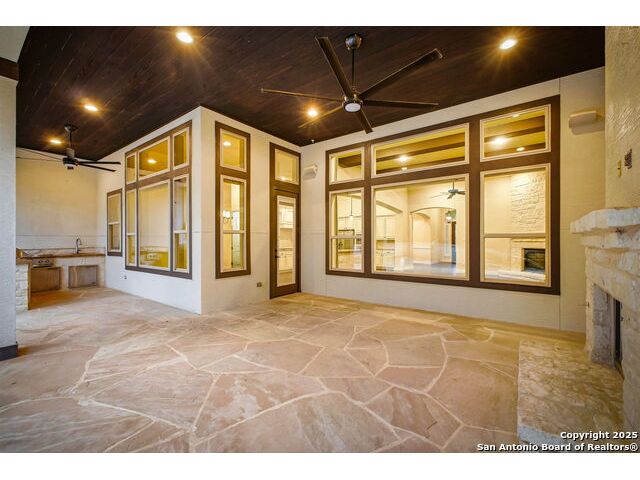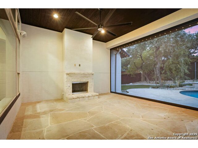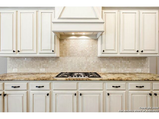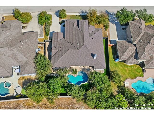 Situated on a majestic .32-acre private lot in the exclusive "Shavano Highlands" community, this one story elegantly designed residence offers a refined balance of luxury and comfort. Drive up to the stunning curb appeal with lush landscape, stucco exterior & Boral steel roof boasts elegant curb appeal. The thoughtful flowing layout showcases superior craftsmanship throughout, with wood/tile floors, plantation shutters, open floorplan, windows galore allowing natural light to flow through and detailed custom architectural elements at every turn. The chef's kitchen features stainless steel appliances, ample built-in cabinetry, gas stove/range perfect for both everyday living and entertaining. The primary suite is split from the other bedrooms & offers a serene retreat with a spa-inspired bathroom and 2 spacious walk-in closets. Walk out to an entertainers dream back yard with a huge covered patio, outdoor fireplace & kitchen w gas grill, stunning pool, low maintenance artificial turf & a generator for backup power. You will never want to leave home! This home is a very rare find in a rare community and won't last long so come and see it today!