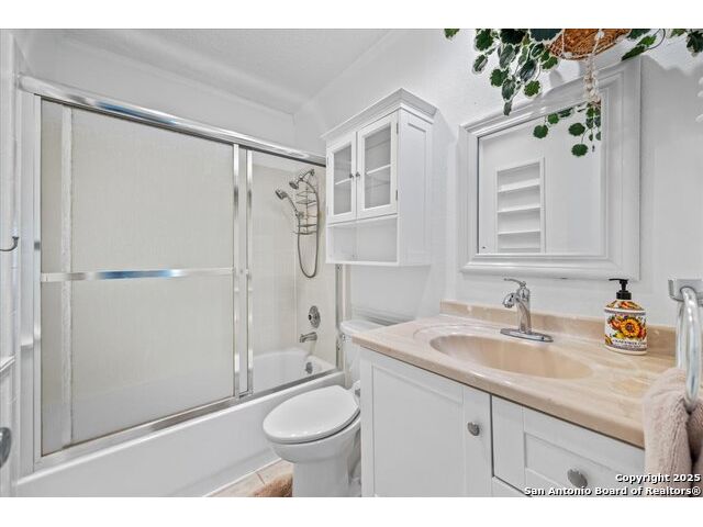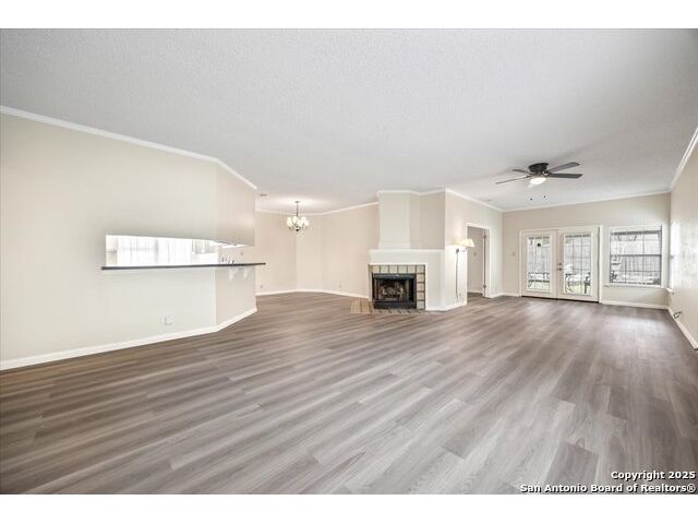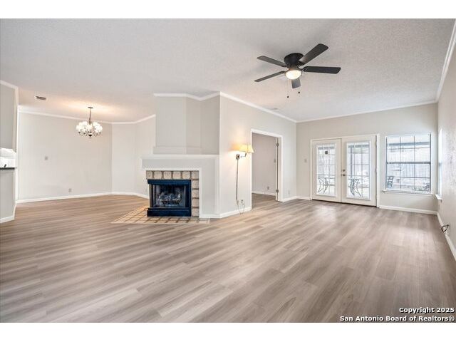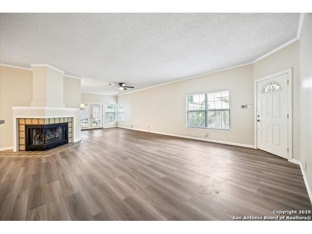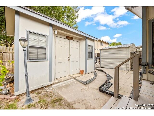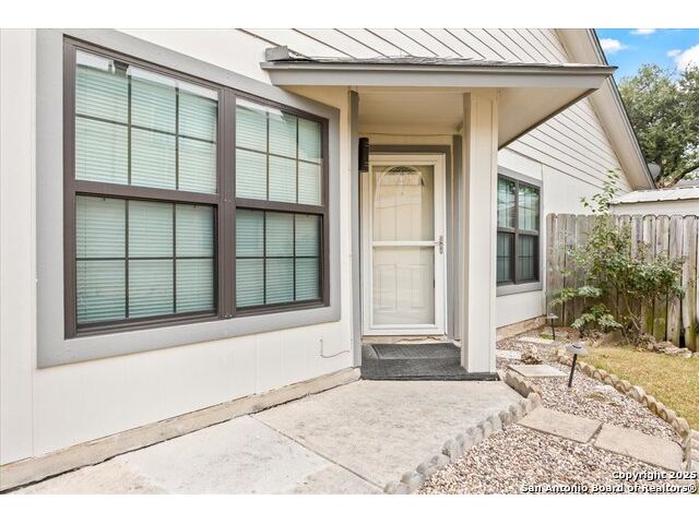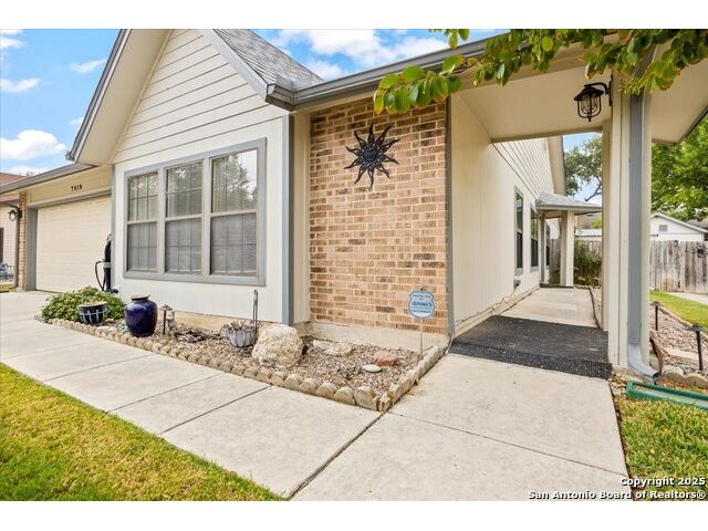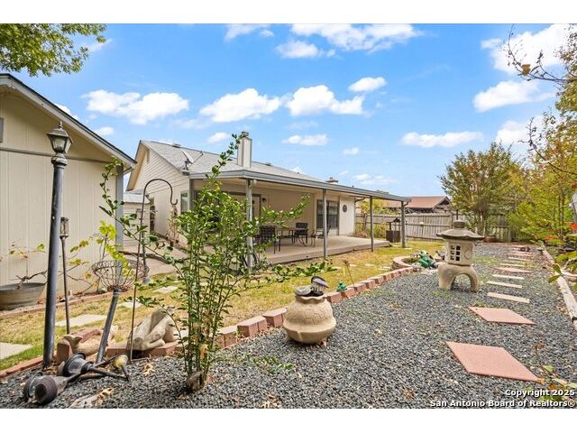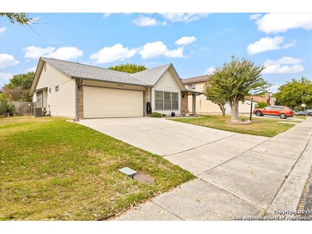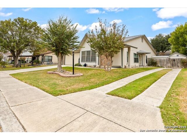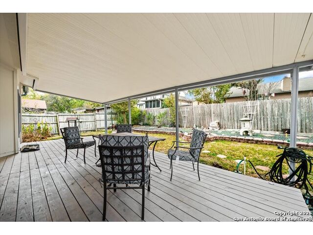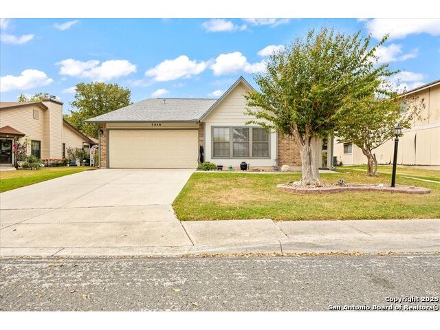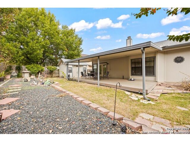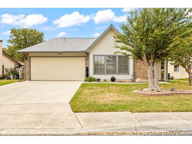 Discover comfort and convenience at 7019 Elk Trail Drive, a well-designed 4-bedroom, 2-bath home with a split floorplan and open living spaces. The large living room features LVP flooring and a corner fireplace shared with the dining room, creating a warm, connected atmosphere. The kitchen opens seamlessly to the dining and living areas and includes a built-in microwave, smooth cooktop, and stacked white subway tile backsplash, with a tucked-away breakfast nook offering extra cabinetry and counter space. A spacious laundry room with natural light and additional storage enhances daily functionality. Tile flooring extends through the kitchen, laundry, and bathrooms, while secondary bedrooms feature soft carpet. Double French doors lead to a generous covered deck perfect for outdoor living. An additional driveway provides extra parking, and a powered storage shed adds valuable utility. Located in the established Ventura subdivision, this home is surrounded by mature trees and offers quick access to Loop 410, Loop 1604, I-10, and I-35, with grocery stores, restaurants, and shopping just minutes away.