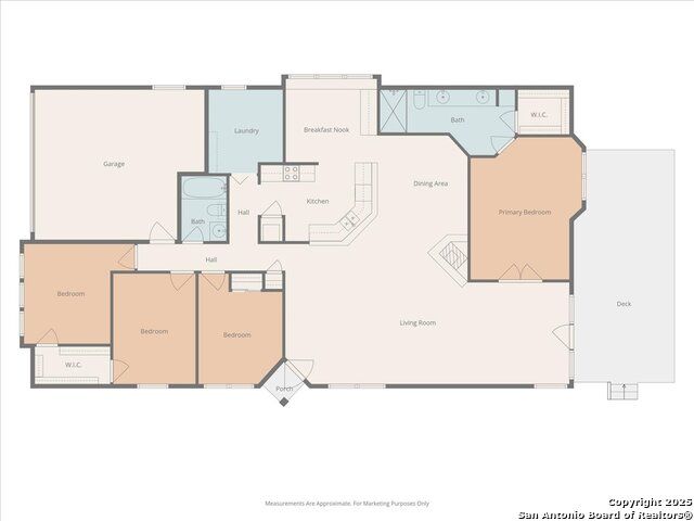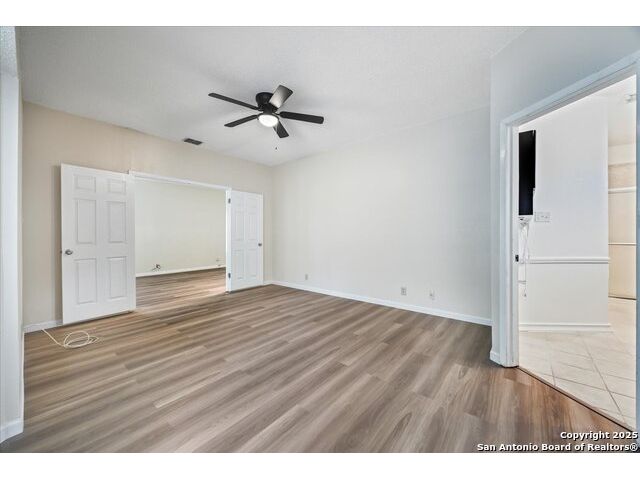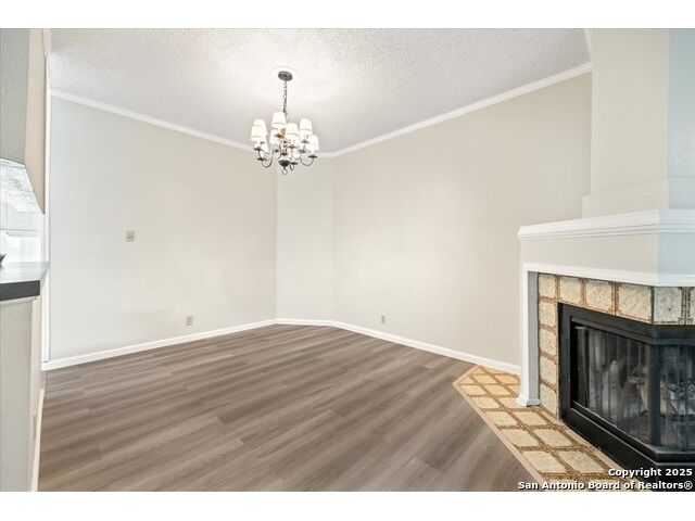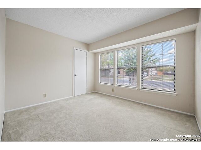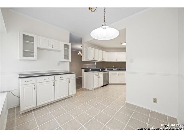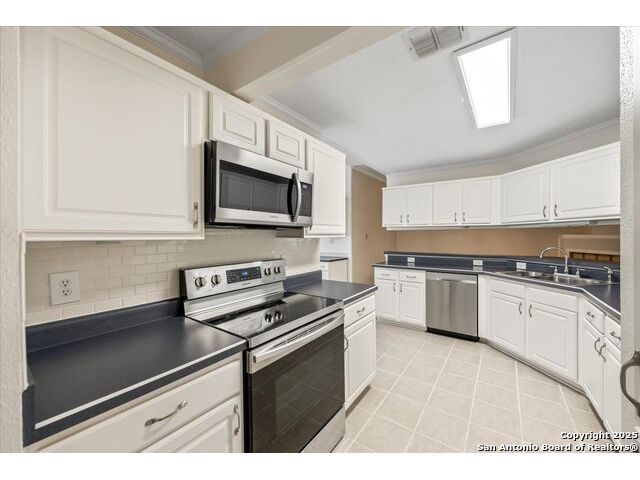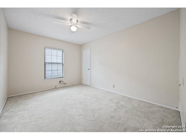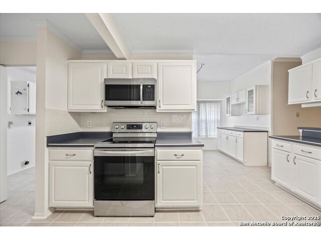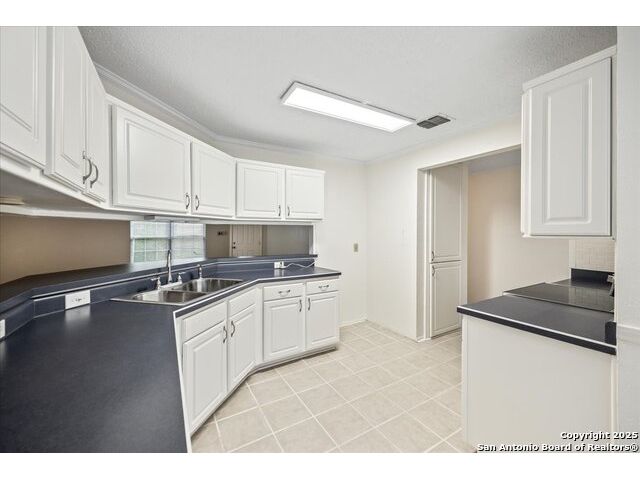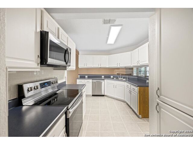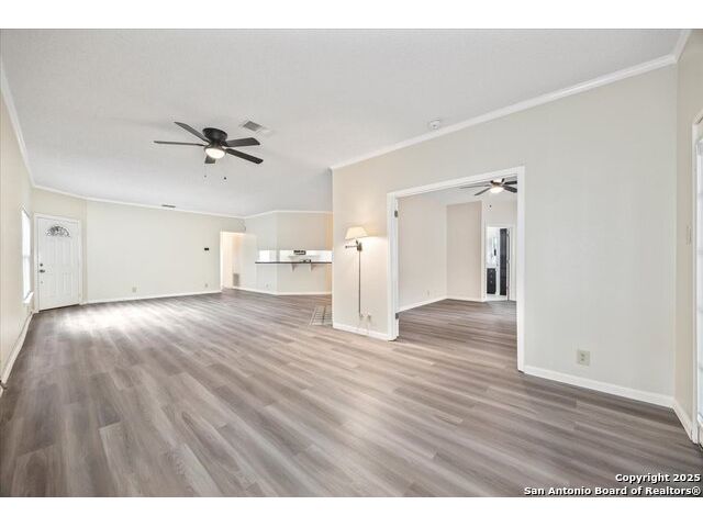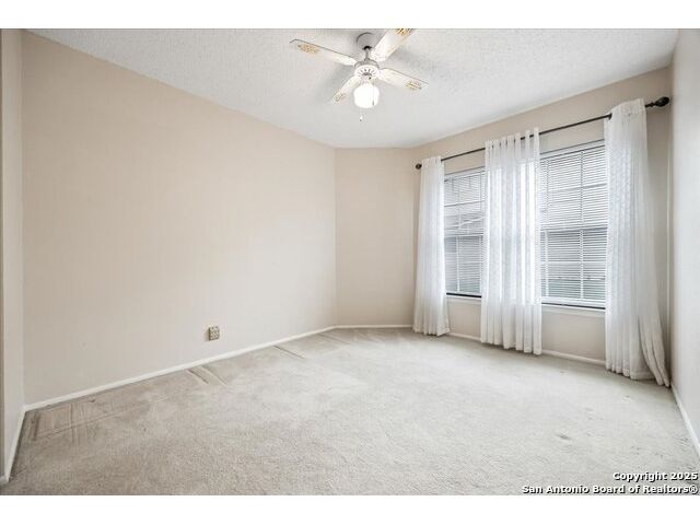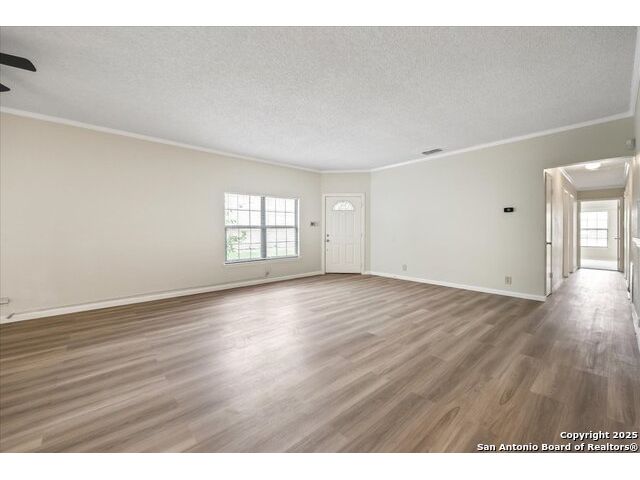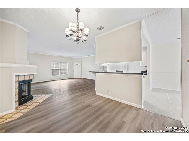 Discover comfort and convenience at 7019 Elk Trail Drive, a well-designed 4-bedroom, 2-bath home with a split floorplan and open living spaces. The large living room features LVP flooring and a corner fireplace shared with the dining room, creating a warm, connected atmosphere. The kitchen opens seamlessly to the dining and living areas and includes a built-in microwave, smooth cooktop, and stacked white subway tile backsplash, with a tucked-away breakfast nook offering extra cabinetry and counter space. A spacious laundry room with natural light and additional storage enhances daily functionality. Tile flooring extends through the kitchen, laundry, and bathrooms, while secondary bedrooms feature soft carpet. Double French doors lead to a generous covered deck perfect for outdoor living. An additional driveway provides extra parking, and a powered storage shed adds valuable utility. Located in the established Ventura subdivision, this home is surrounded by mature trees and offers quick access to Loop 410, Loop 1604, I-10, and I-35, with grocery stores, restaurants, and shopping just minutes away.