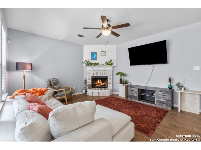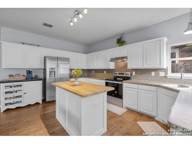 Welcome home to this inviting 3-bedroom, 2.5-bath property perfectly situated near the highly sought-after I-35 and Hwy 1604 corridor-just minutes from Randolph Air Force Base. From the moment you step inside, the natural light and airy feel set the tone. The open floor plan makes everyday living easy, with a spacious living area flowing right into the kitchen and a cozy breakfast nook overlooking the backyard. You'll find plenty of cabinet and counter space, plus a large butcher-block island that anchors the room beautifully. Upstairs, the bedrooms and bathrooms offer great space, including a spa-like owner's retreat featuring a separate shower and a generous garden tub-your own private getaway. The backyard is ideal for entertaining, complete with a privacy wood fence and lots of room for outdoor fun. All of this, just moments from The Forum shopping center, major highways, and local schools. Come see why this home checks all the boxes!