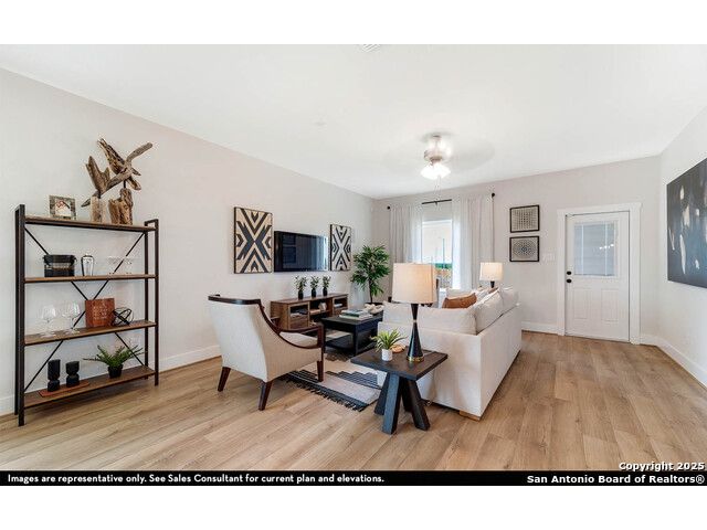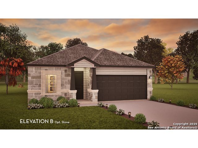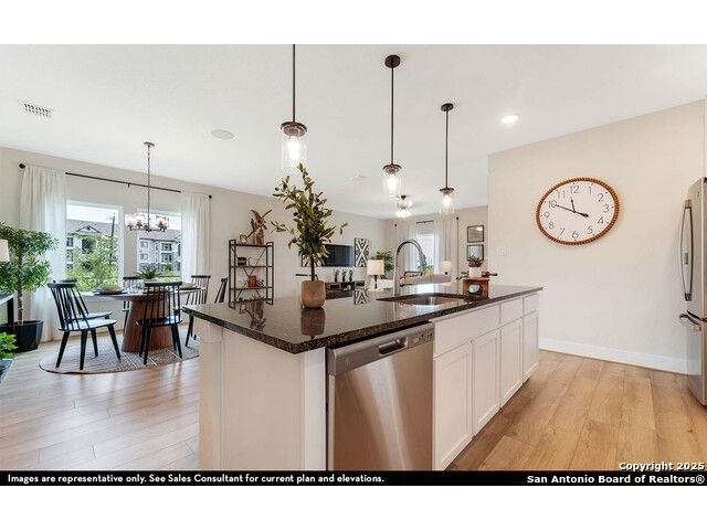 Come see our spacious and open Pedernales plan with 4 bedrooms and 2 baths. Inviting kitchen with large island, quartz countertops, 42" cabinets, and SS appliances. Separate dining area. Large family room leading to a wide backyard. Super shower in master bath with dual vanities and elongated commode. Very pretty stone elevation! Home has many more additional features such as 2.5 car garage with access to backyard, covered patio, front gutters, full sod, sprinkler system, and pre-plumb for water softener!