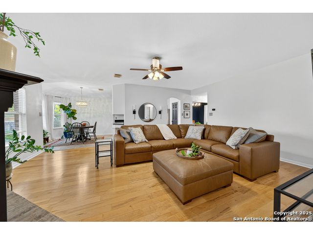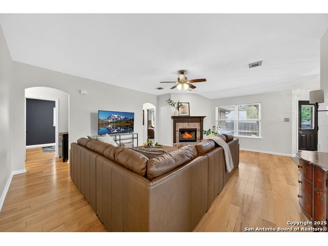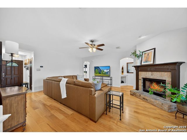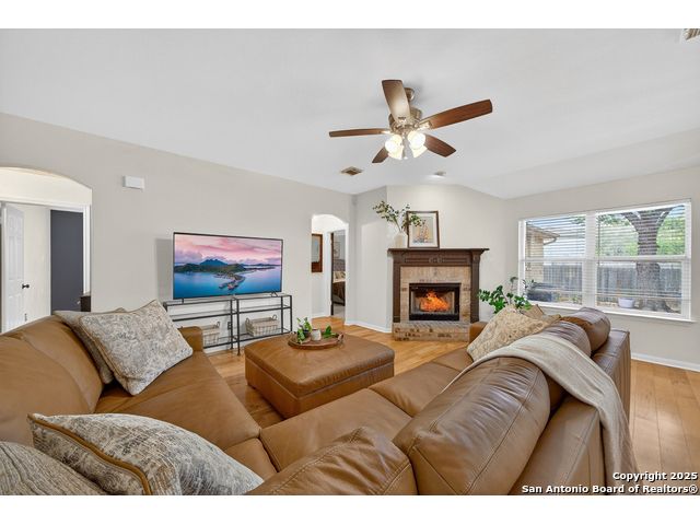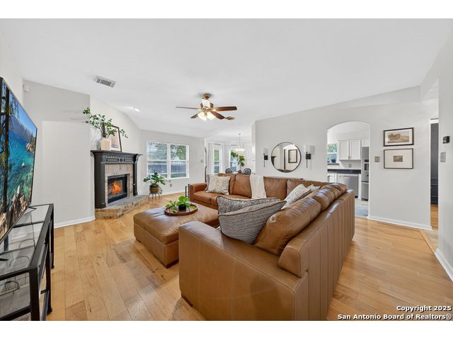 Welcome to this stunning single-story home in the highly sought-after, gated Finesilver Ranch. Immaculately maintained and offering 1,902 square feet, this 3-bedroom, 2-bath residence features an inviting open-concept layout ideal for both everyday living and effortless entertaining. Elegant wood flooring adds warmth and sophistication throughout, while the spacious living areas, including a cozy living room with a gas fireplace, provide the perfect setting to relax or host gatherings. Recent upgrades include a new HVAC system, offering enhanced comfort and efficiency year-round as well as a new garage door. Located in a prime area with convenient access to parks, shopping, dining, and everyday essentials, this home also offers an impressive list of neighborhood amenities such as a sparkling pool, clubhouse, walking trail, pickleball/basketball court, and playground. The low-maintenance, xeriscaped backyard provides a peaceful retreat without the upkeep. Don't miss your chance to own this exceptional home-it won't last long!