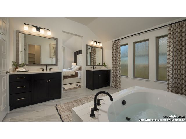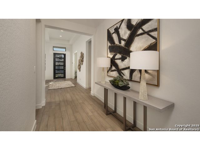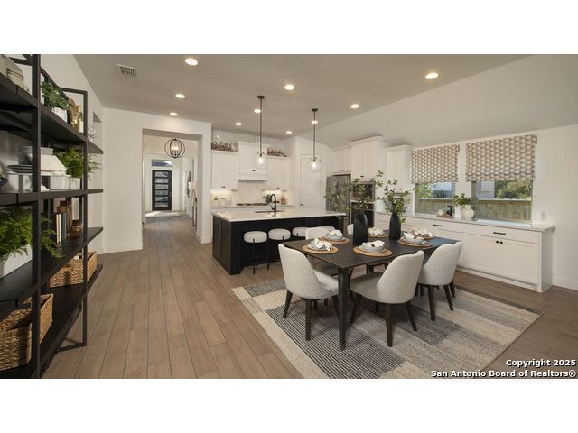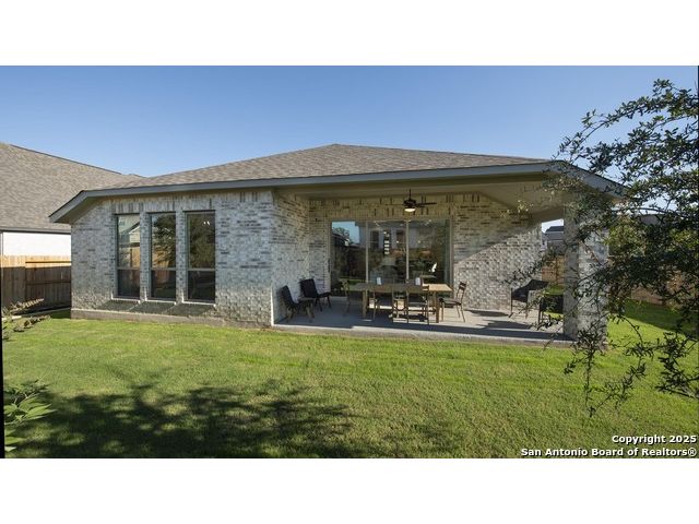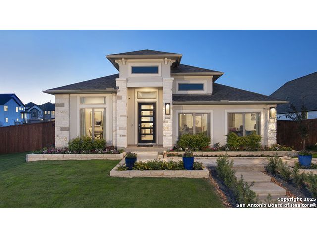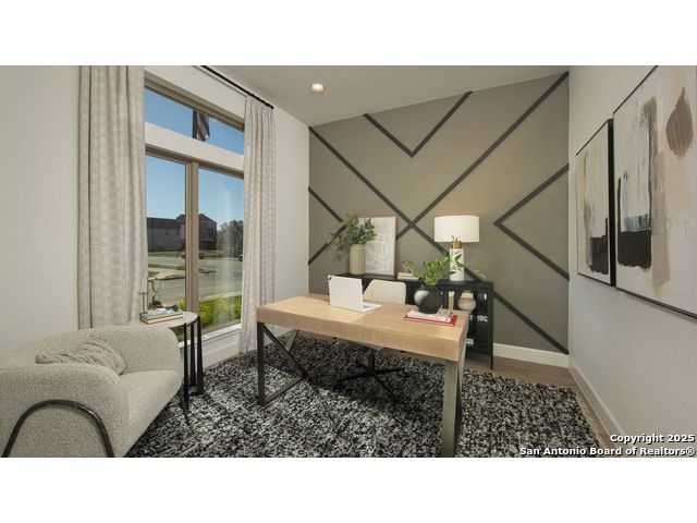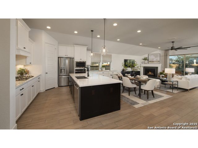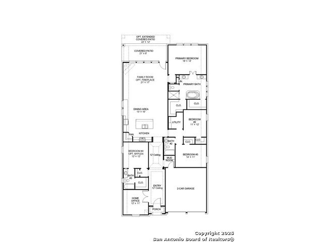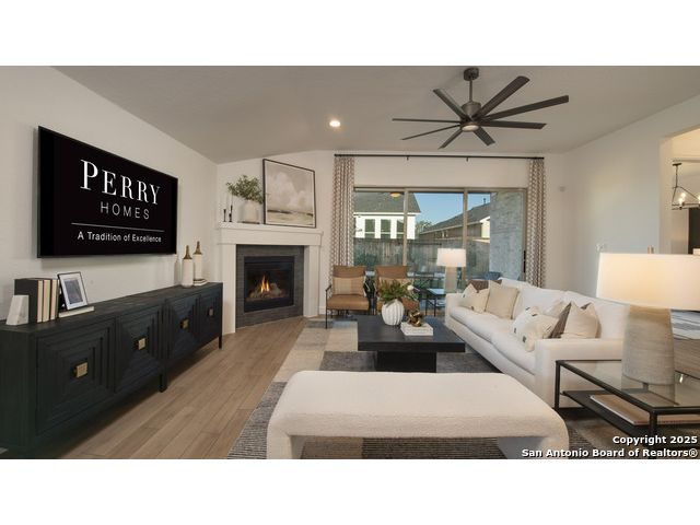 READY FOR MOVE-IN! Former Model Home. Home office with French doors set at entry with 12-foot ceiling. Extended entry leads to open kitchen, dining area and family room. Kitchen features corner walk-in pantry, a 5-burner gas cooktop, generous counter space and island with built-in seating space. Dining area flows into family room with a wood mantel fireplace and sliding glass door. Primary suite includes double-door entry to primary bath with dual vanities, garden tub, separate glass-enclosed shower and two large walk-in closets. A guest suite with private bath adds to this spacious one-story home. Model home upgrades include accent paint, drapes, alarm system, sprinkler system, and additional landscaping. Extended covered backyard patio. Mud room off two-car garage.