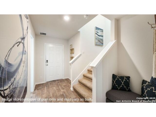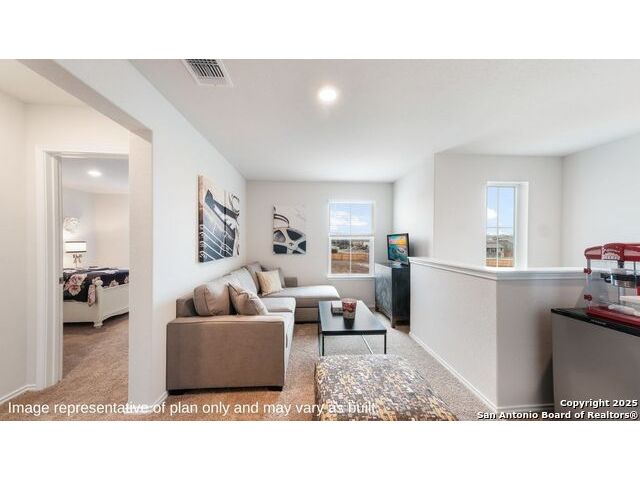 The Bowie plan is one of our two-story homes featured in our Riverstone at Westpointe community in San Antonio, TX. This new home layout offers 3 classic front exteriors, 4 bedrooms, 2.5 bathrooms, a 1-car garage and 1839 square feet of comfortable living. An inviting front porch invites you to step inside The Bowie where you will find a foyer opening to a combined living room, dining room and kitchen area. You'll enjoy preparing meals in your modern kitchen with stainless steel appliances, quartz countertops and shaker style cabinets. Spend time together gathered around the large kitchen island with plenty of workspace and room for bar seating. A spacious loft or game room is located at the top of the stairs, providing plenty of room for countless game nights or movie nights. You will also find all bedrooms and a second full bathroom upstairs. Located toward the back of the home, your primary bedroom features an attractive attached bathroom with a combined bathtub and shower, a single vanity sink with a spacious quartz countertop and a walk-in closet. Head back downstairs and find an under-the-stairs storage closet, a spacious laundry room and a covered patio (per plan) located off the back of the home, perfect for relaxing and enjoying your fully landscaped and irrigated yard. Additional features of The Bowie include sheet vinyl at entry, downstairs living areas and wet areas and quartz countertops and shaker style cabinetry throughout the home. This home includes our HOME IS CONNECTED base package. Using one central hub that talks to all the devices in your home, you can control the lights, thermostat and locks, all from your cellular device.